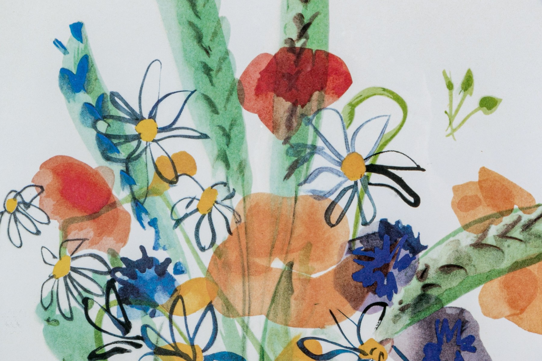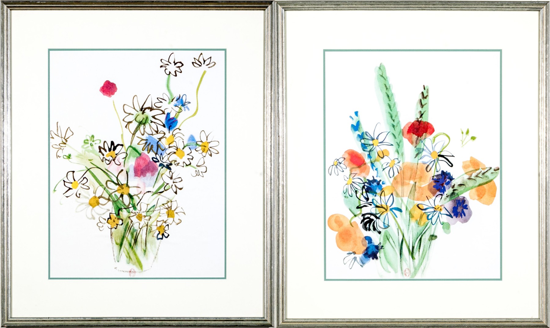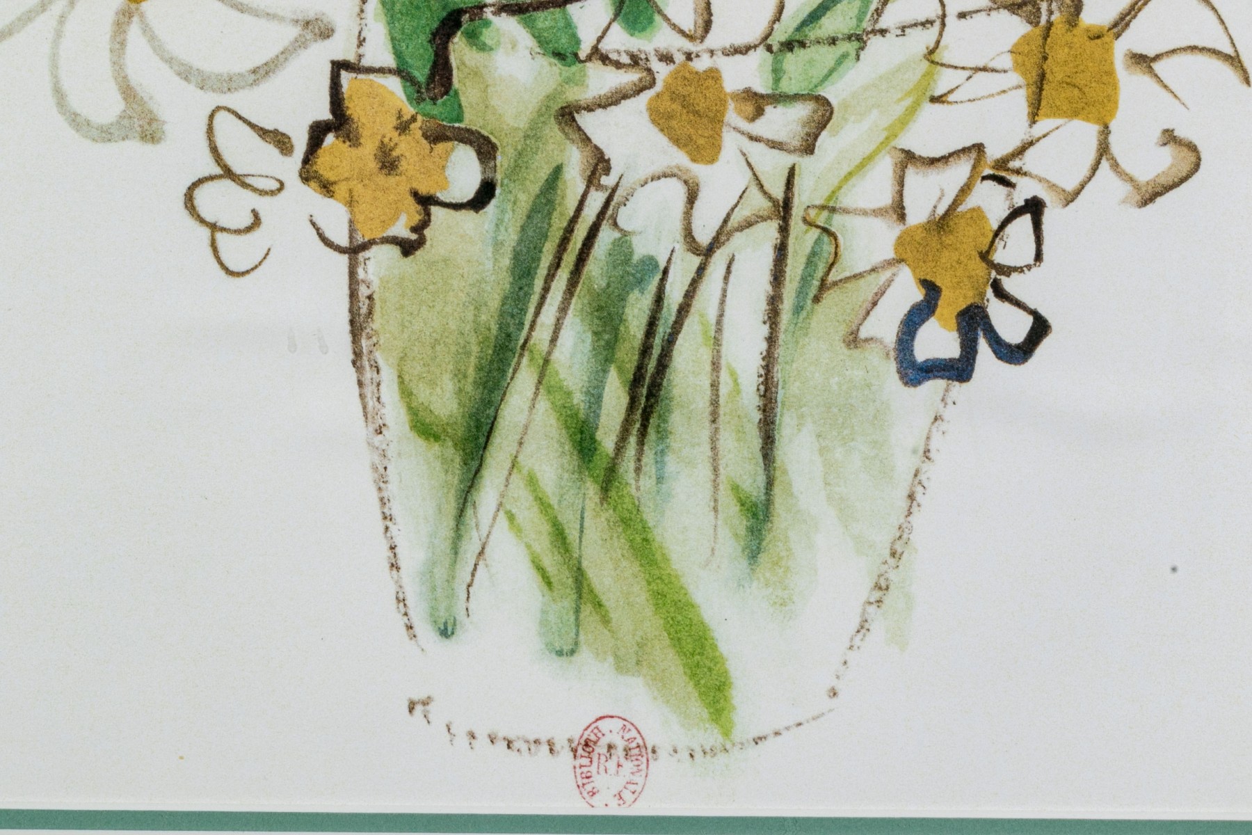 After Raoul Dufy (French, 1877-1953) "Bunch of daisies, Pour un Herbier, Colette" and "Bouquet, Pour un Herbier, Colette" prints produced by Bibliotheque Nationale depicting watercolor style bouquets of flowers rendered in vibrant color with gestural brushstrokes for a charming, easy aesthetic. Both stamped lower center.