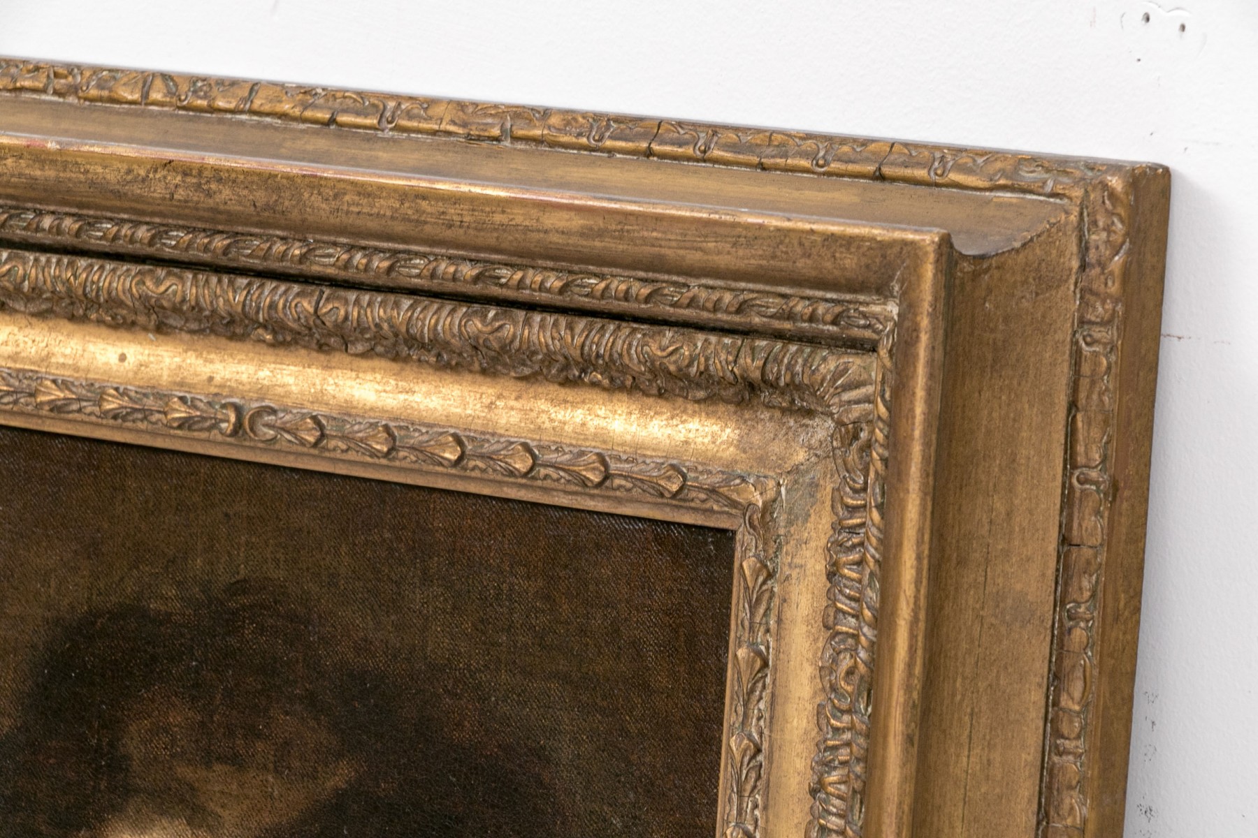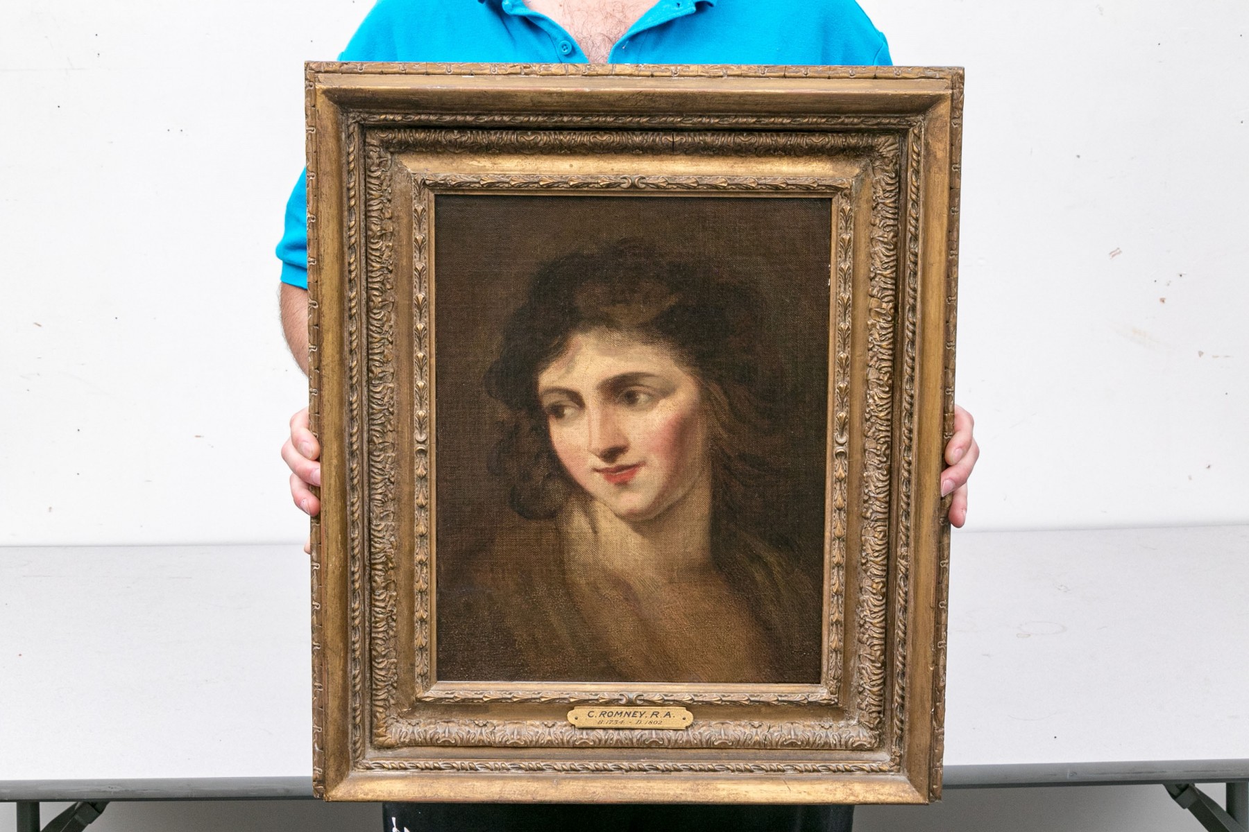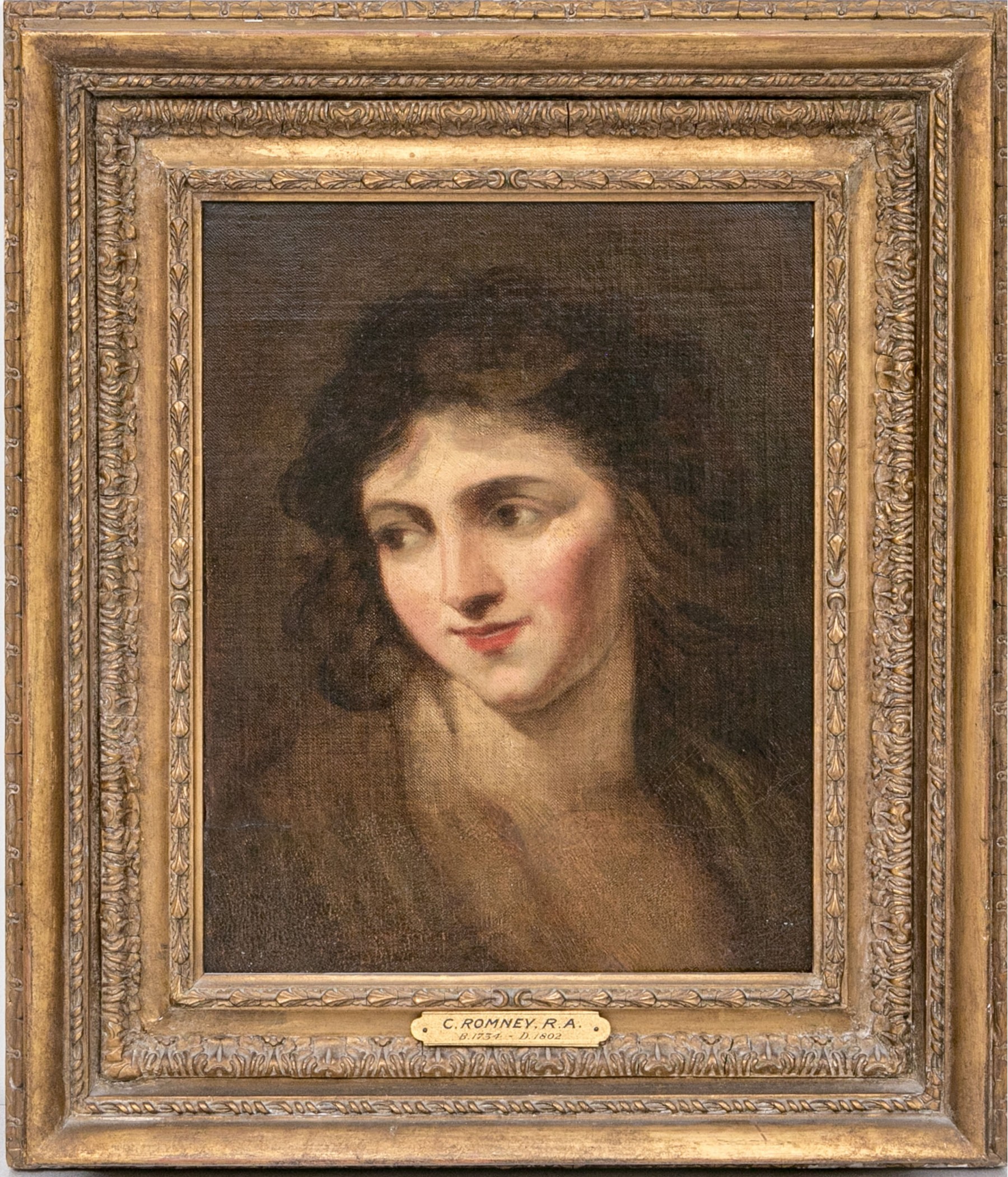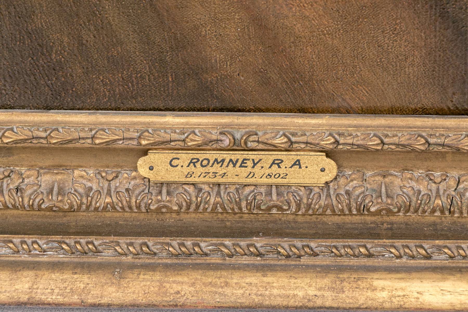Wonderfully painted and presented in an impressively carved and gilt finished wood frame bearing a brass name plaque denoting the artist, the work is after: "Romney, R.A. / B. 1734 - D. 1802).