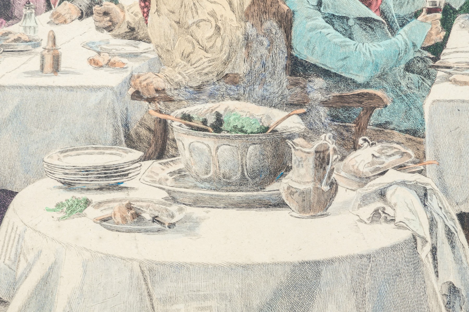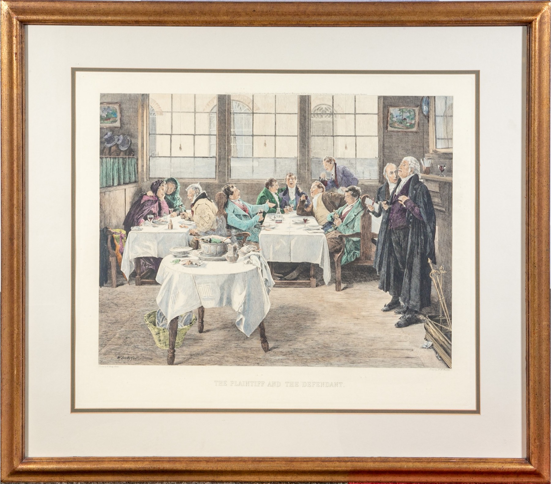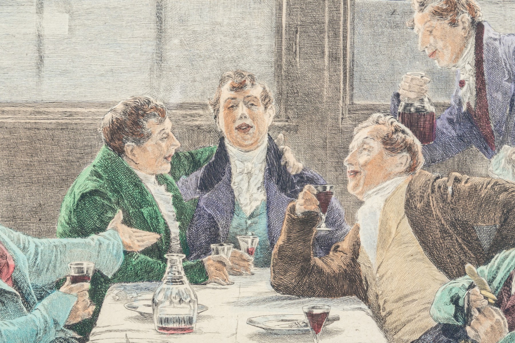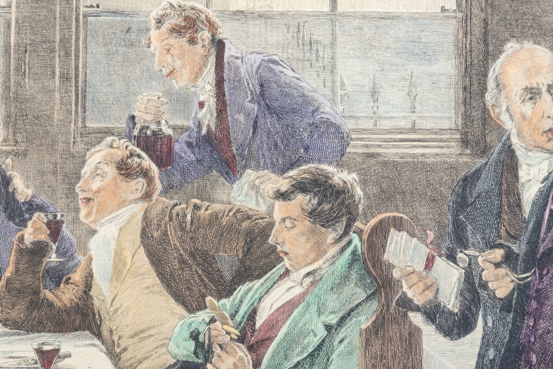 Signed in plate lower left. Title below. After a painting by the artist. An amusing genre scene with various figures enjoying lunch with the officials in discussion nearby. Presented in a gilt frame with glass.