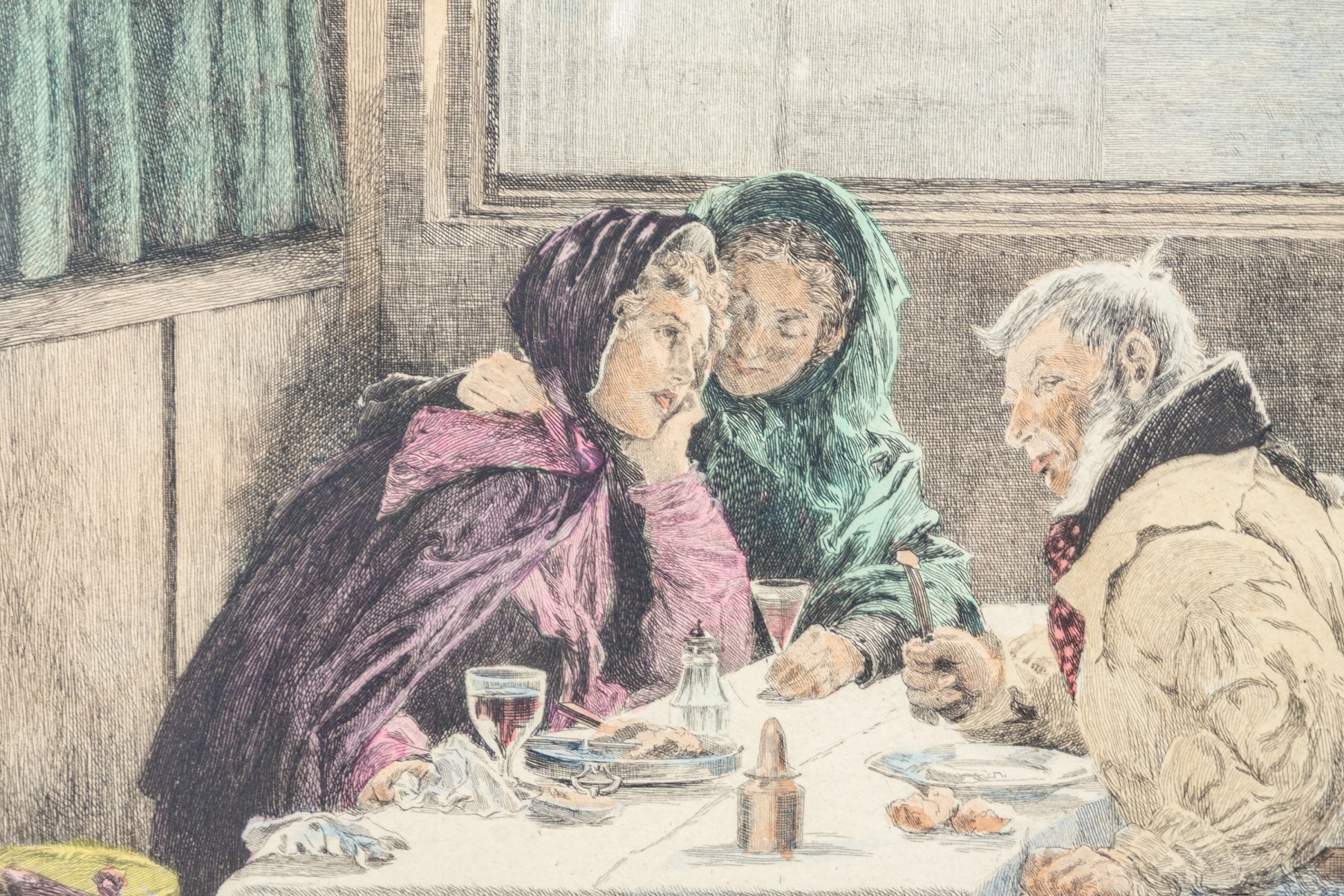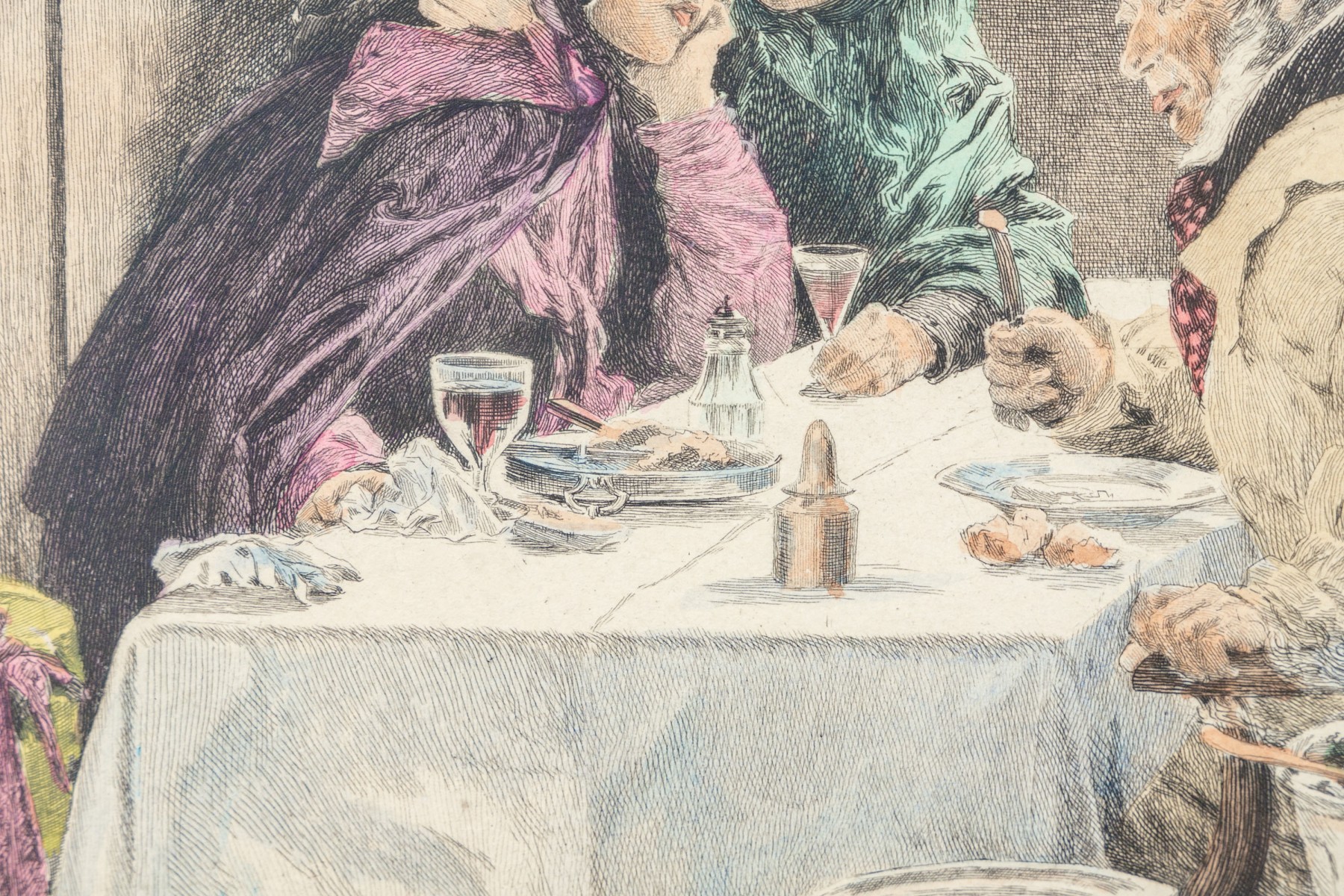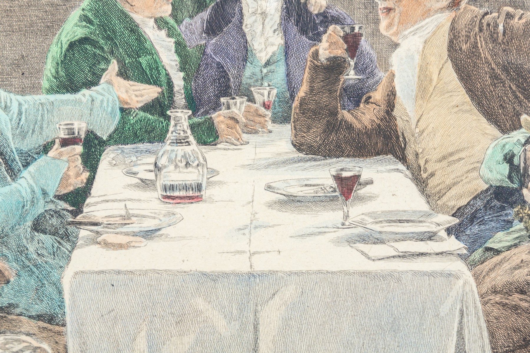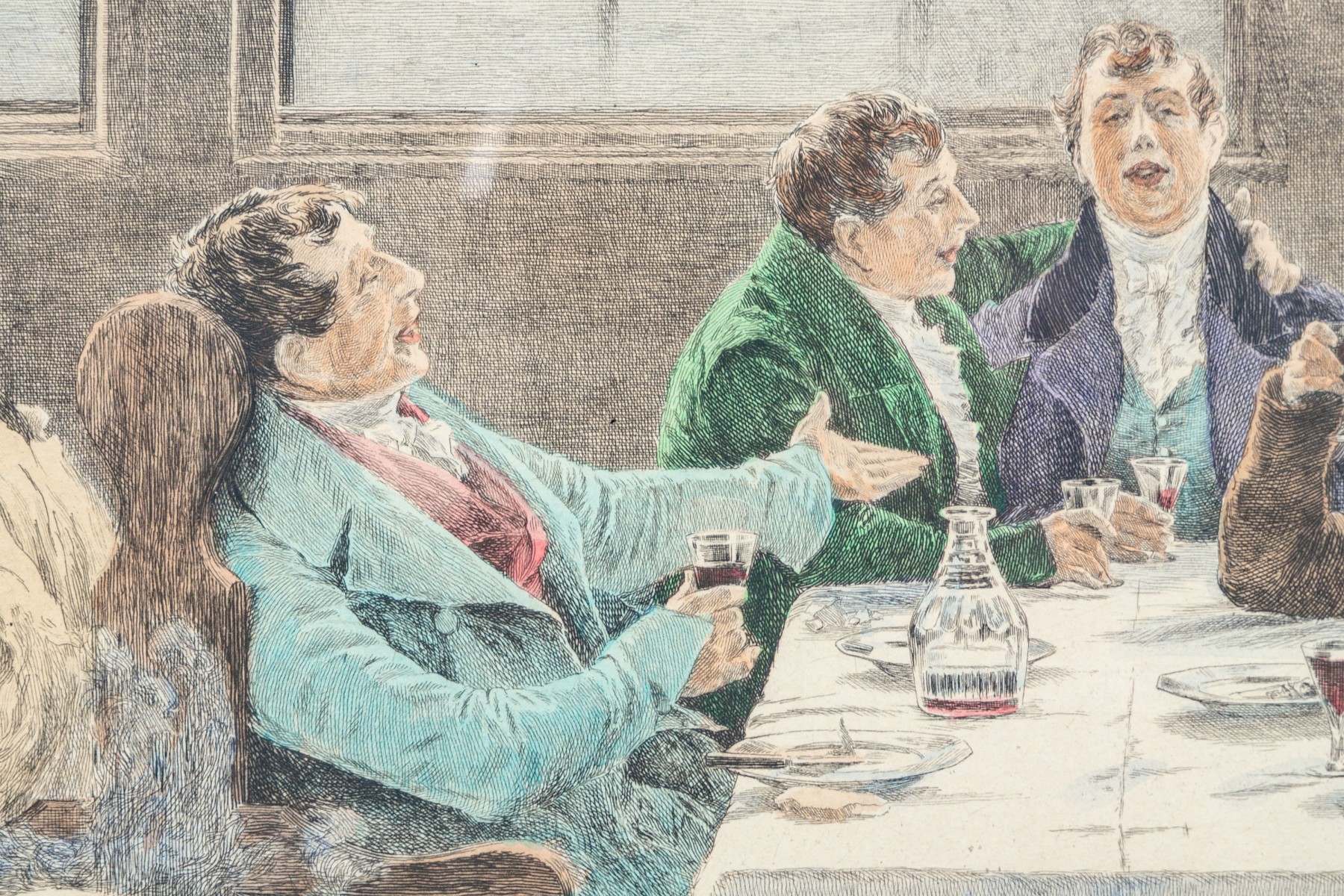 Signed in plate lower left. Title below. After a painting by the artist. An amusing genre scene with various figures enjoying lunch with the officials in discussion nearby. Presented in a gilt frame with glass.