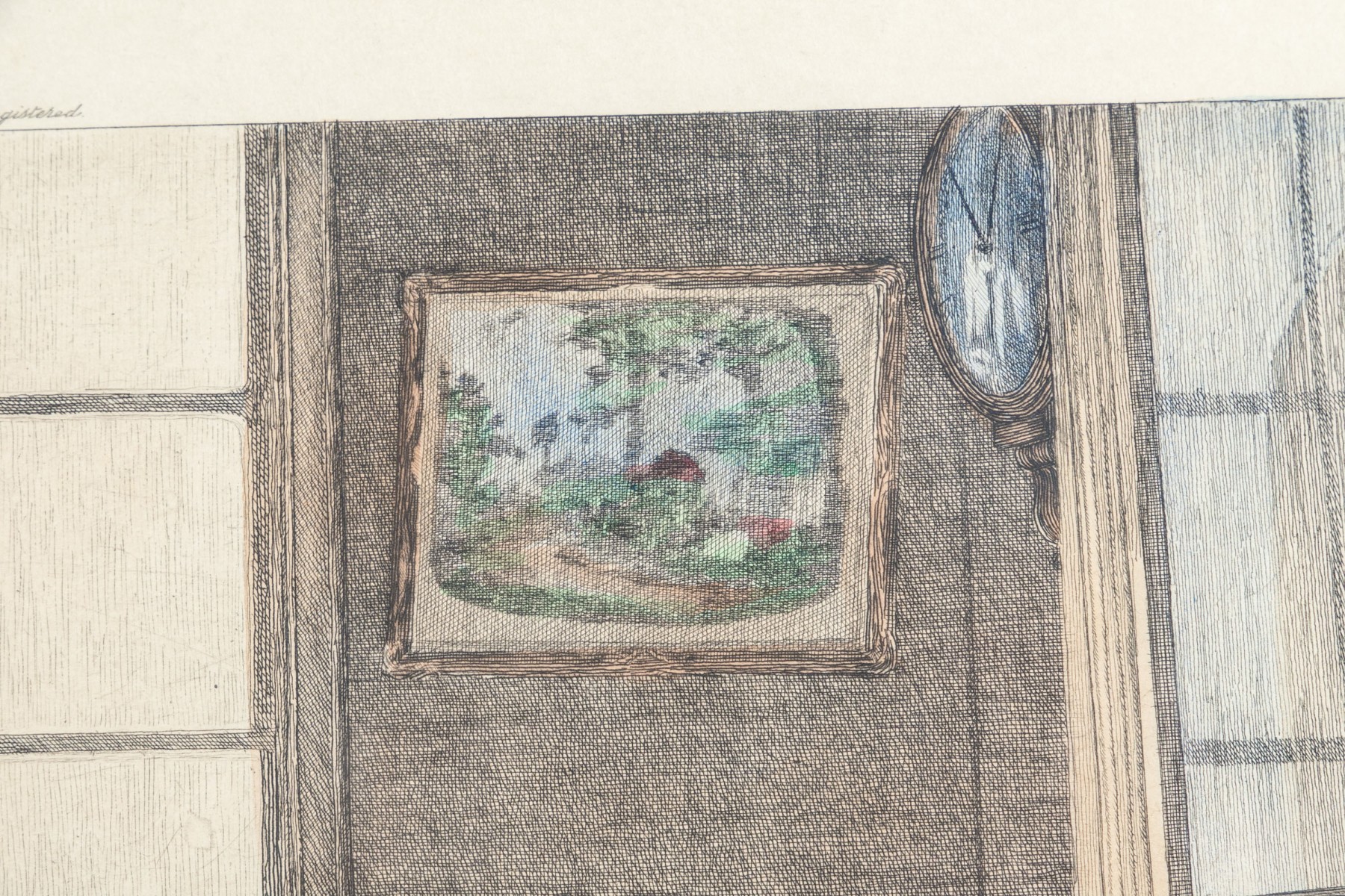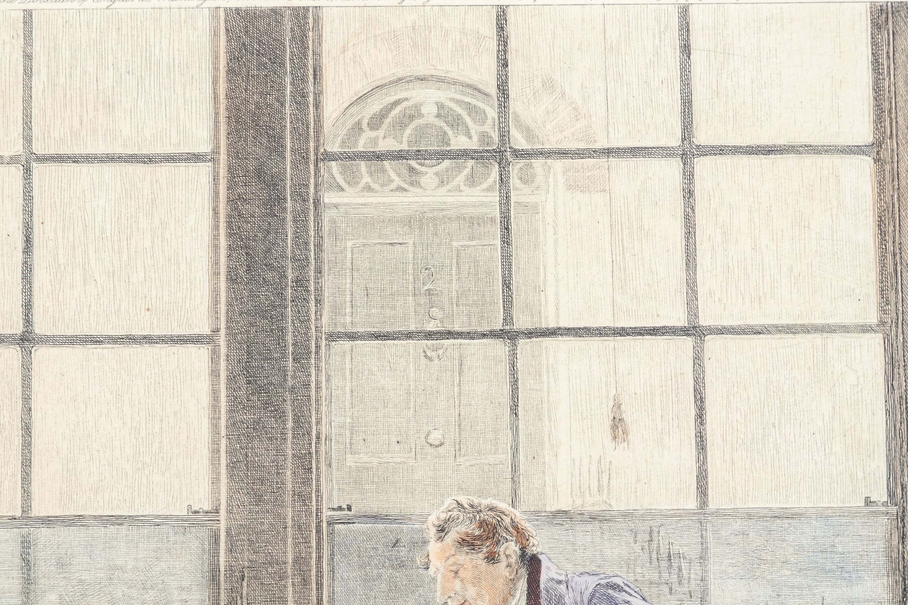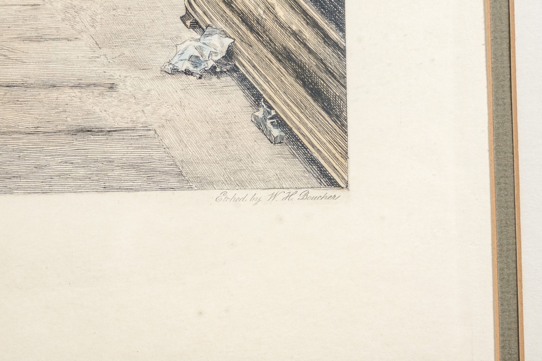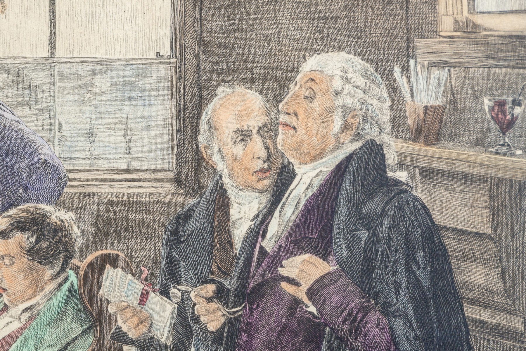 Signed in plate lower left. Title below. After a painting by the artist. An amusing genre scene with various figures enjoying lunch with the officials in discussion nearby. Presented in a gilt frame with glass.
