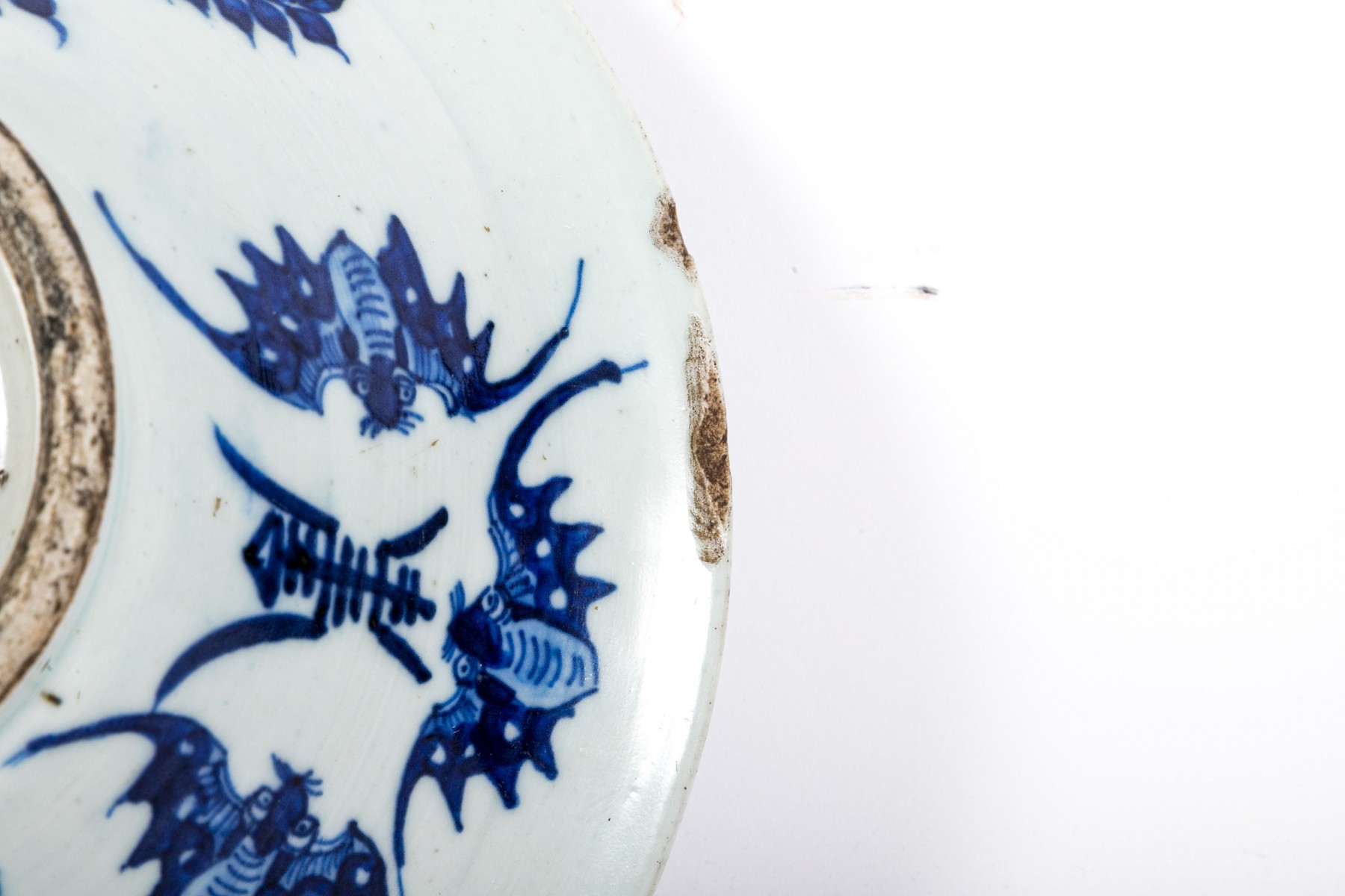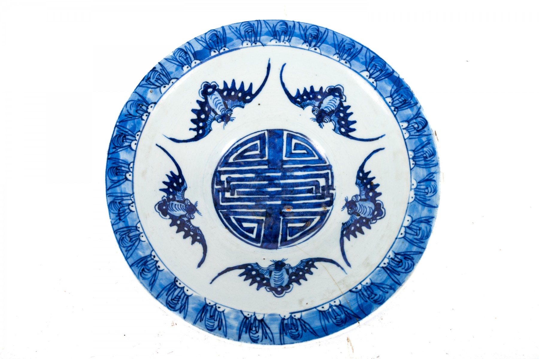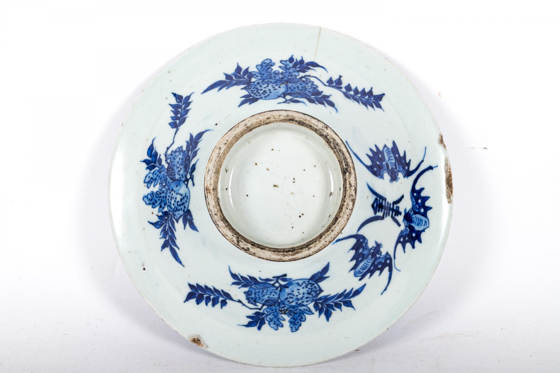 A wonderful Chinese ceramic bowl displaying a monochromatic blue scene of bat motifs around a large medallion center, decorated with fruiting branches on the exterior. The gently tapering bowl is lifted on a tall foot.