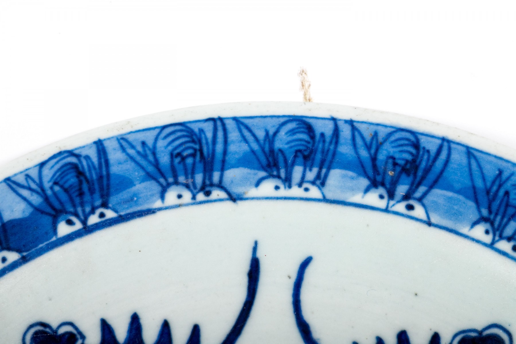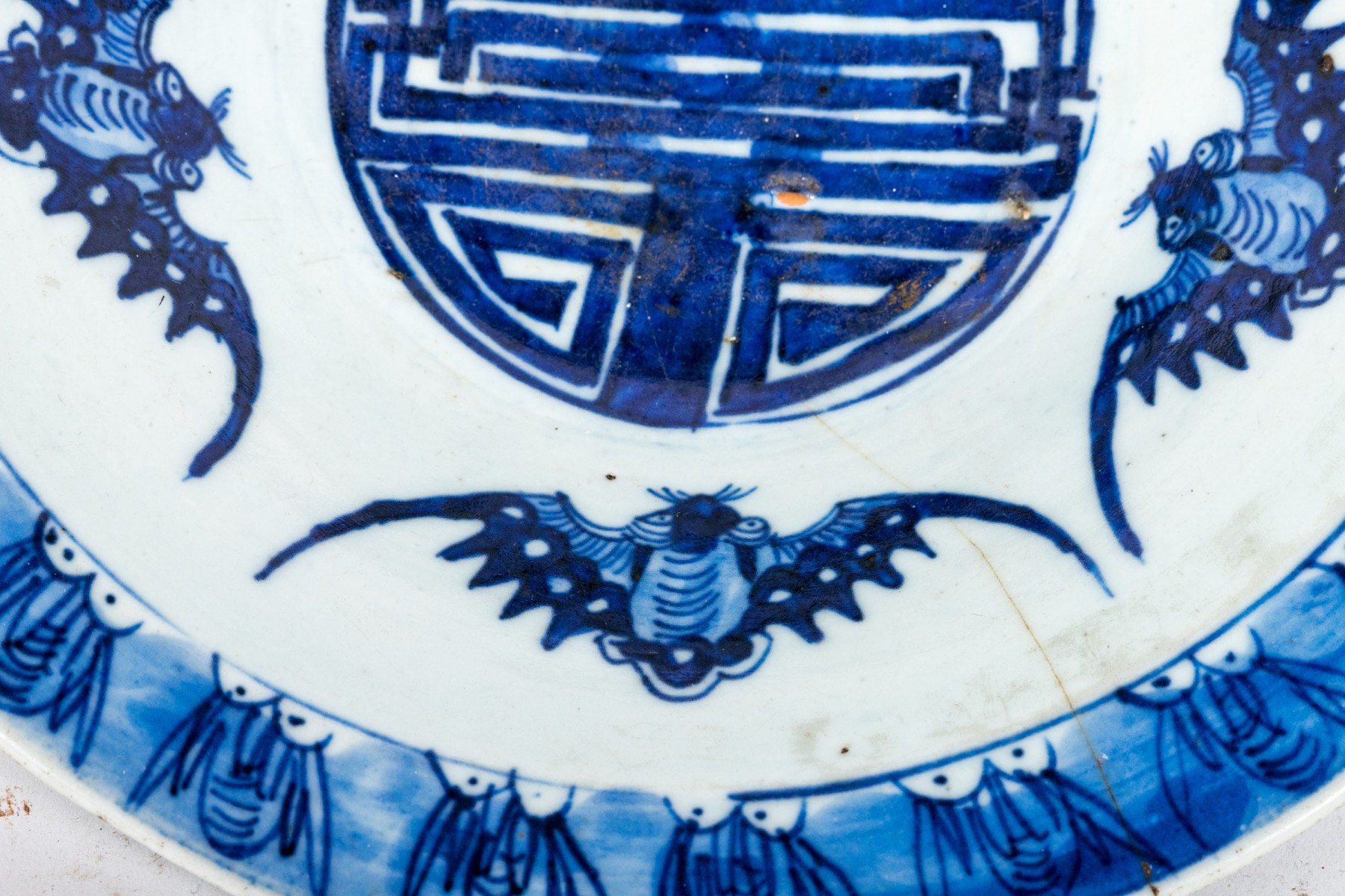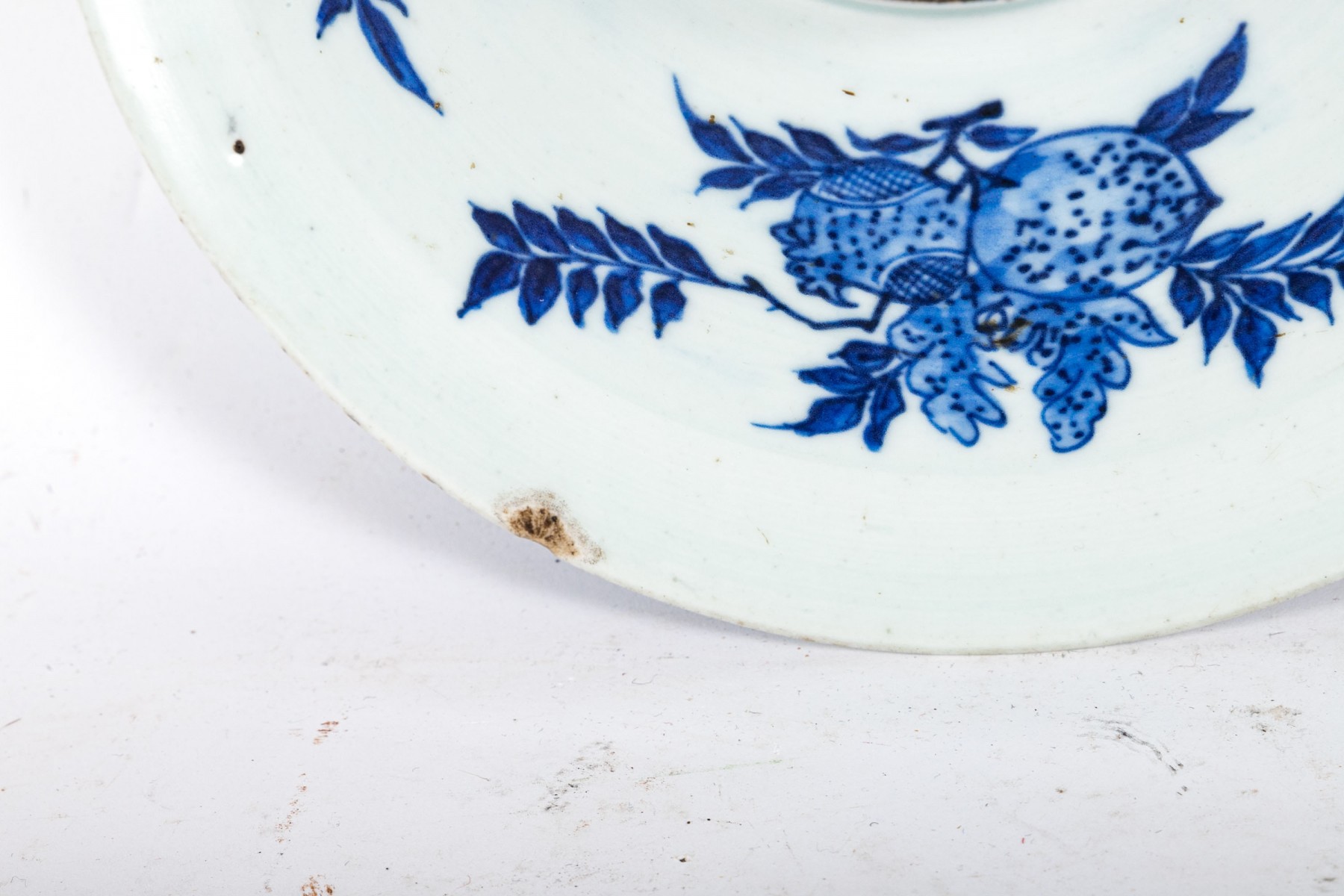 A wonderful Chinese ceramic bowl displaying a monochromatic blue scene of bat motifs around a large medallion center, decorated with fruiting branches on the exterior. The gently tapering bowl is lifted on a tall foot.