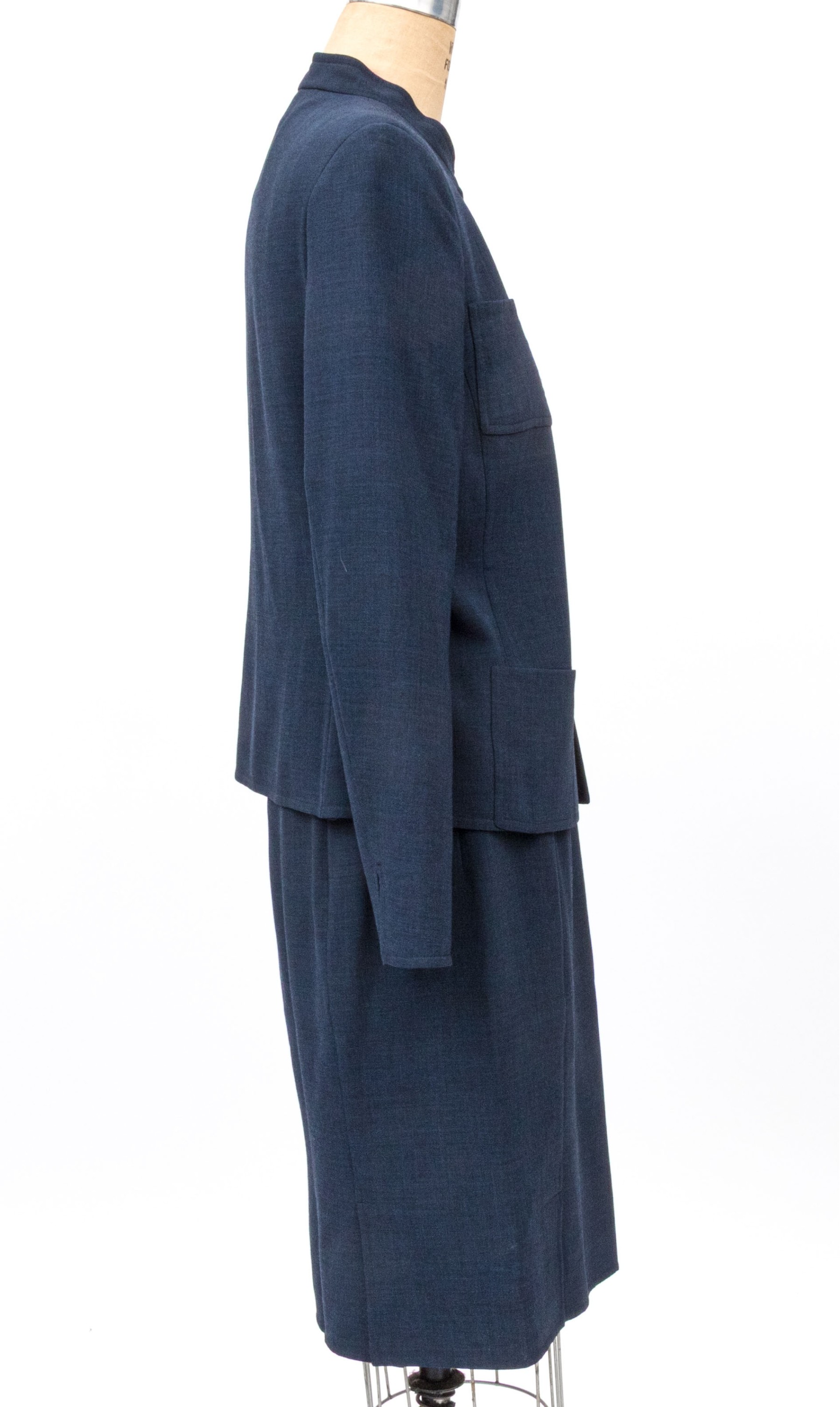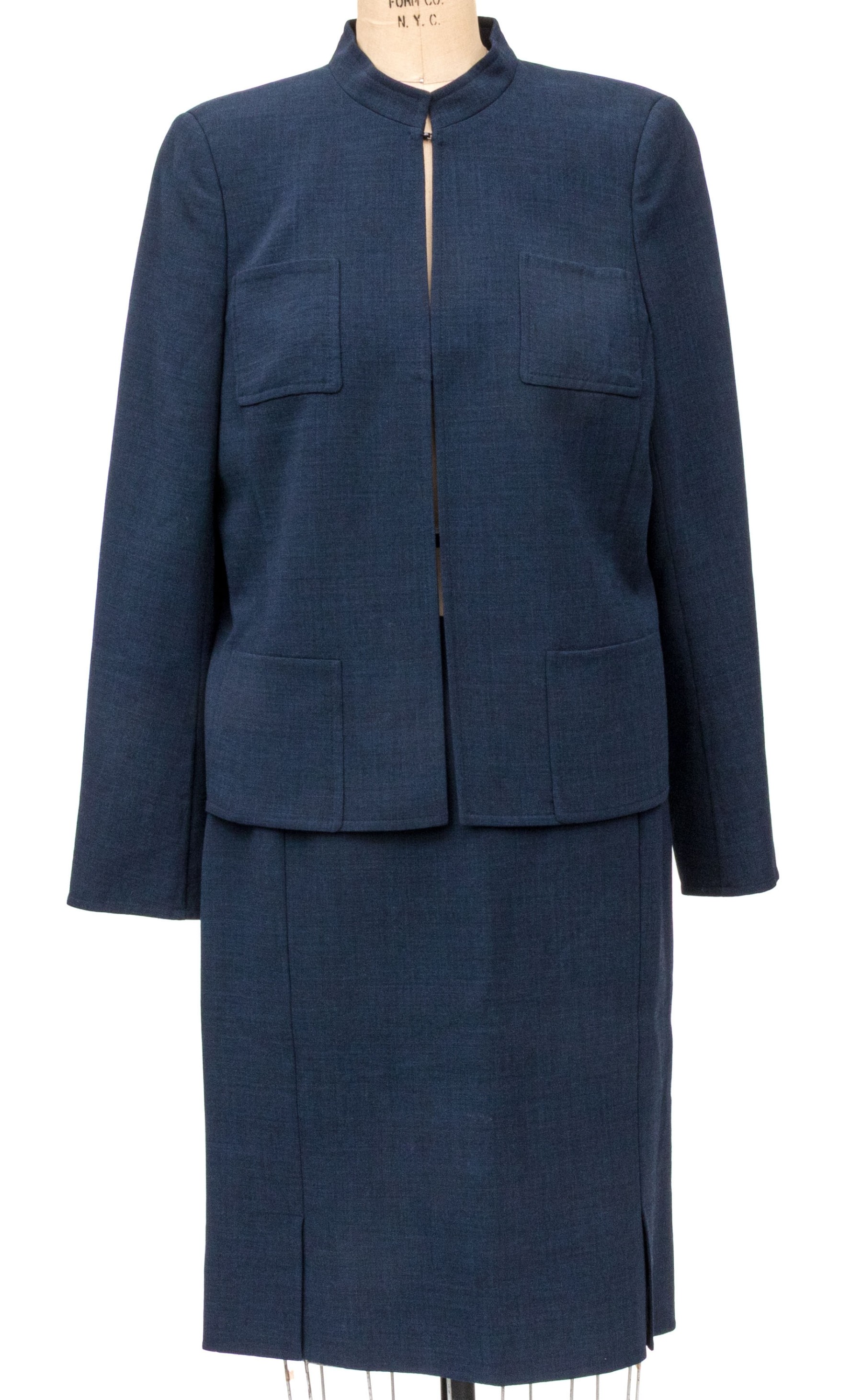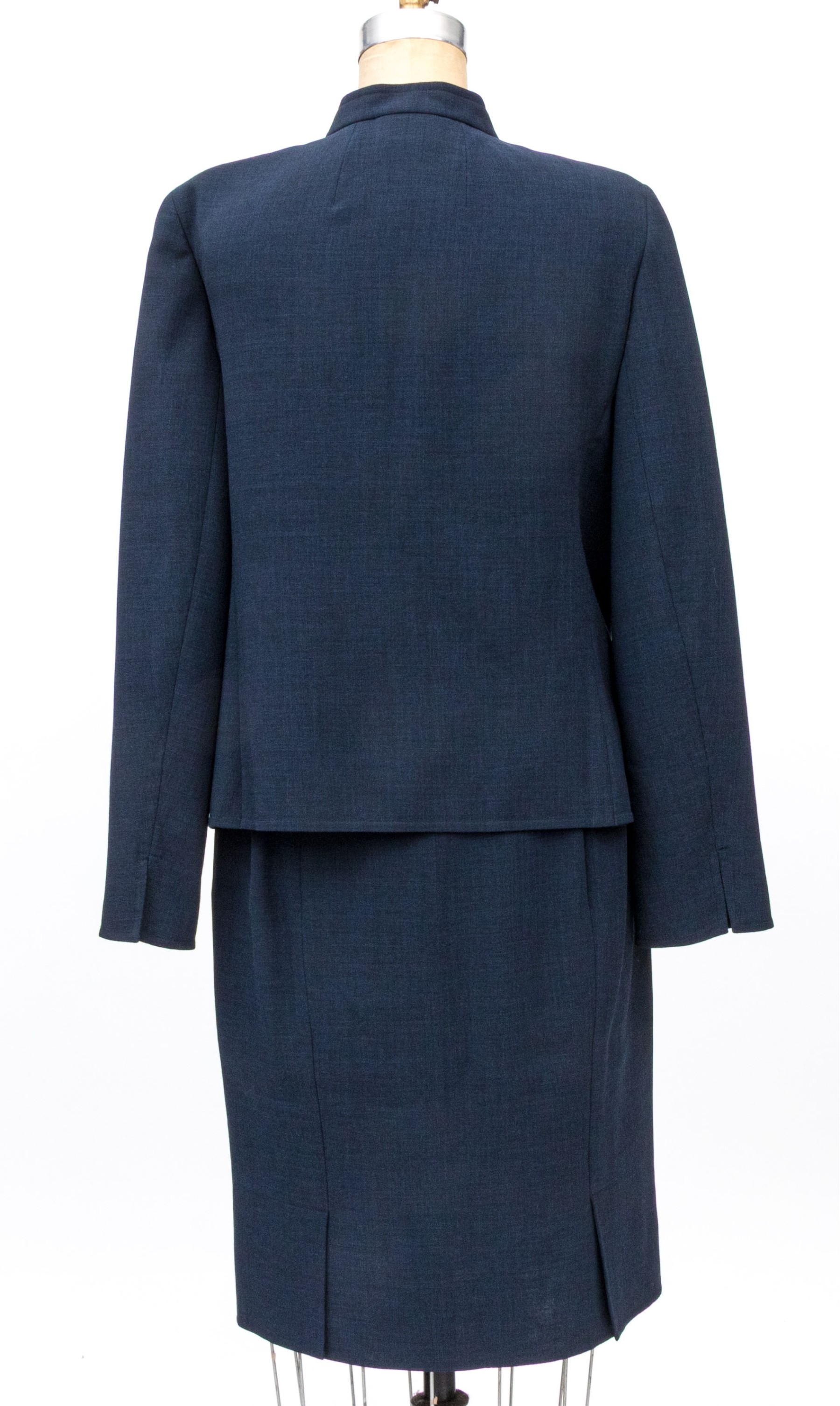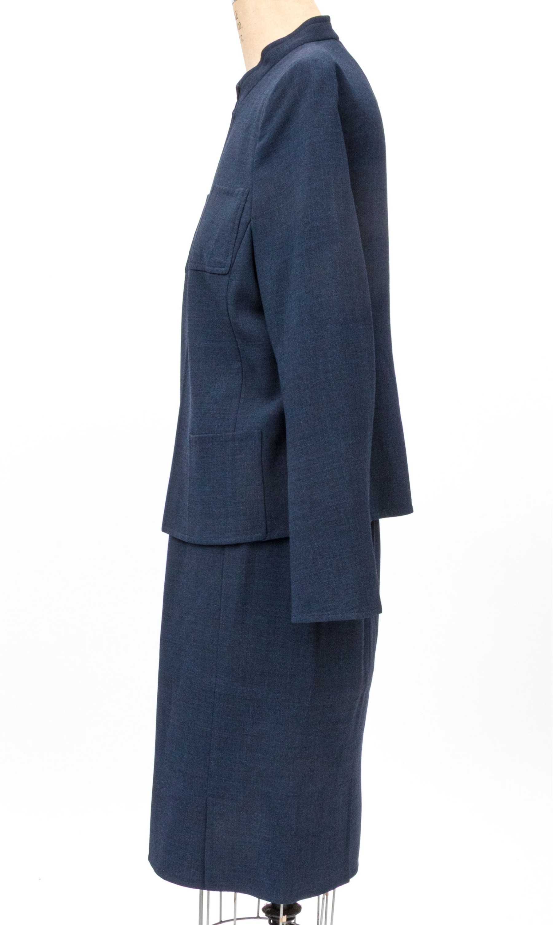 Akris blackish blue wool mandarin collared skirt suit, size 10