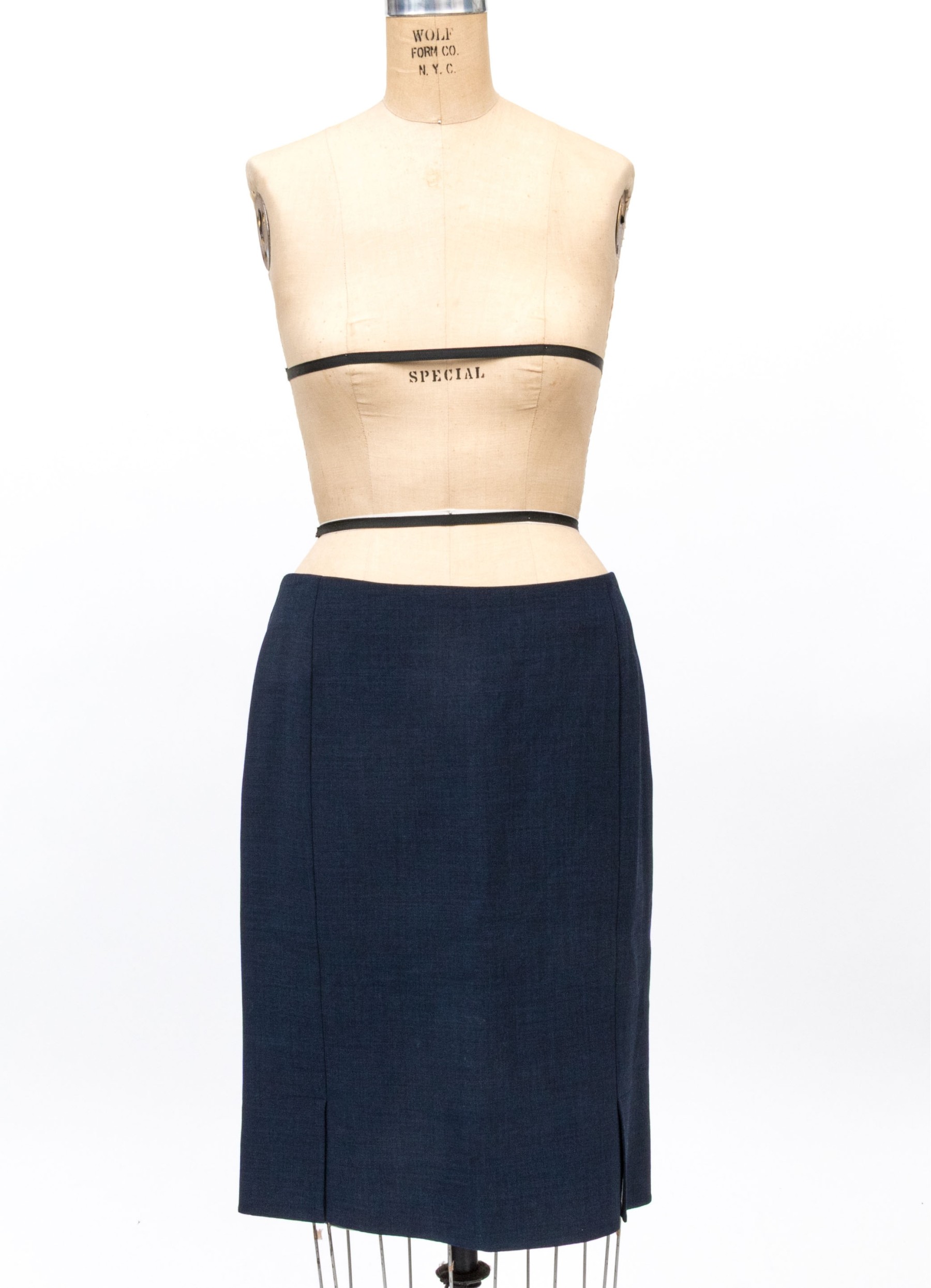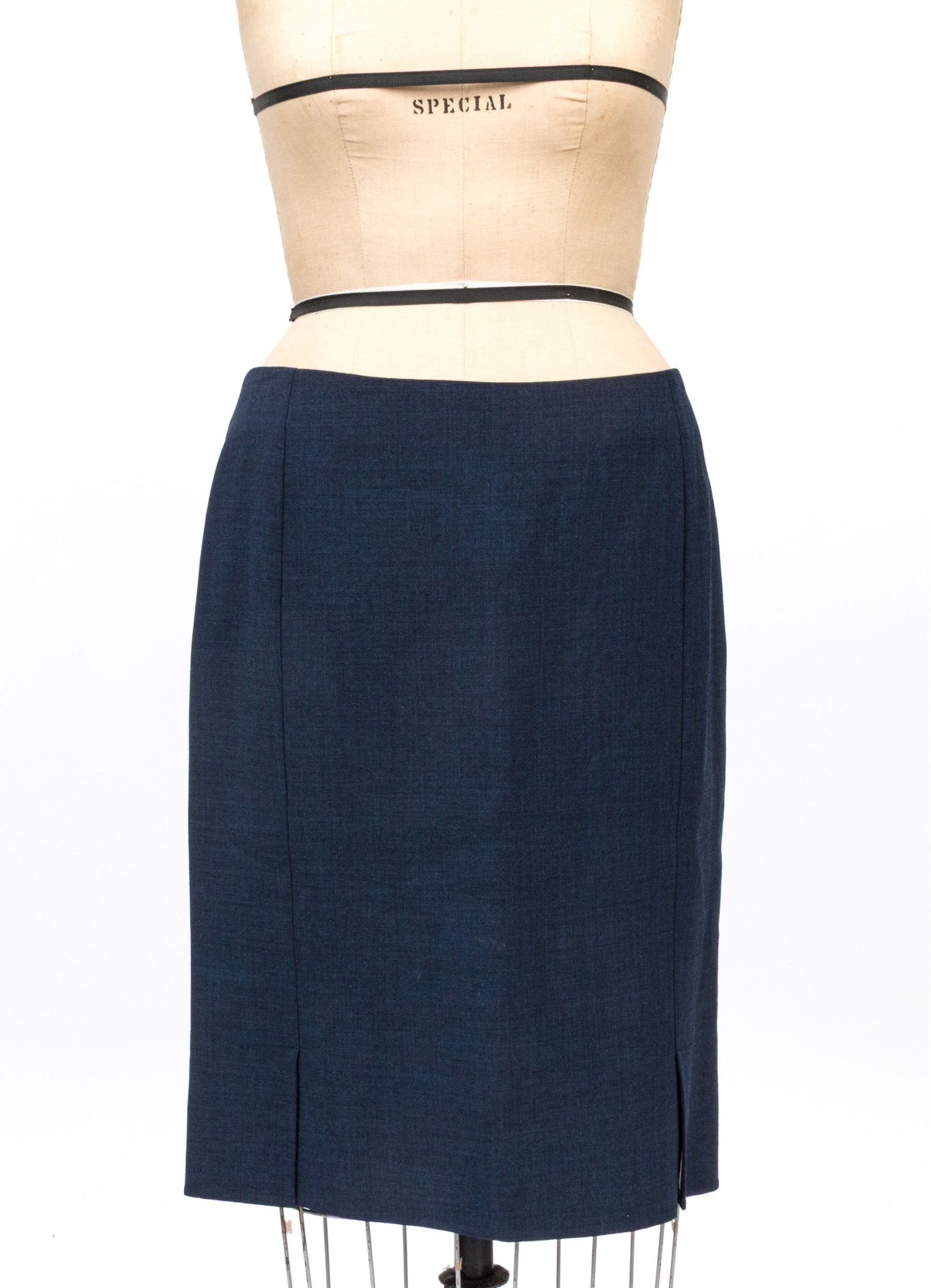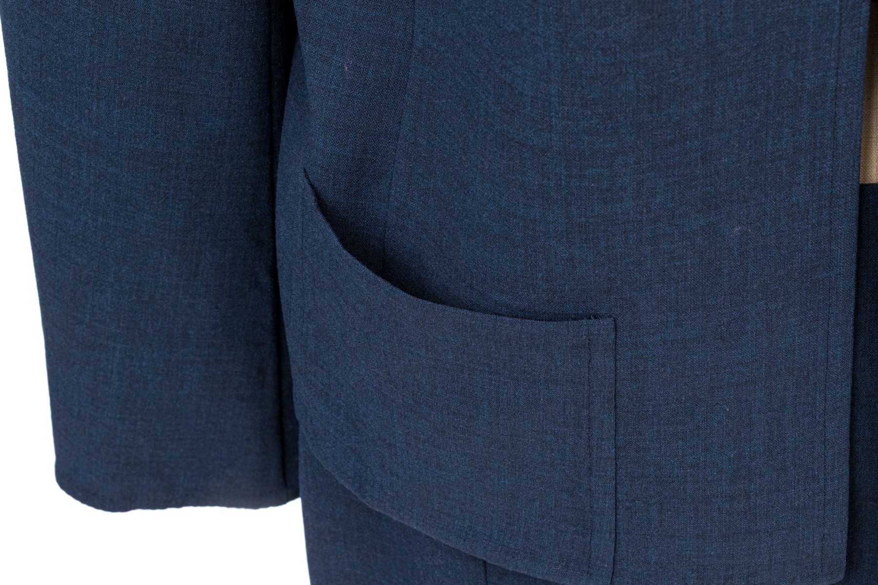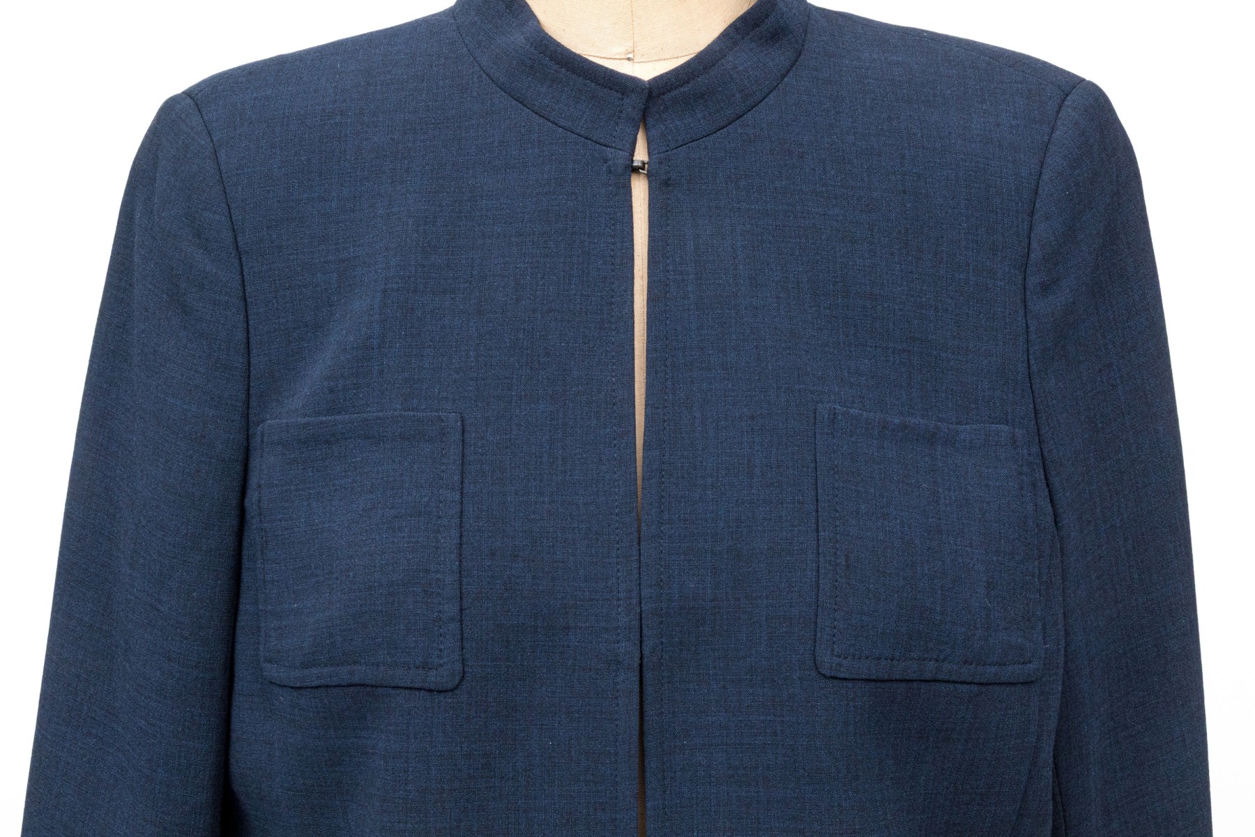 Akris blackish blue wool mandarin collared skirt suit, size 10