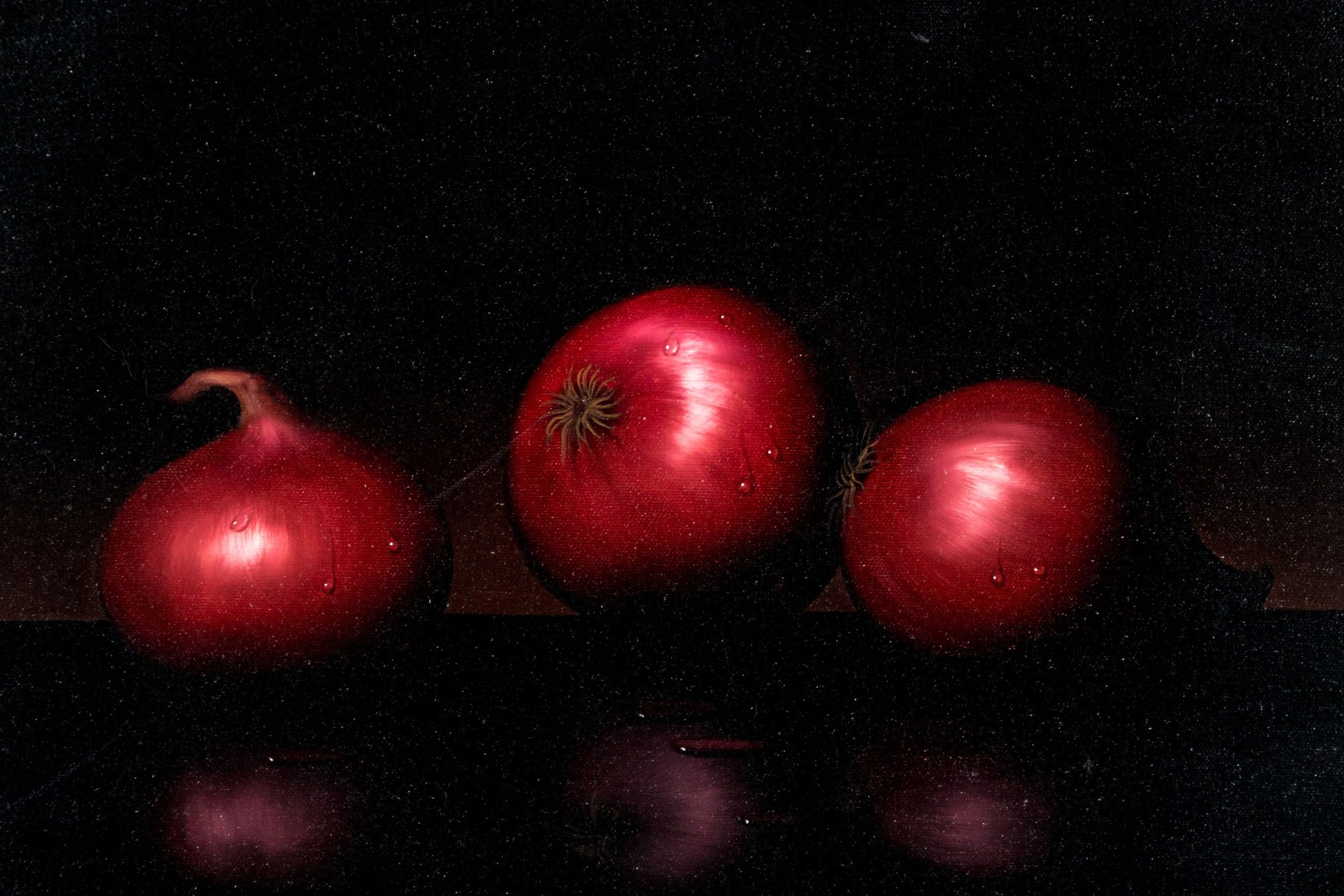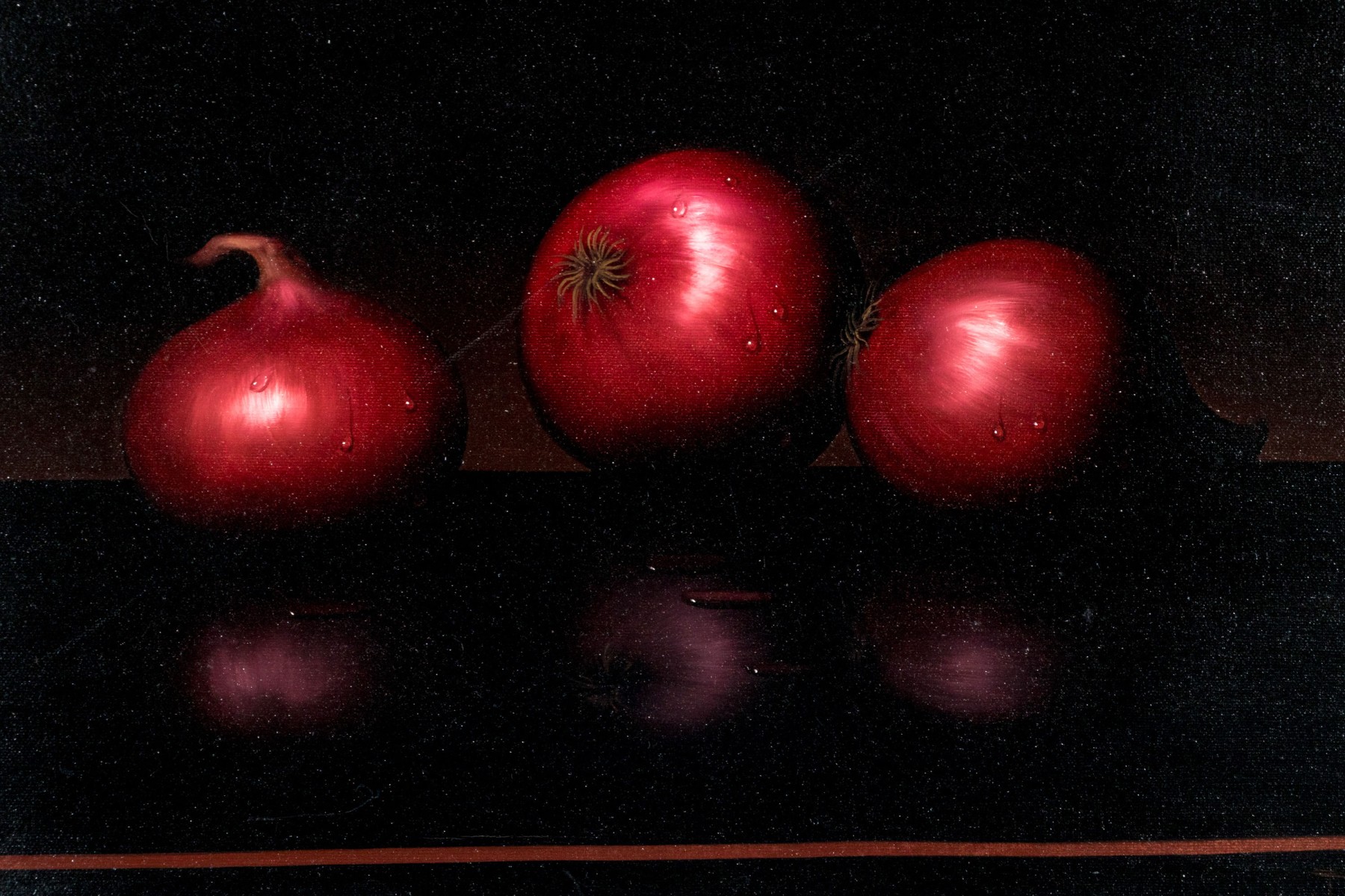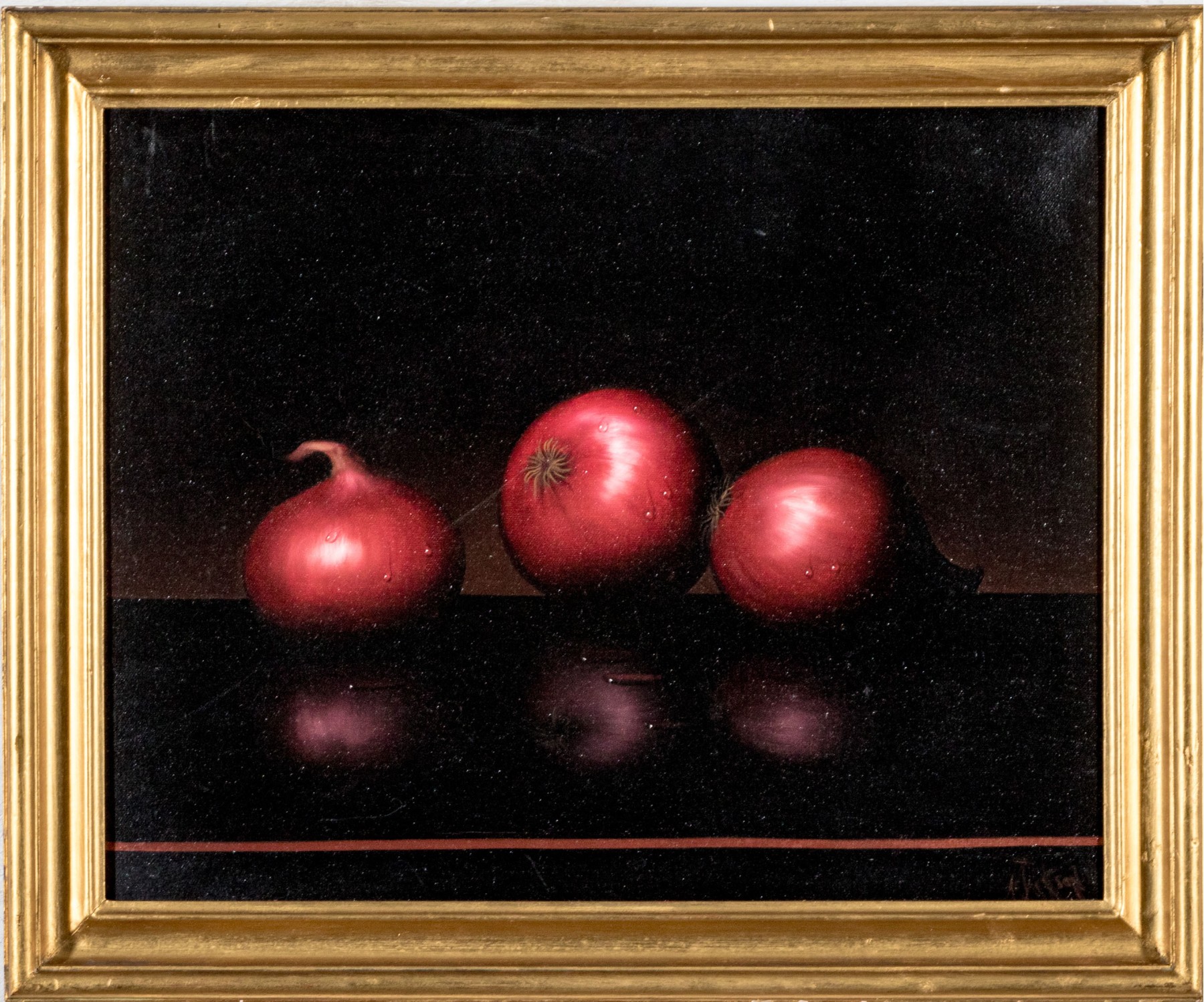A group of red onions on a table highlighted by the light and reflected below on the dark ground. Presented in a gilt wood frame.
