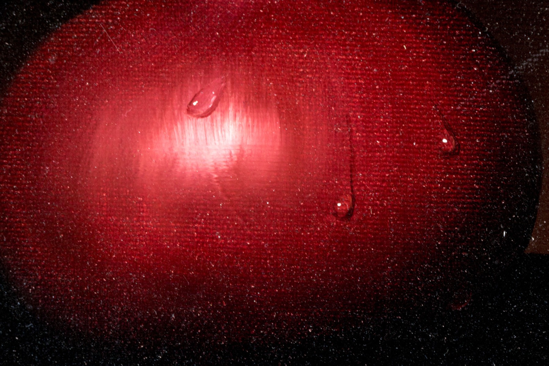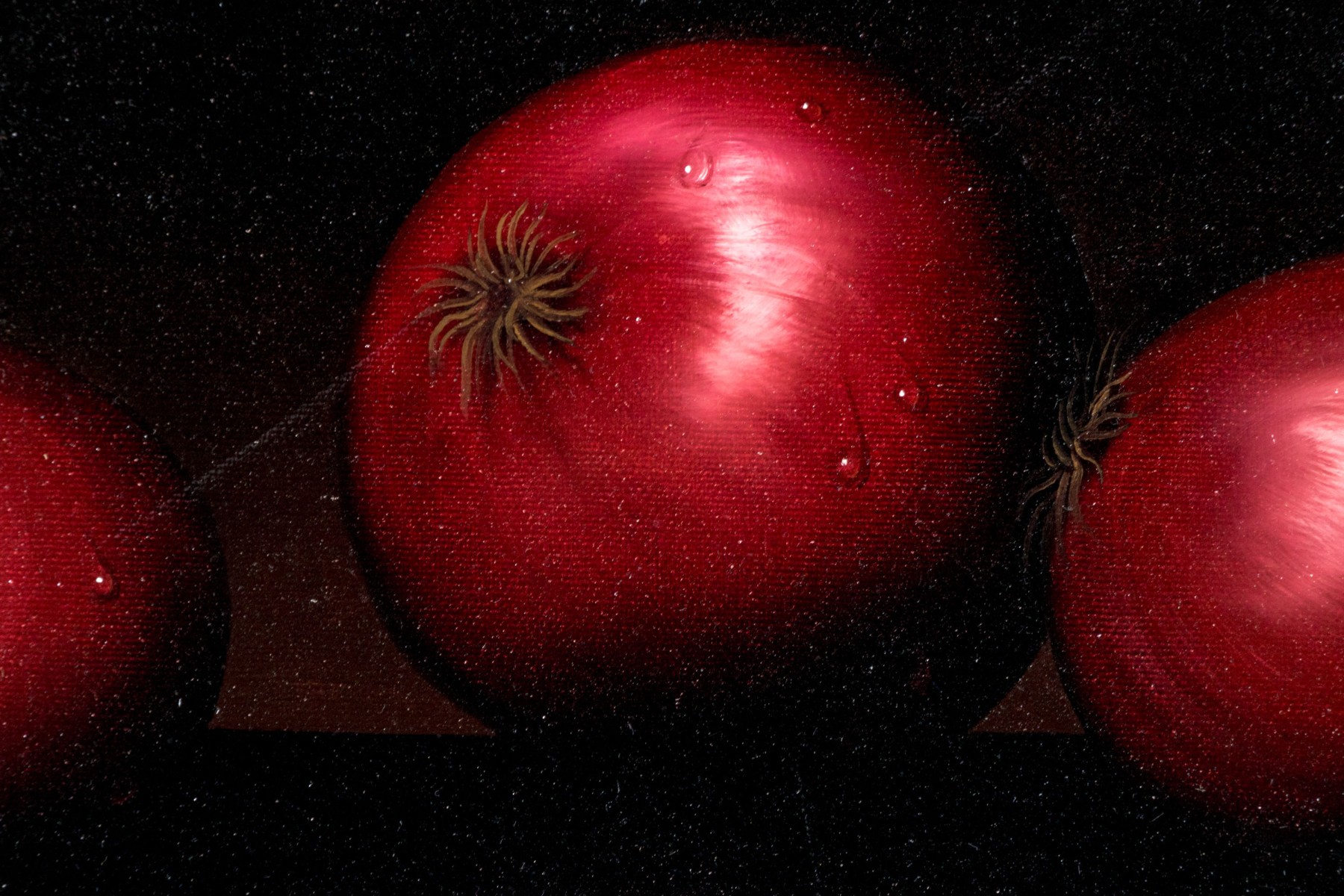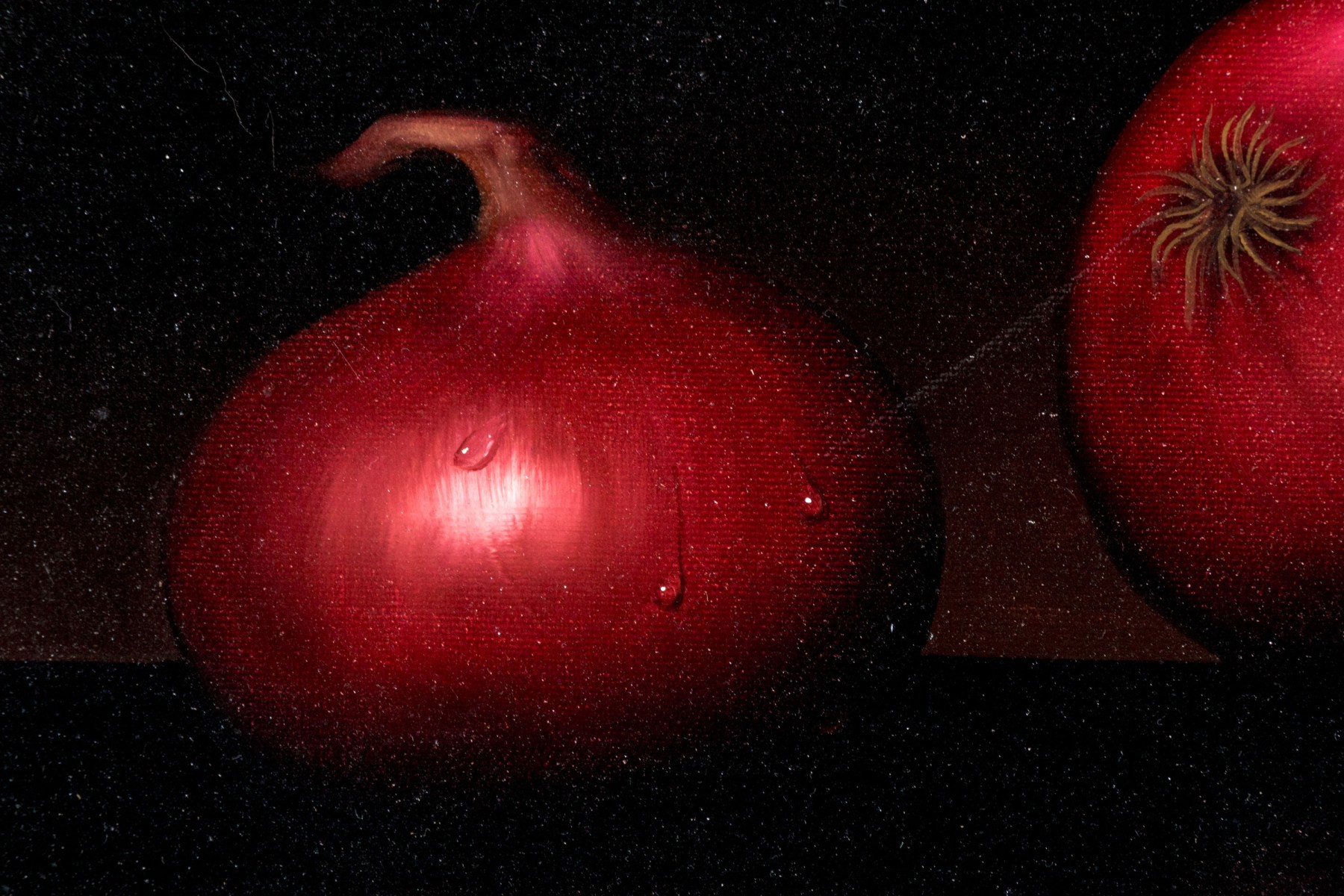 A group of red onions on a table highlighted by the light and reflected below on the dark ground. Presented in a gilt wood frame.