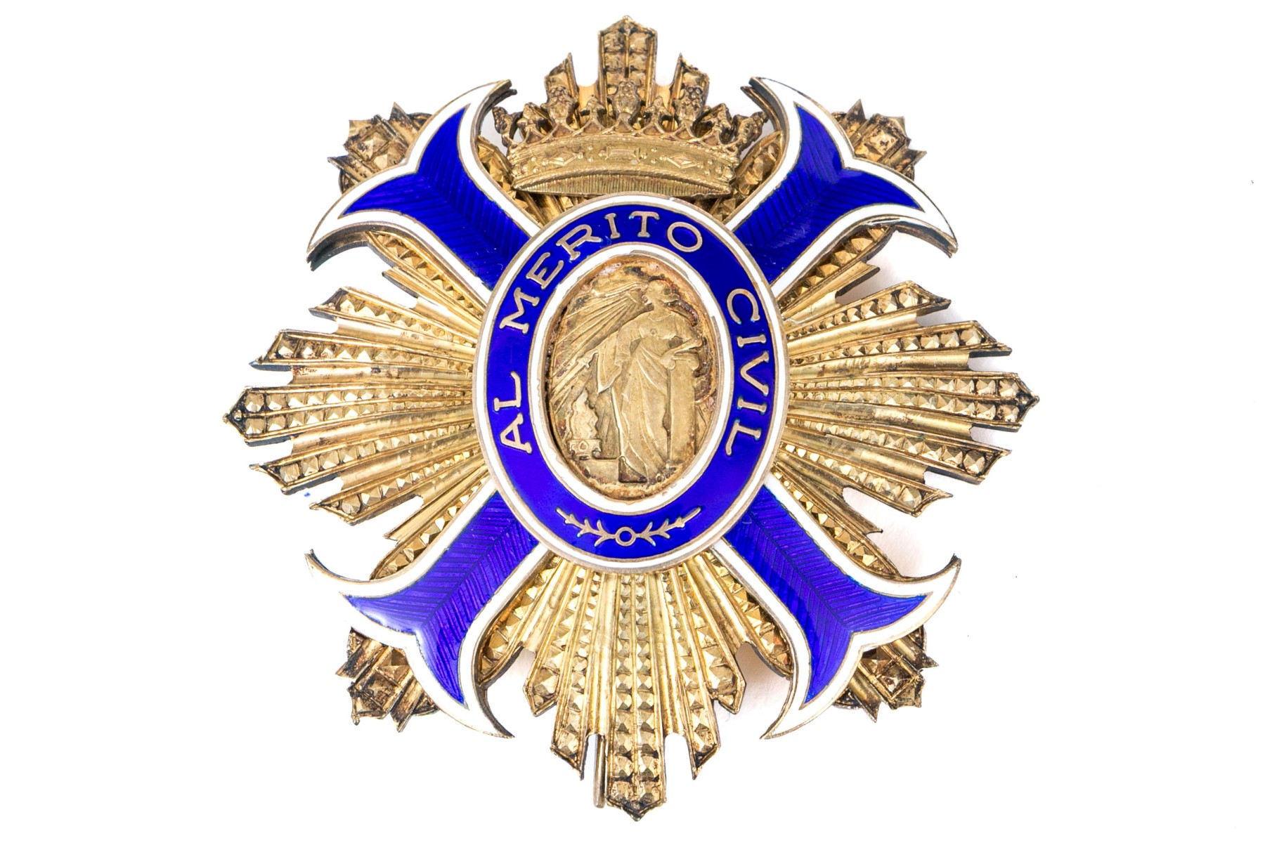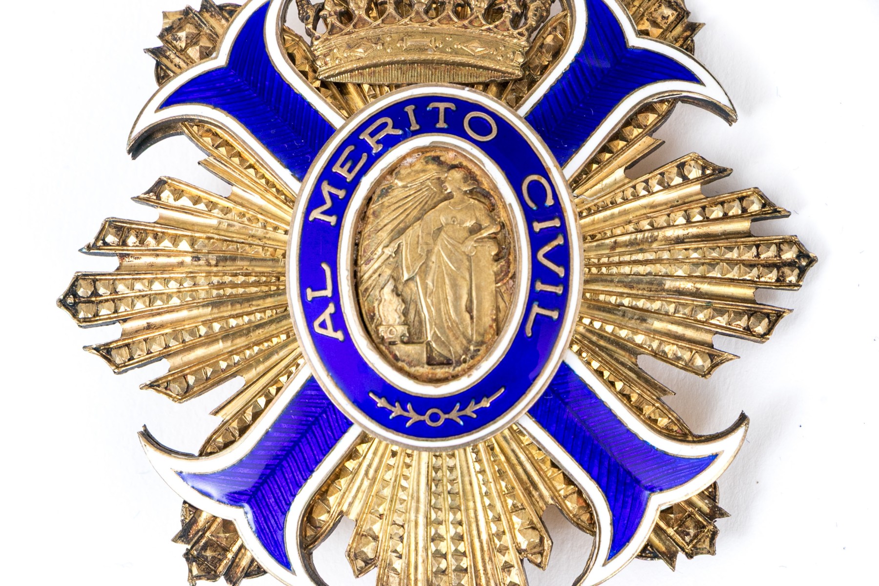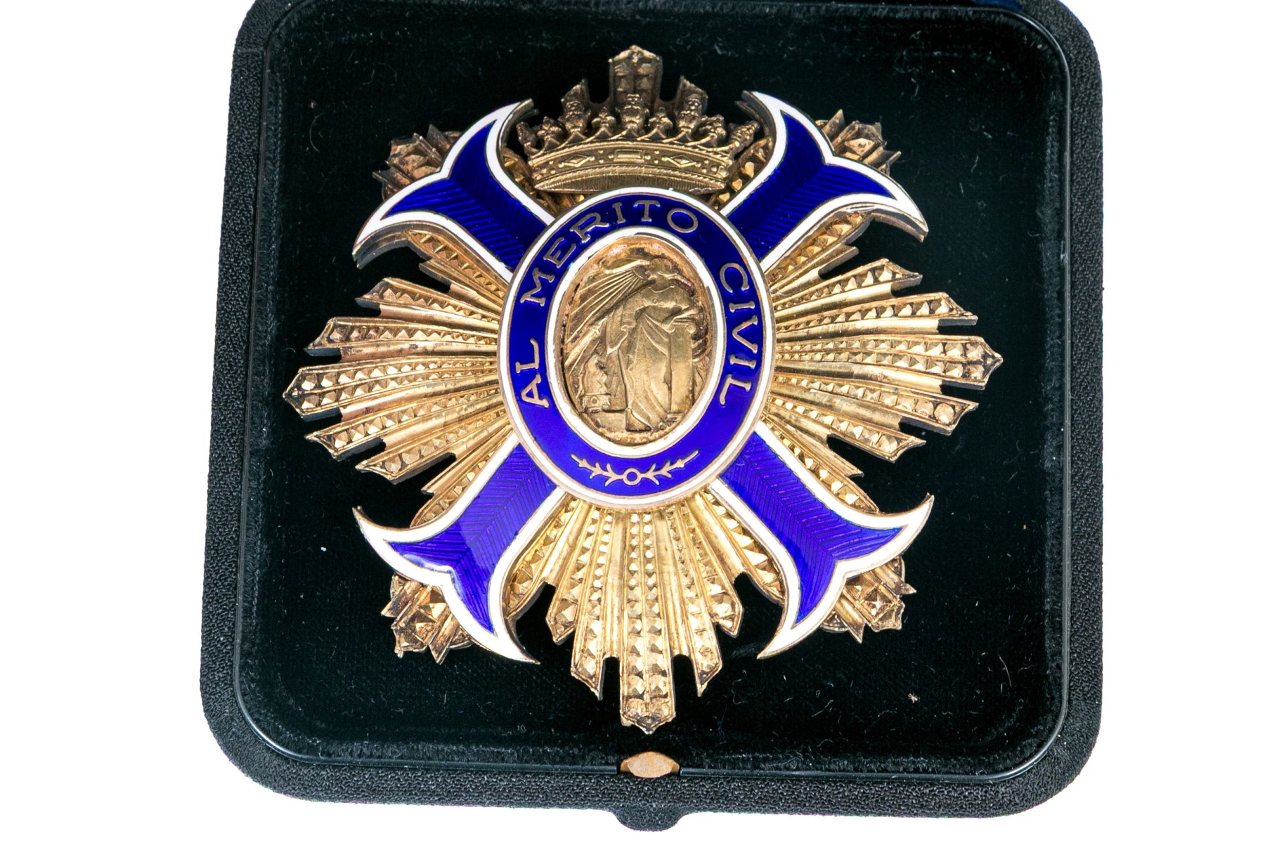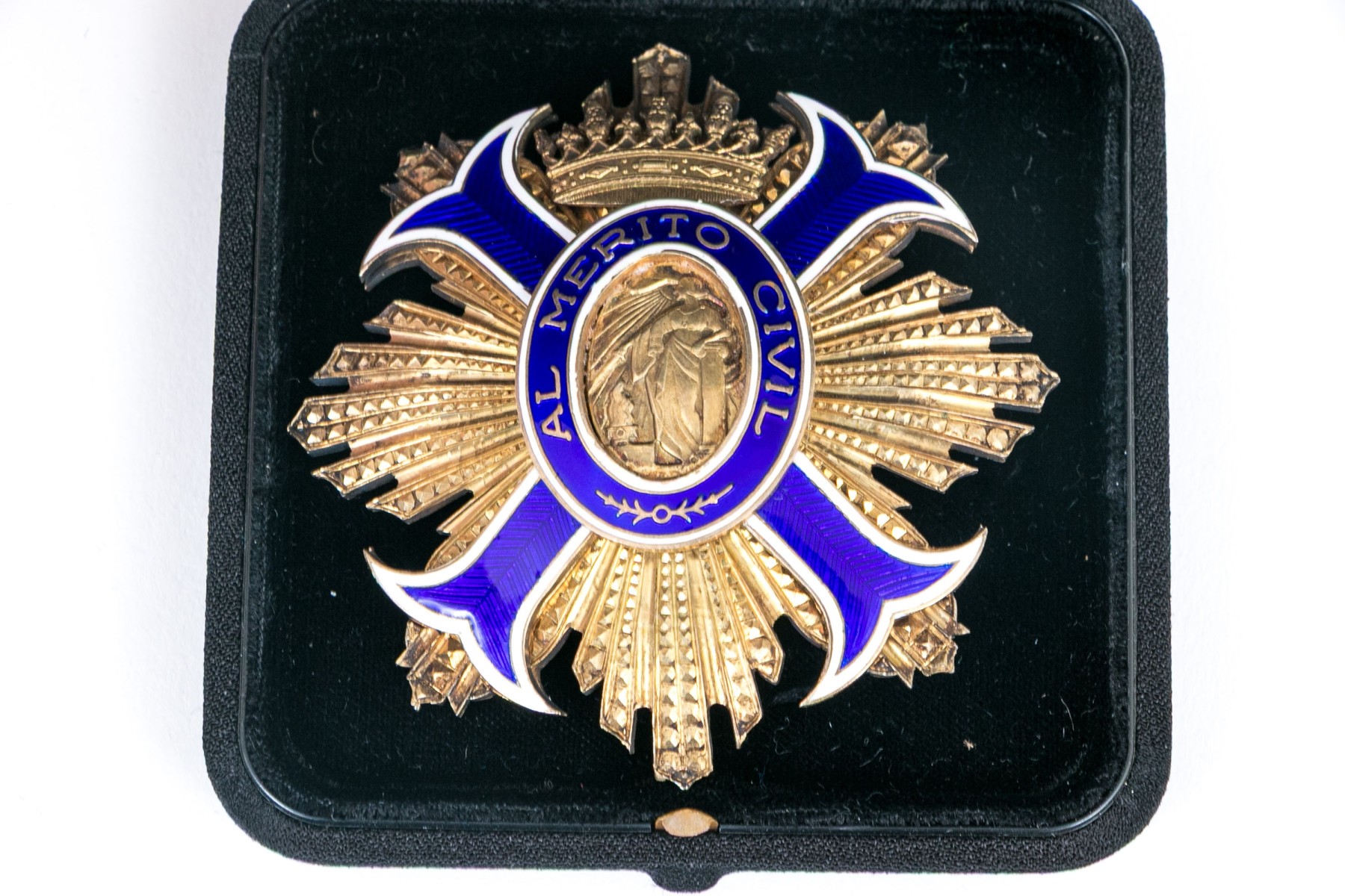 A beautifully designed Spanish Order of Civil Merit grand cross medal with an oval center scene of a woman dubbing a sword over a brazier, surrounded by a blue and white enameled borders with a crown at the top crest and graduated textural rays around the sides. With a Zeder case.