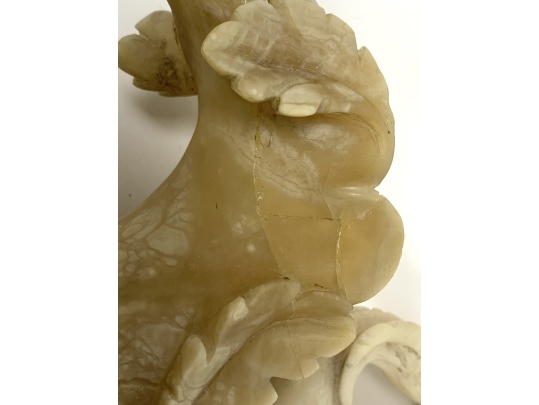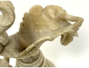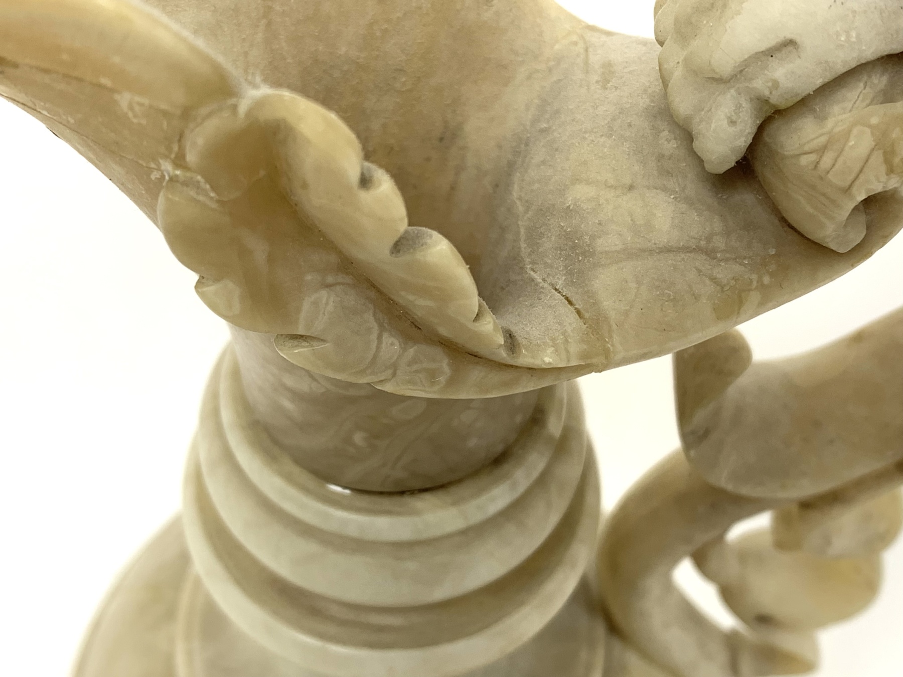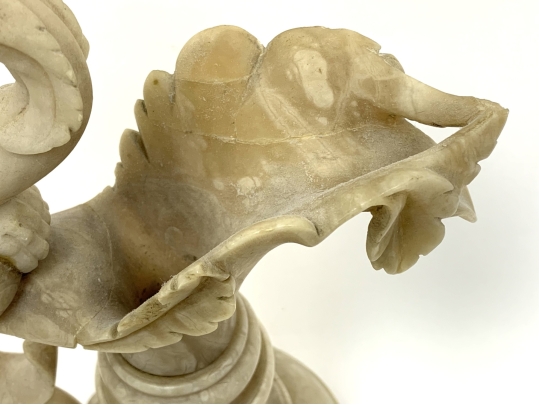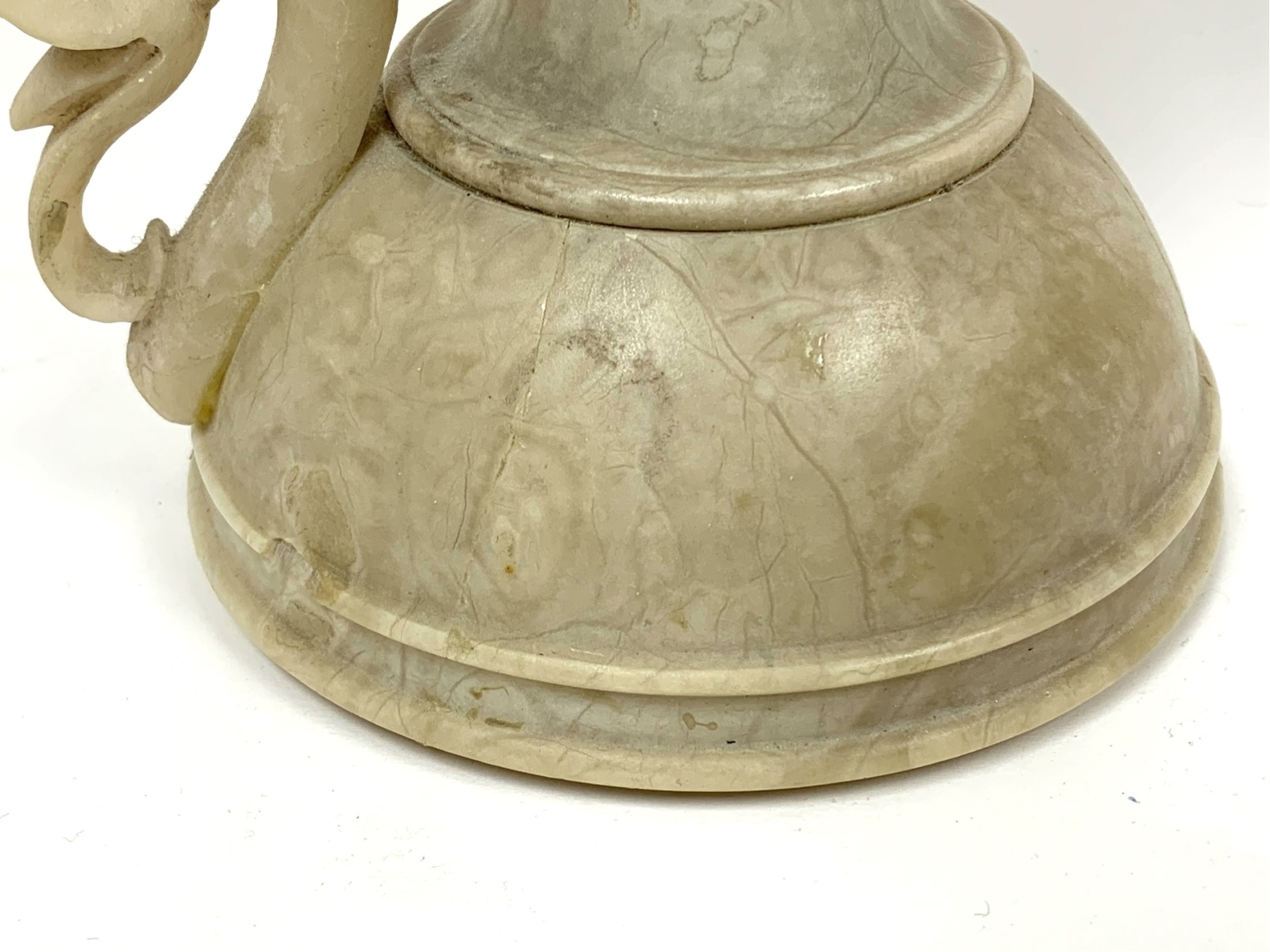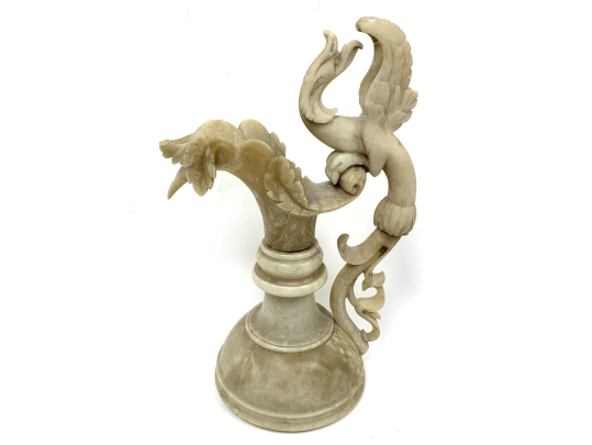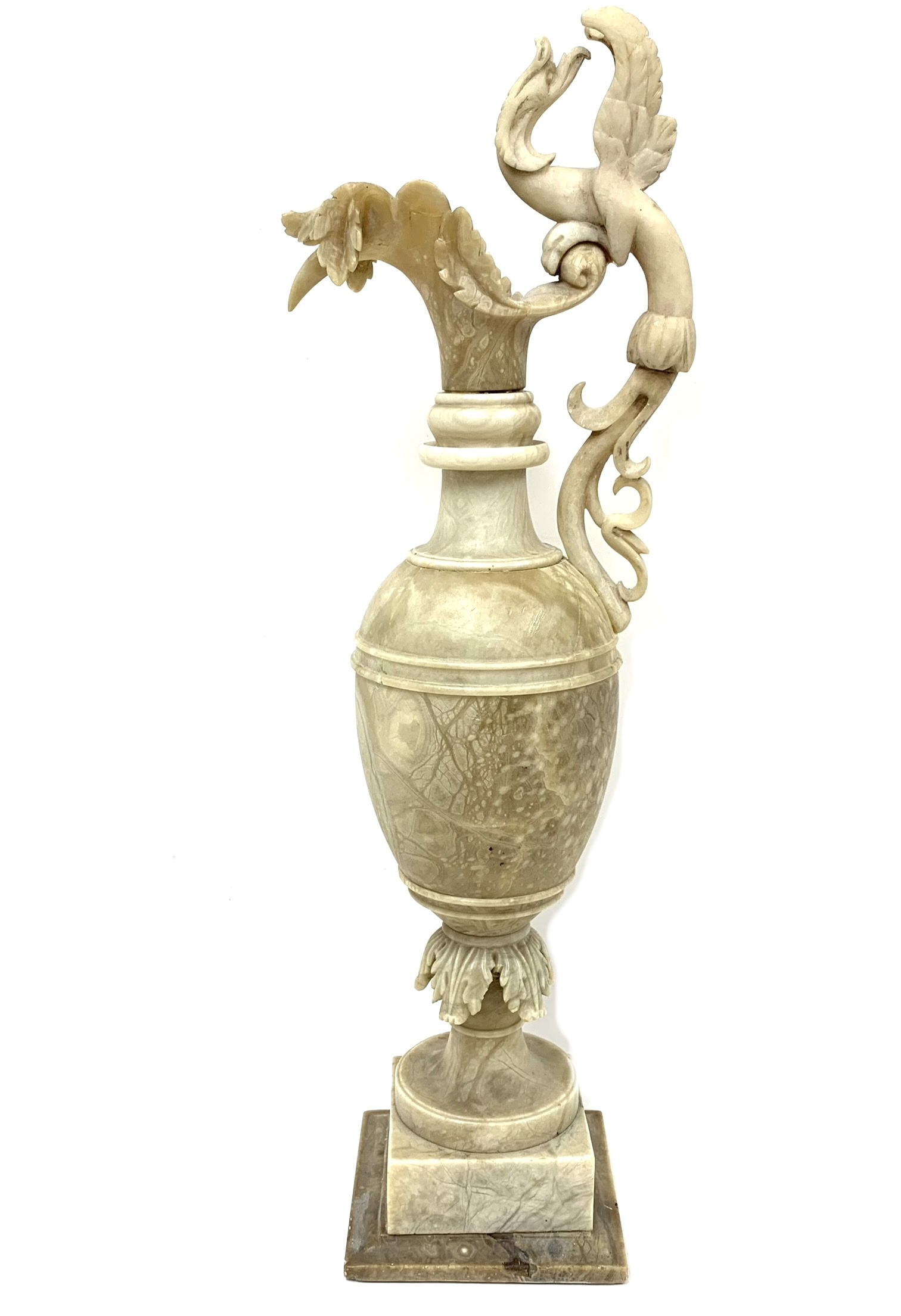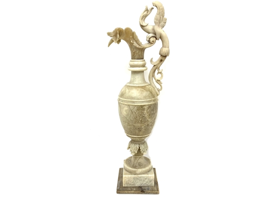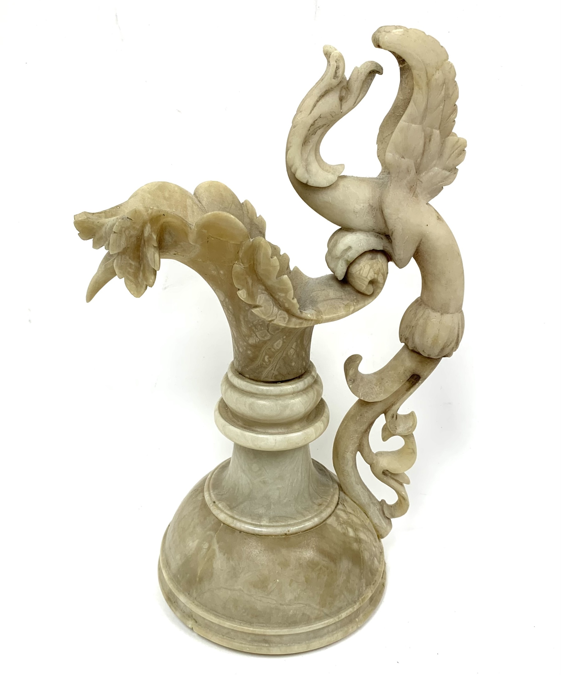 The ewer is carved from alabaster and features a large handle in the shape of a mythical bird or griffin.