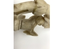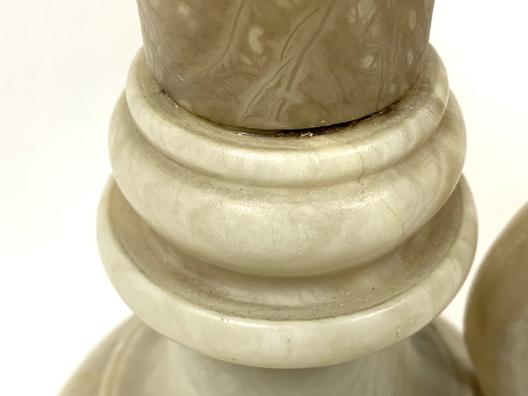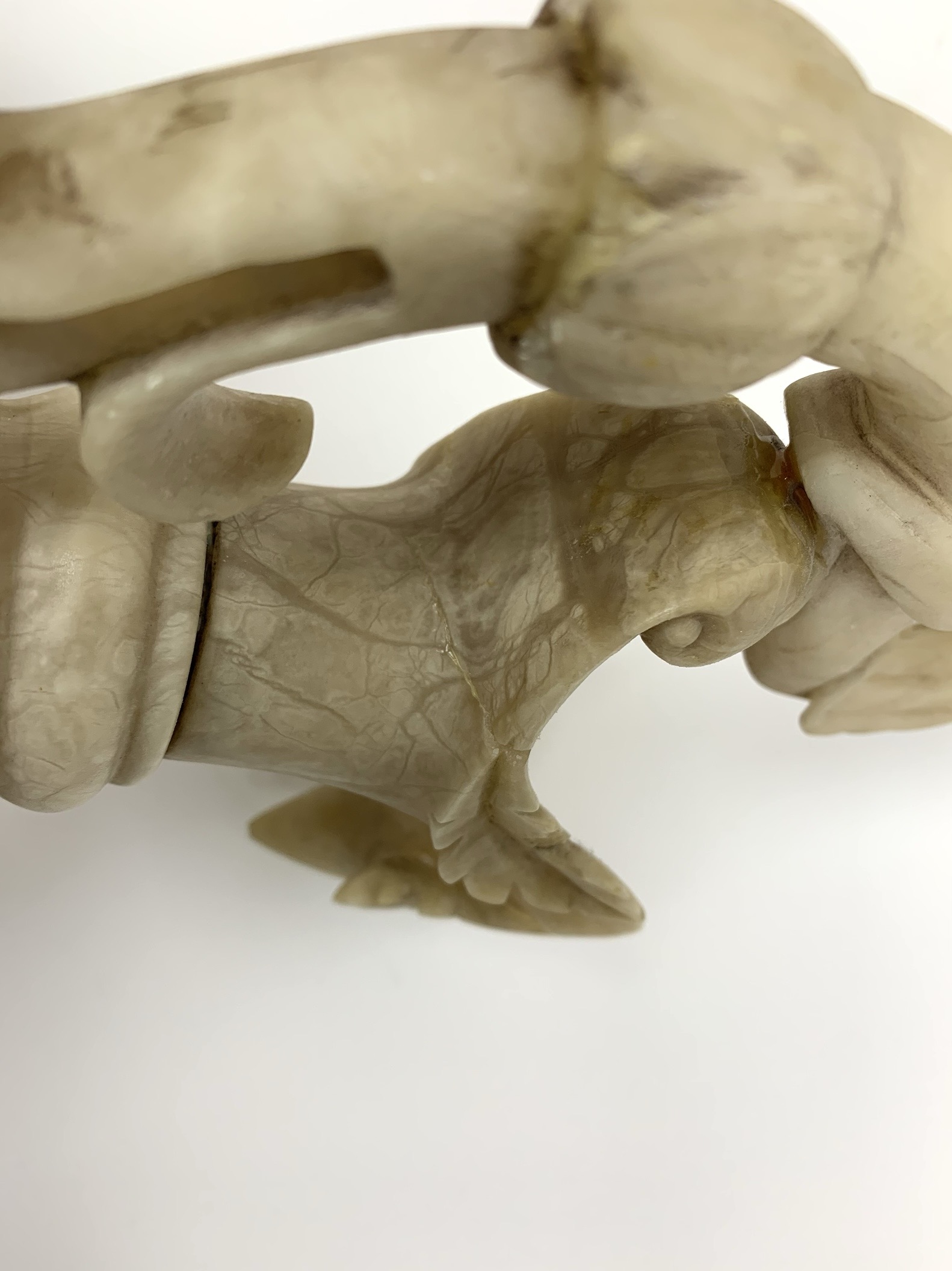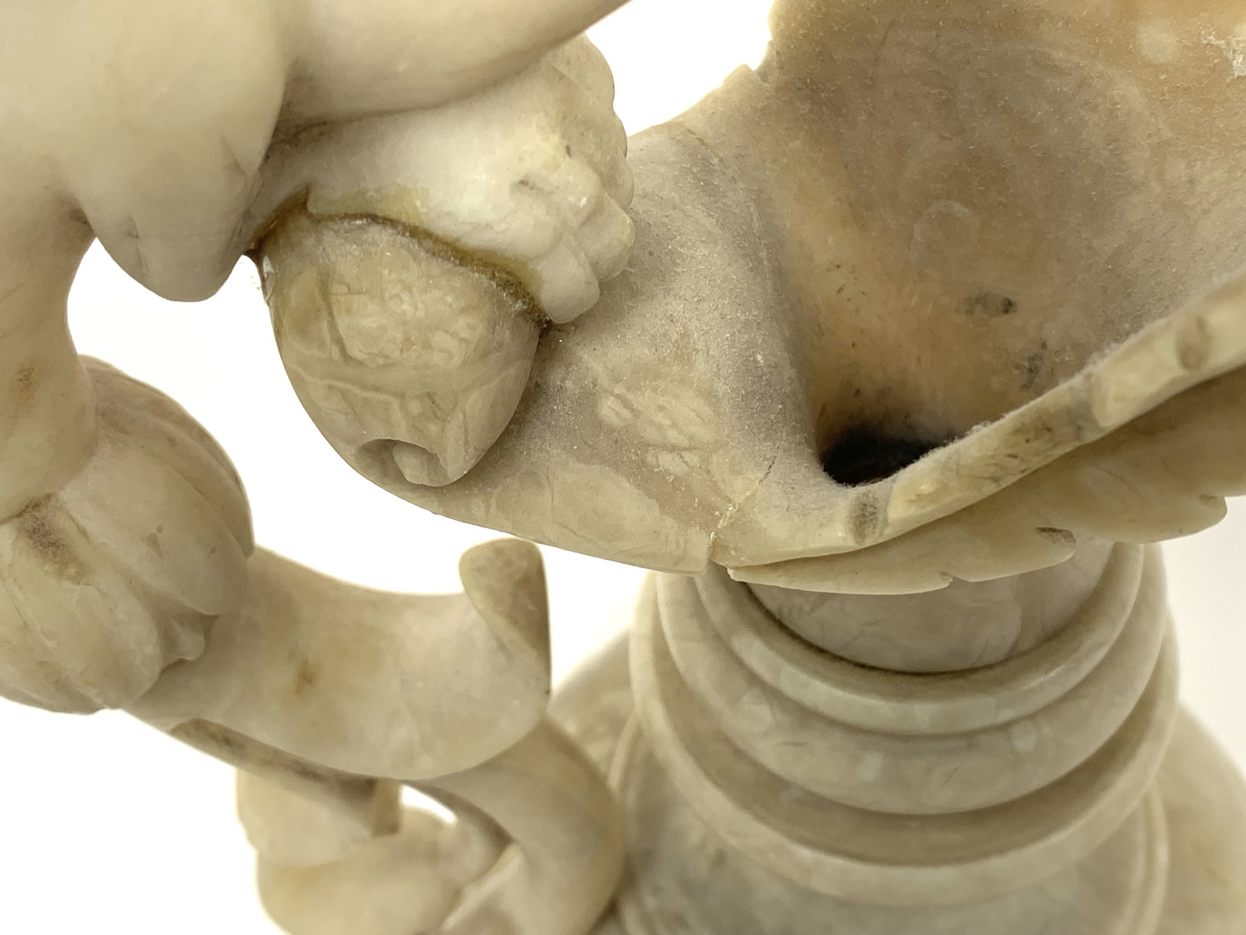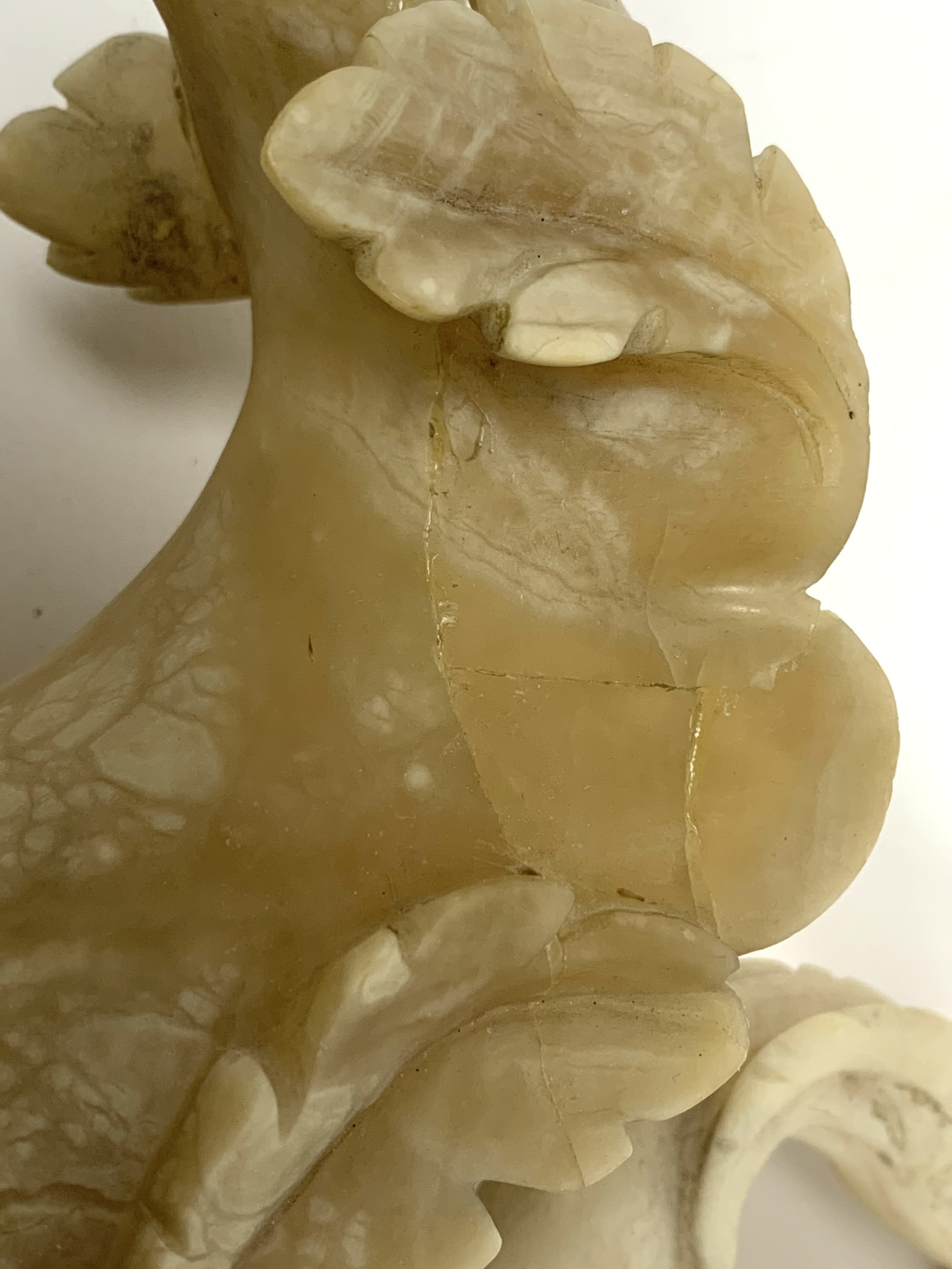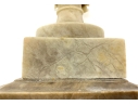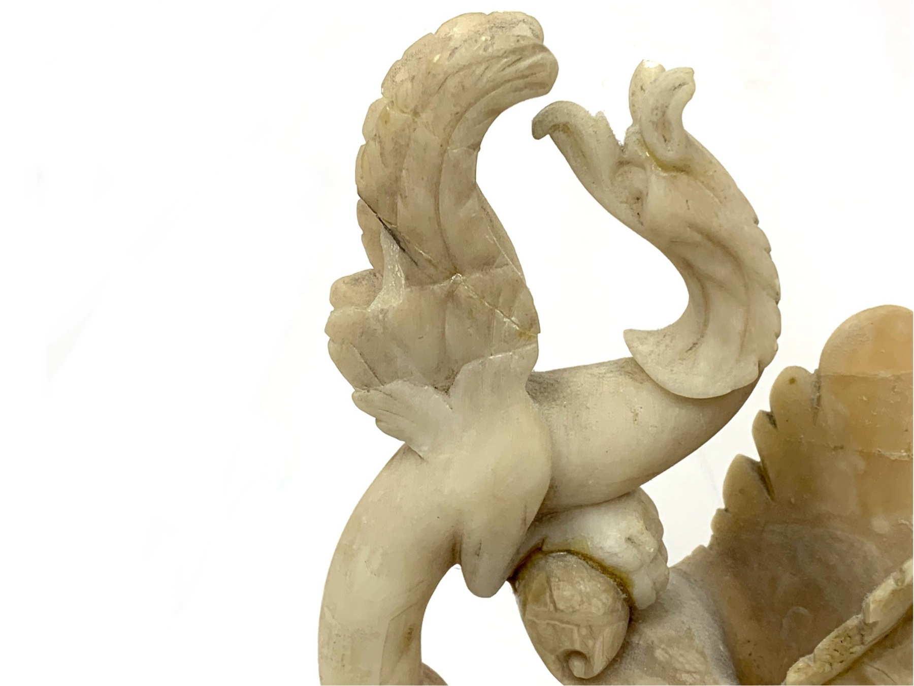 The ewer is carved from alabaster and features a large handle in the shape of a mythical bird or griffin.