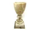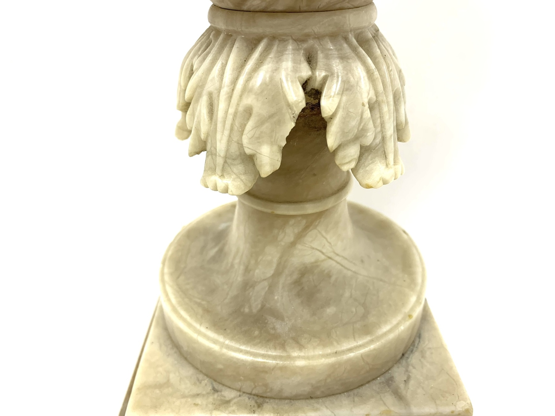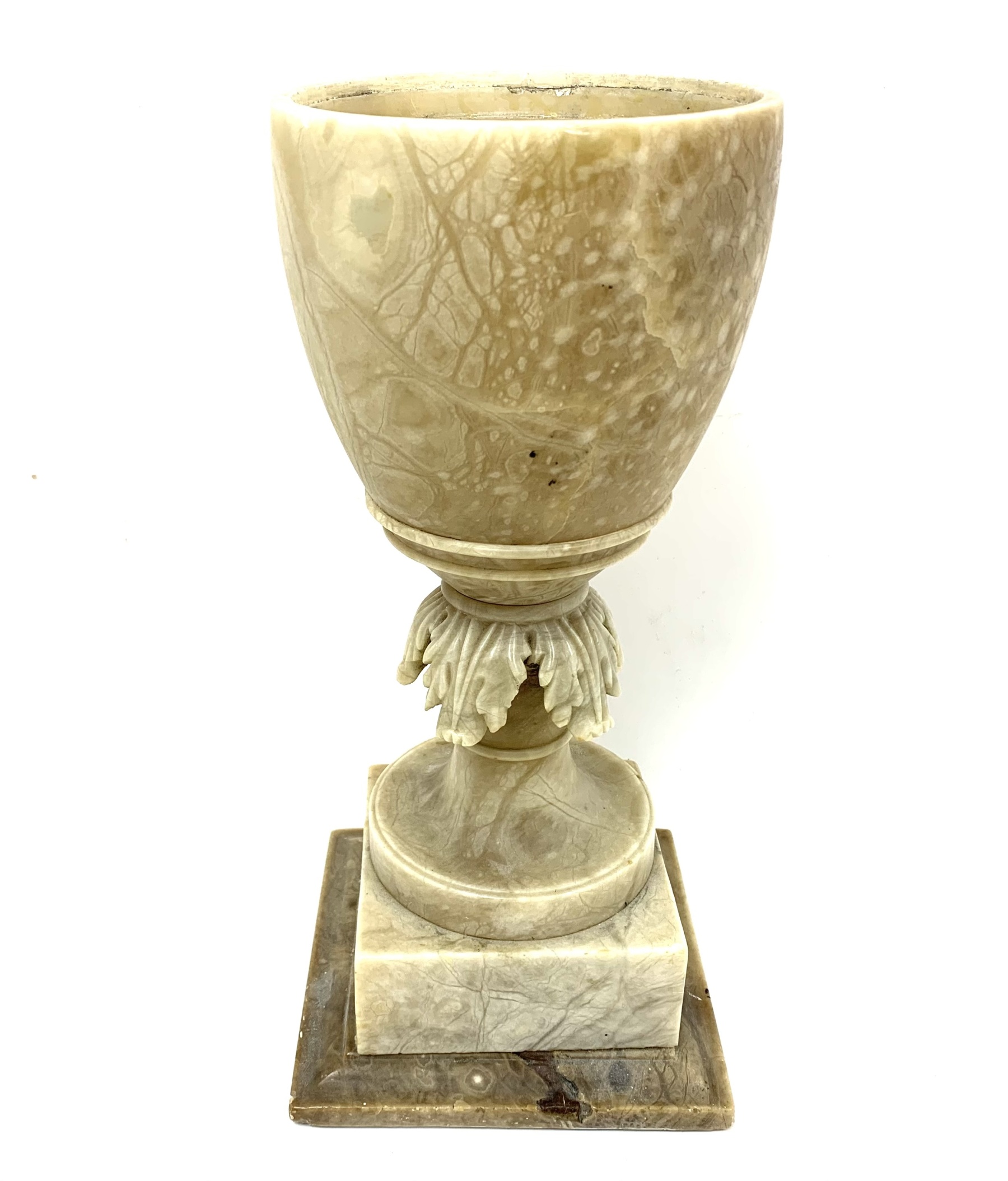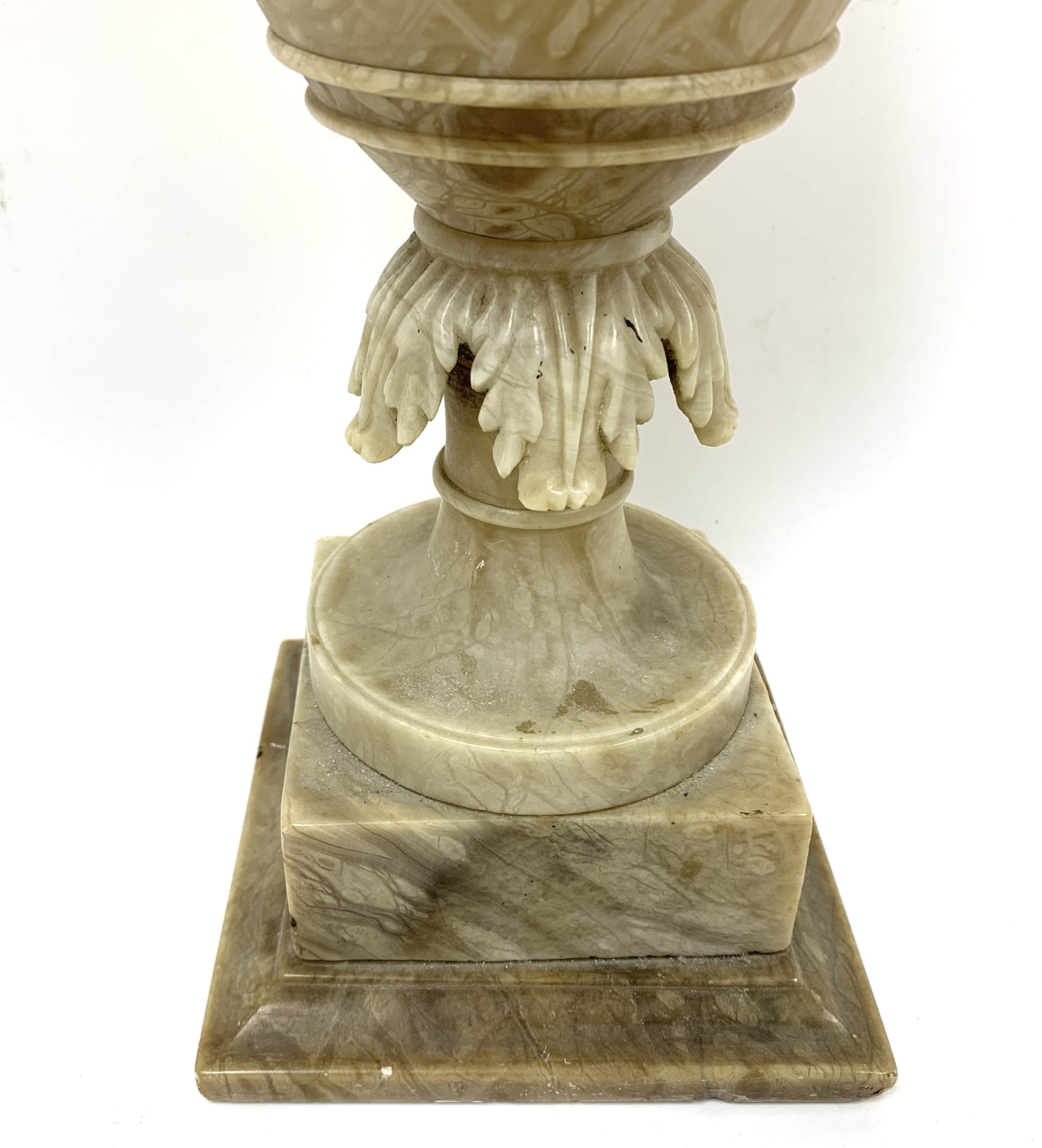 The body of the vase is decorated with carved foliage and rests upon a tiered square plinth base.
