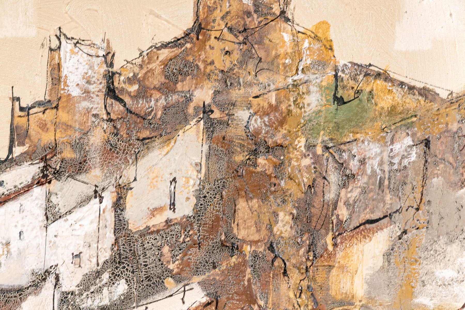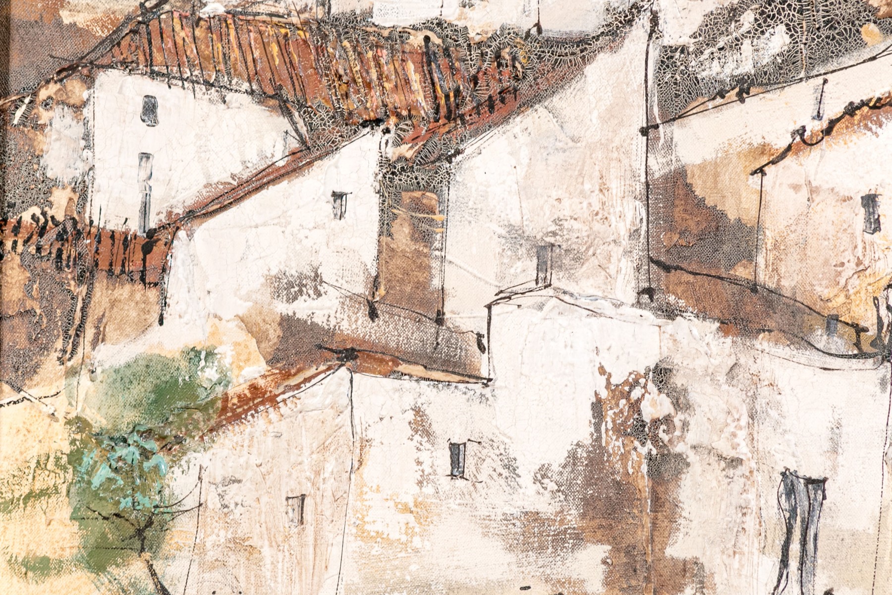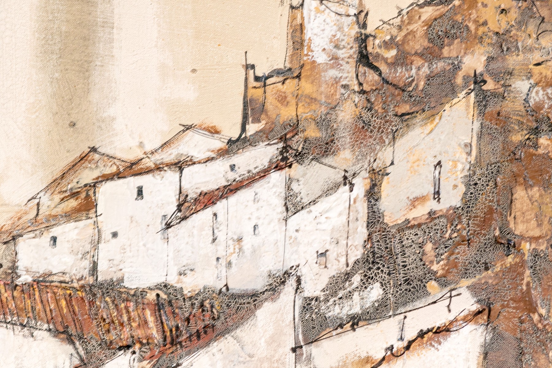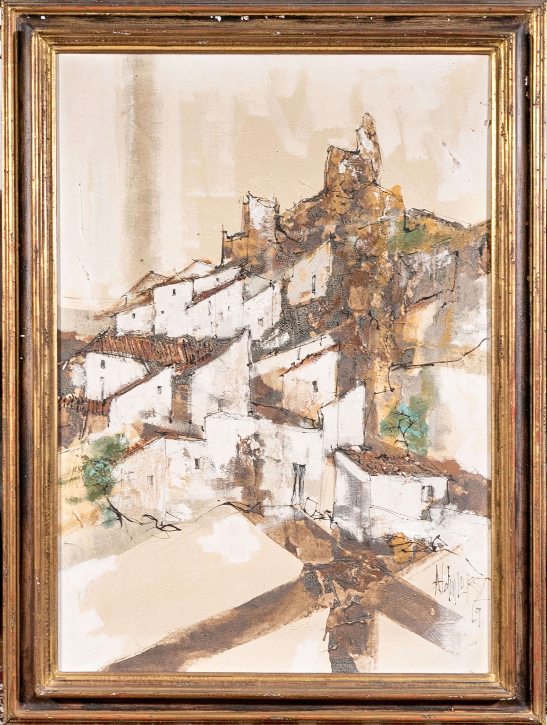 Signed and dated 69 lower right. A textured work featuring a town of white washed houses with reddish- brown roofs on a hill top. Presented in a painted and gilt wood frame.