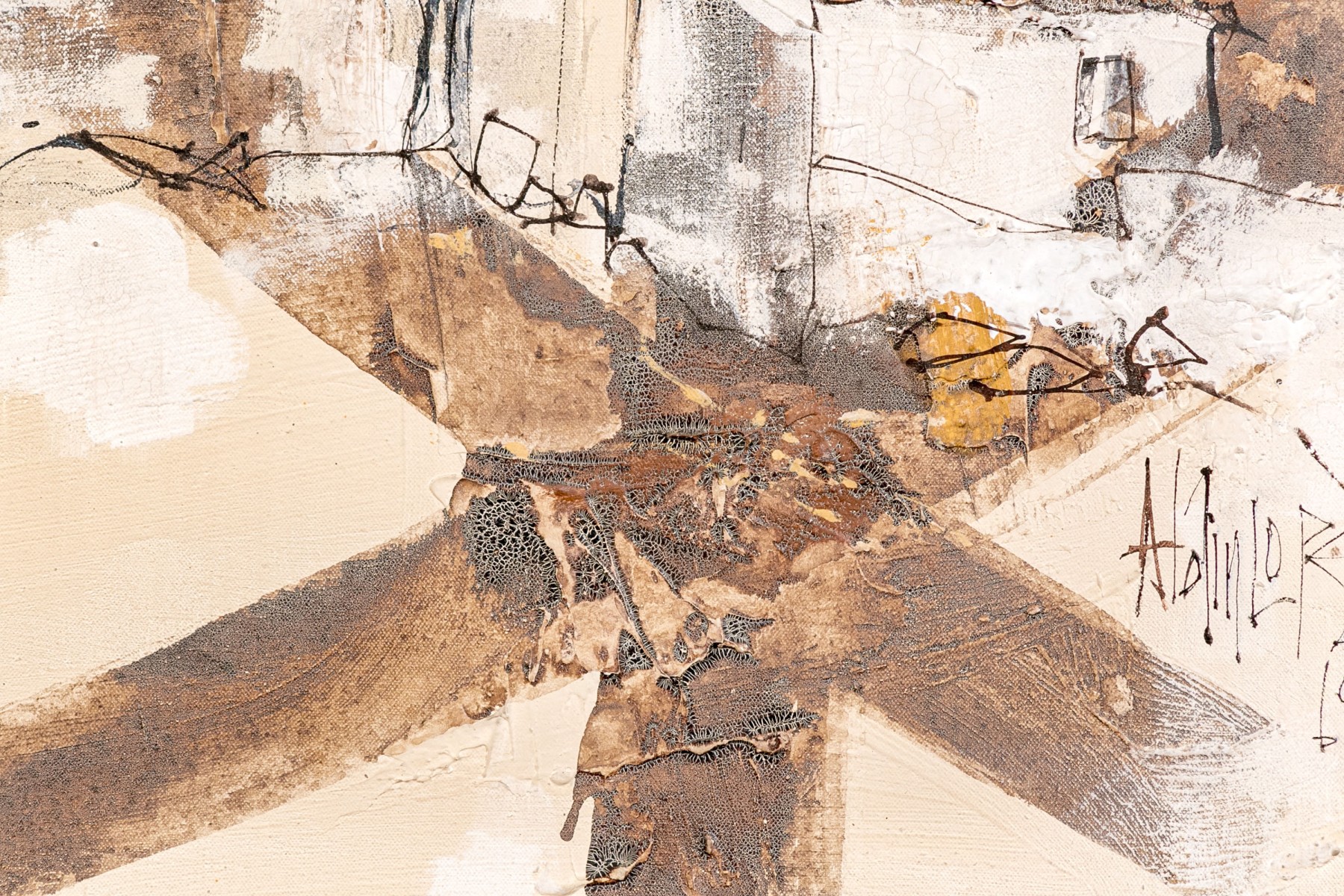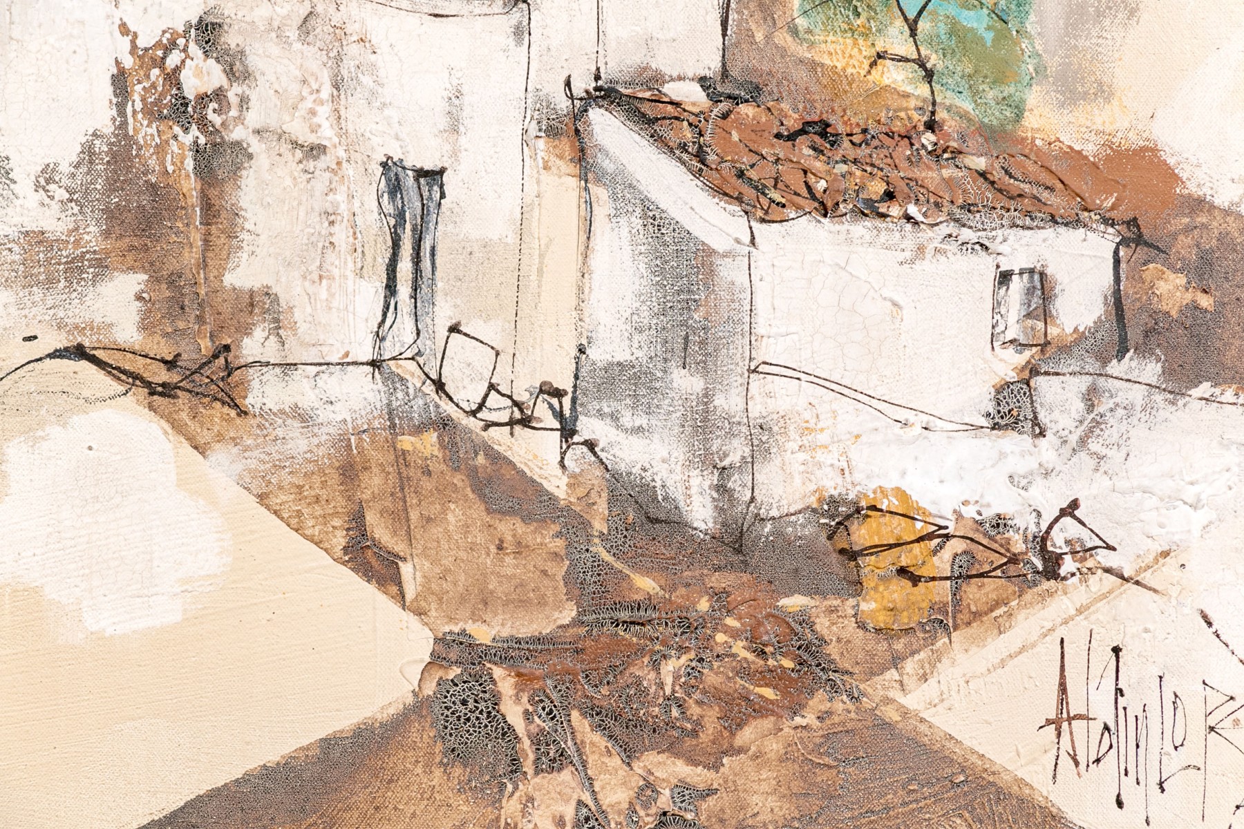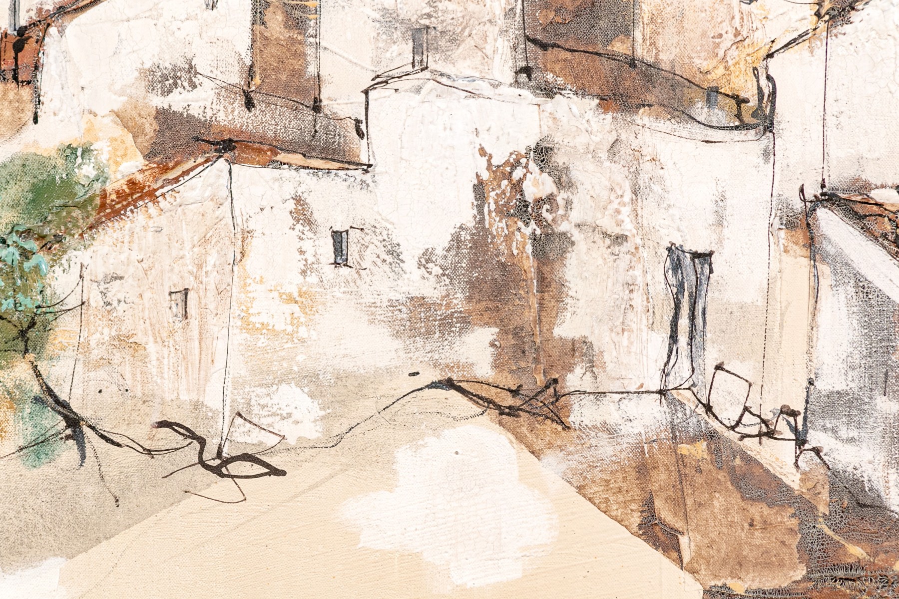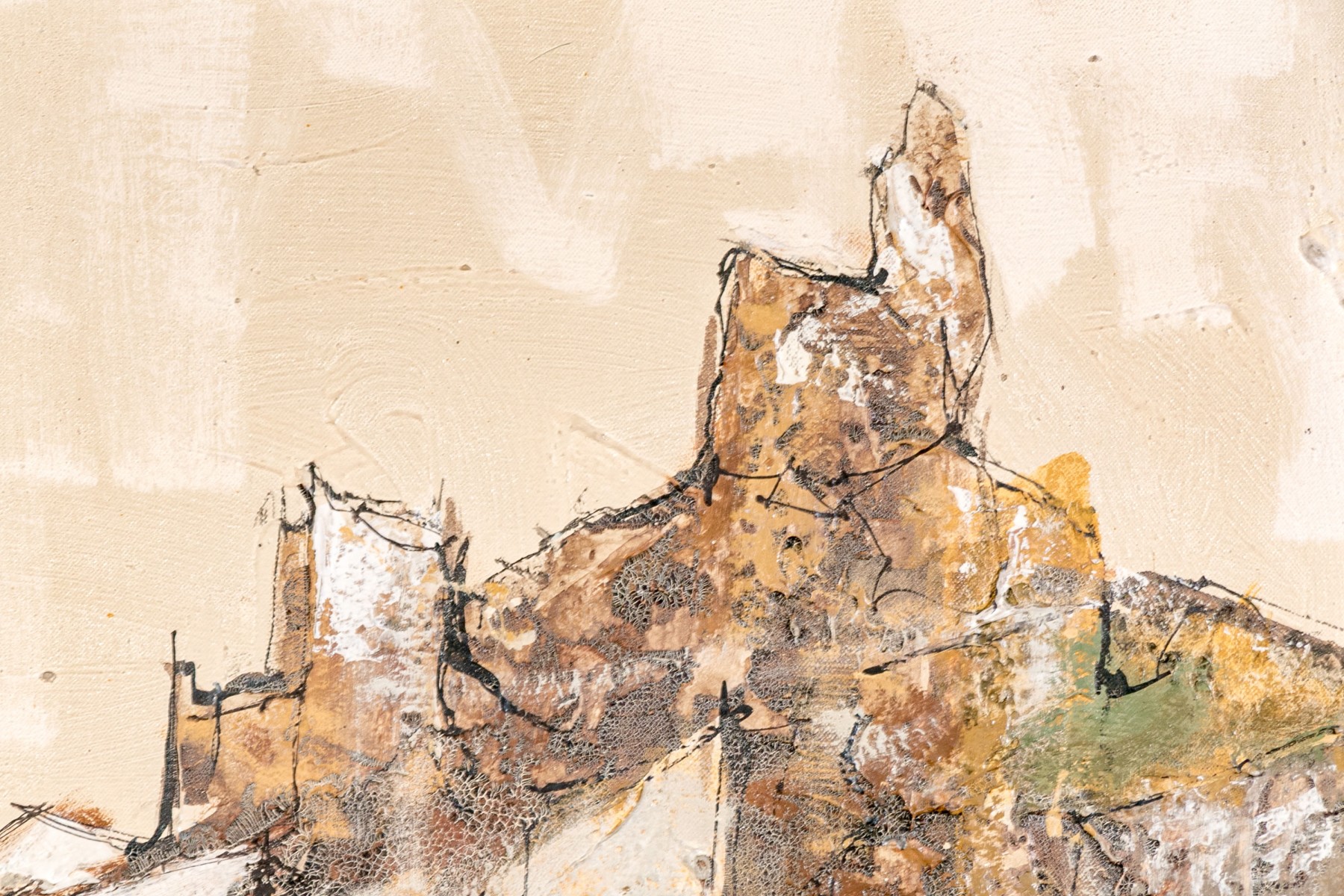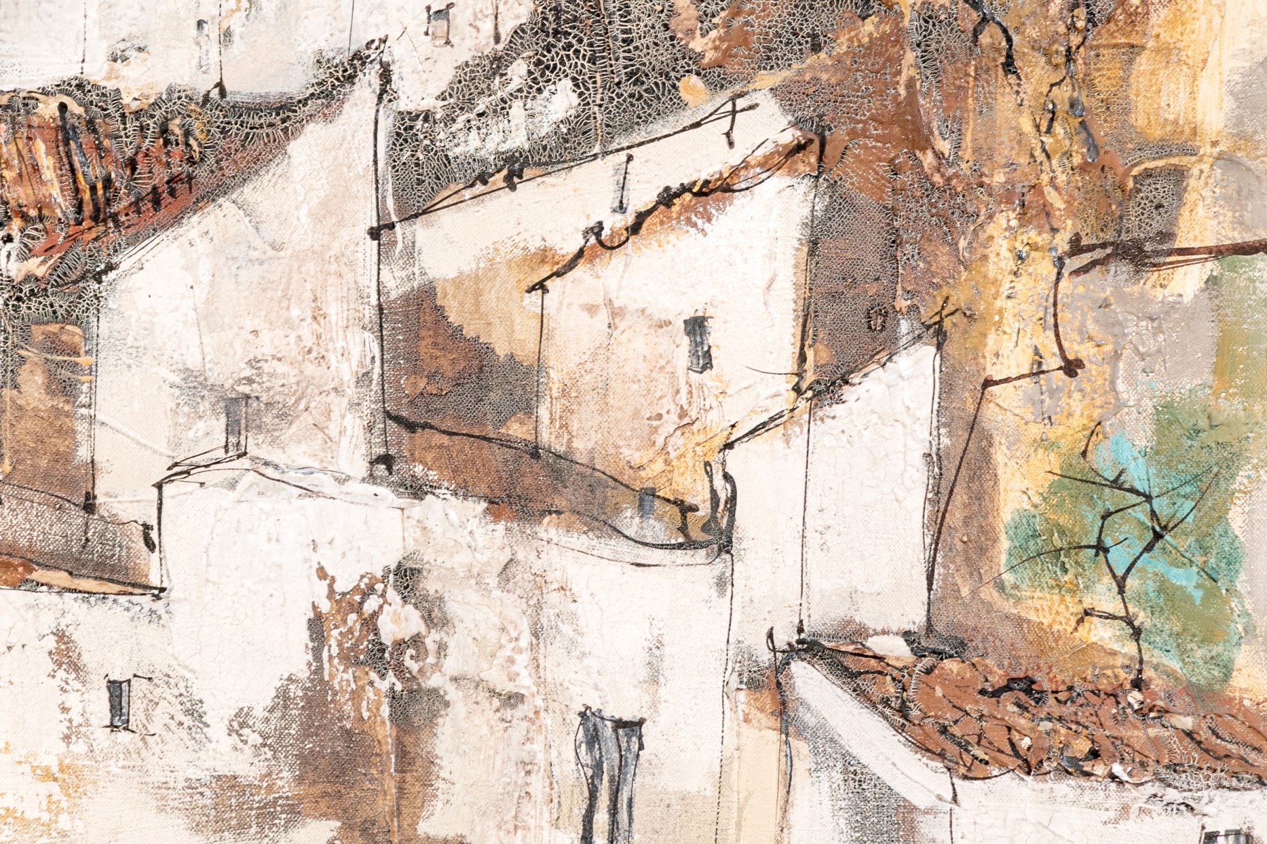 Signed and dated 69 lower right. A textured work featuring a town of white washed houses with reddish- brown roofs on a hill top. Presented in a painted and gilt wood frame.