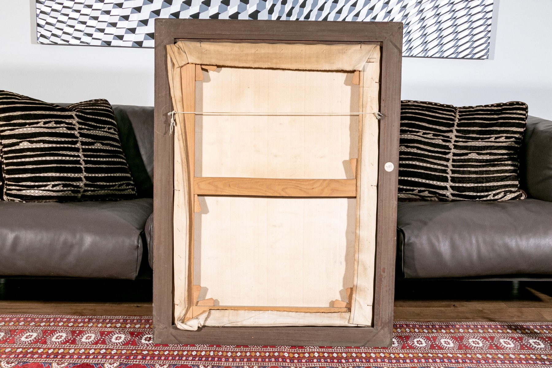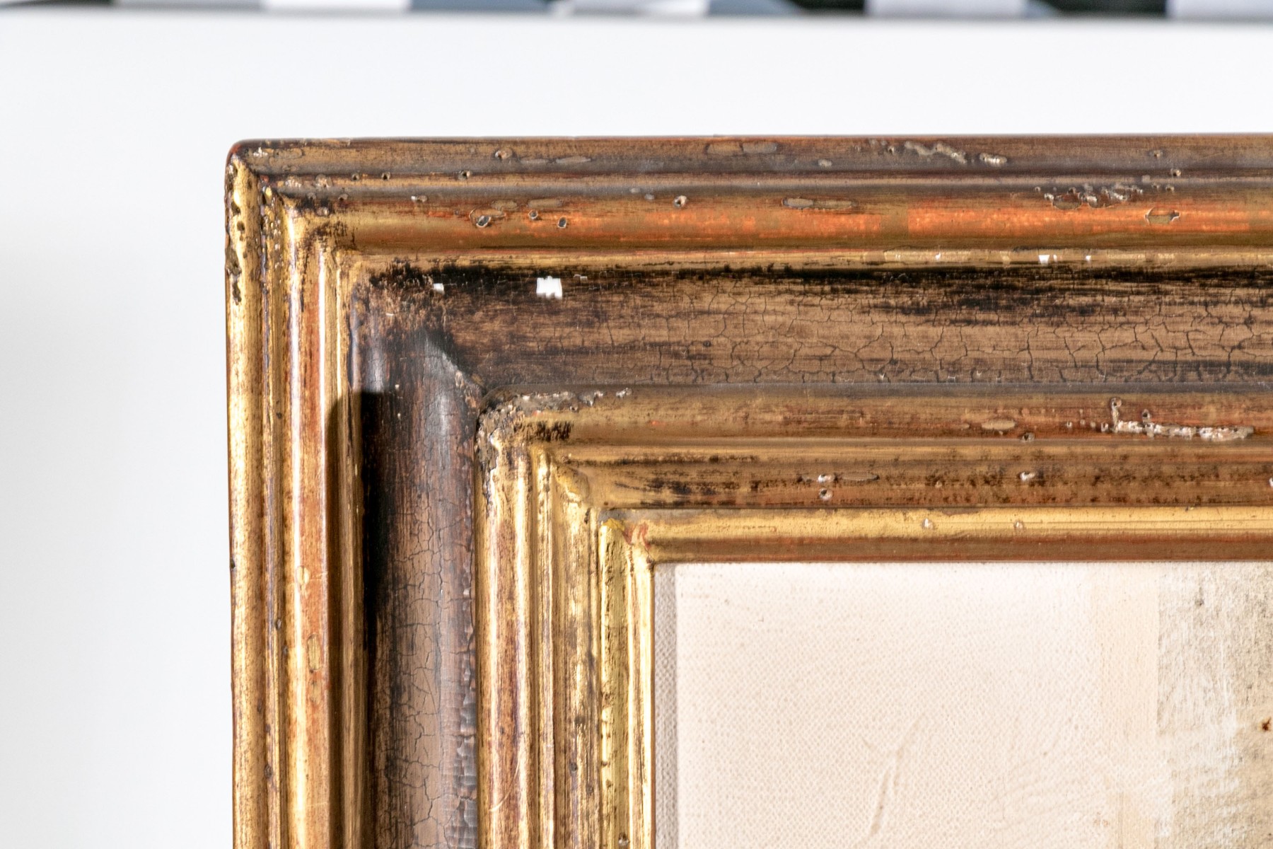 Condition: good textures, some stable cracquelure to the center black areas, some scrapes and paint losses to the frame. Please review the photos as they are part of the condition report.