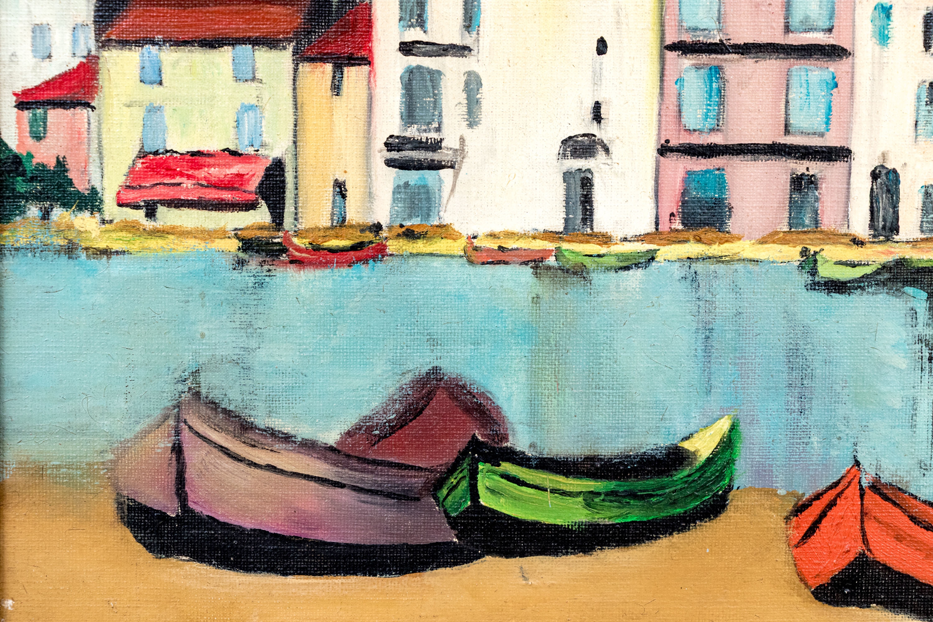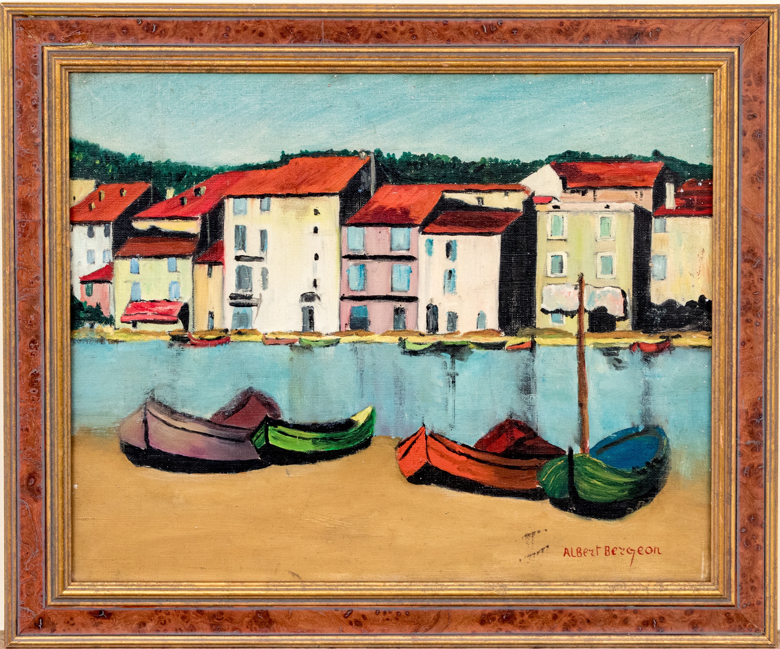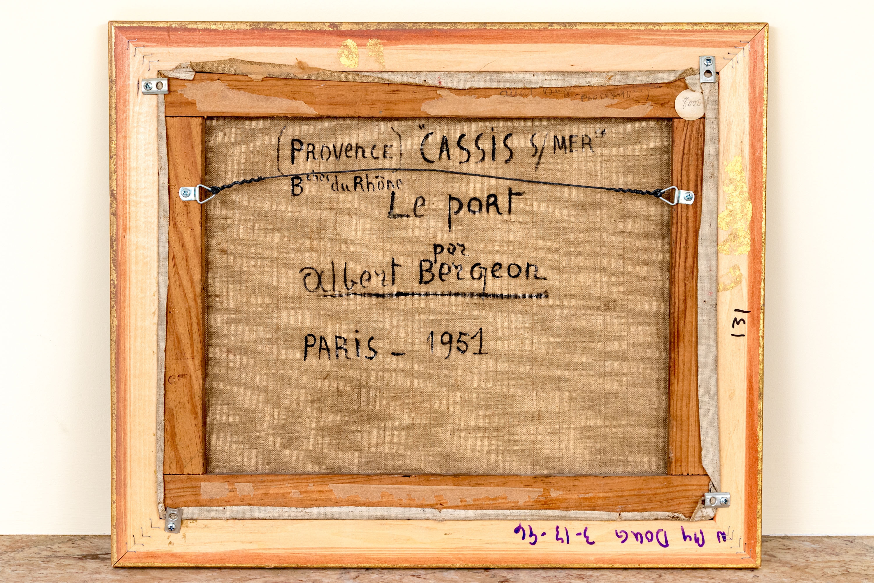 Albert Bergeon (Belgian, 20th C.) "Cassis S/Mer" oil painting on canvas depicting a view of colorful boats along a calm waterway leading to a cityscape along a horizon of dark green canopies under a clear sky. Signed lower right. Labeled on the canvas verso: (Provence) Bouches-du-Rhône, "Cassis S/MER" (sur-mer, "on the sea"), Le Port Par Albert Bergeon, Paris-1951."