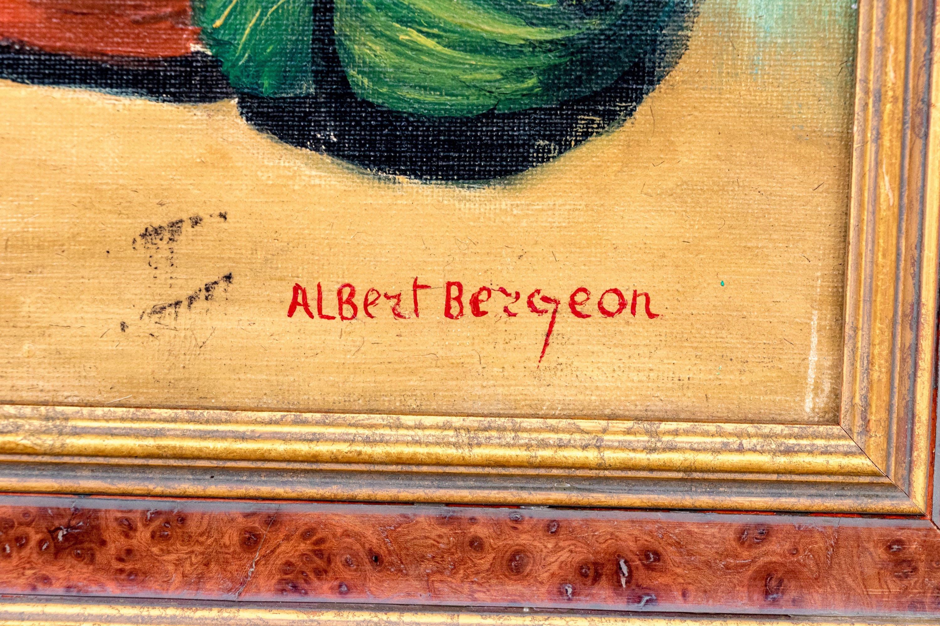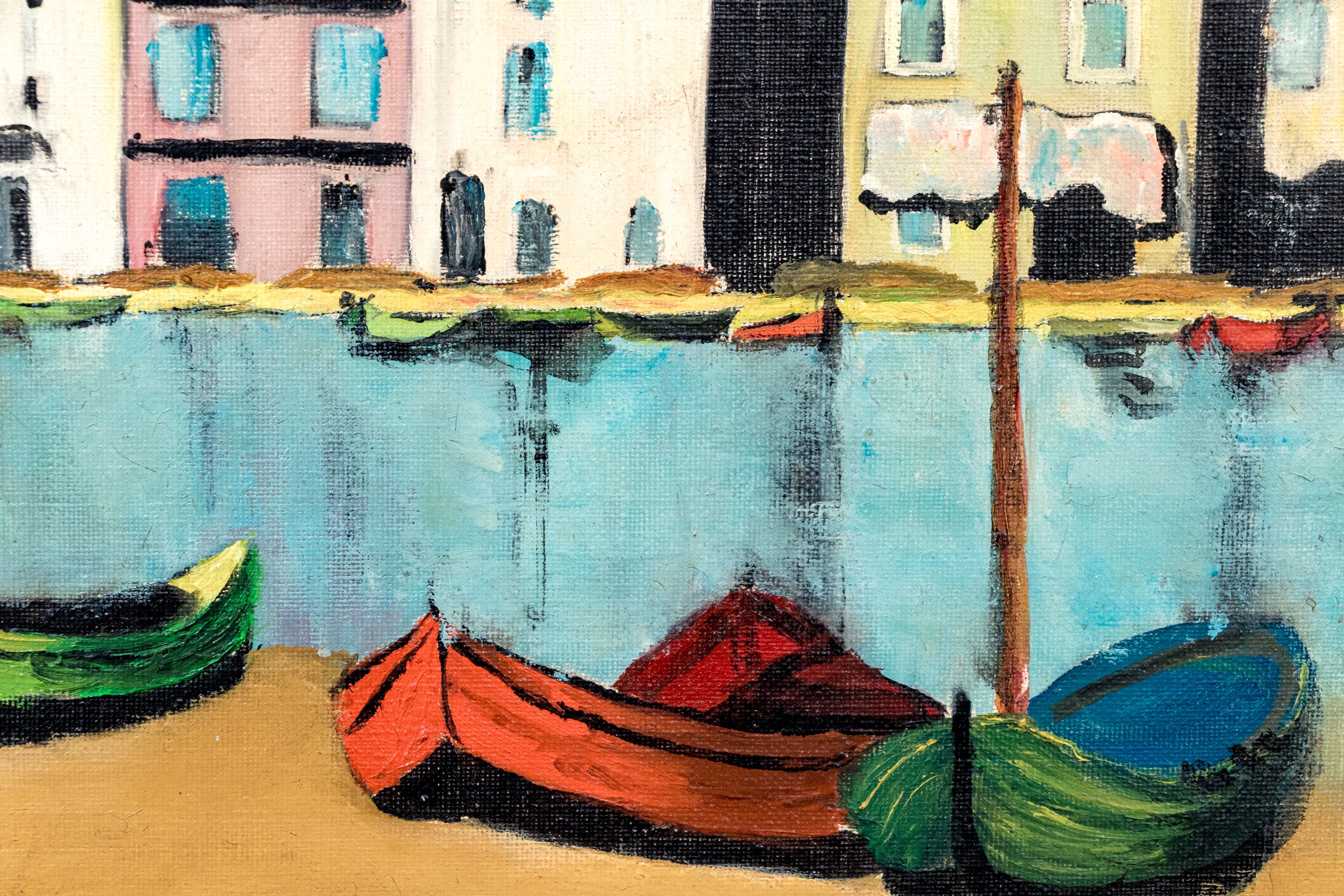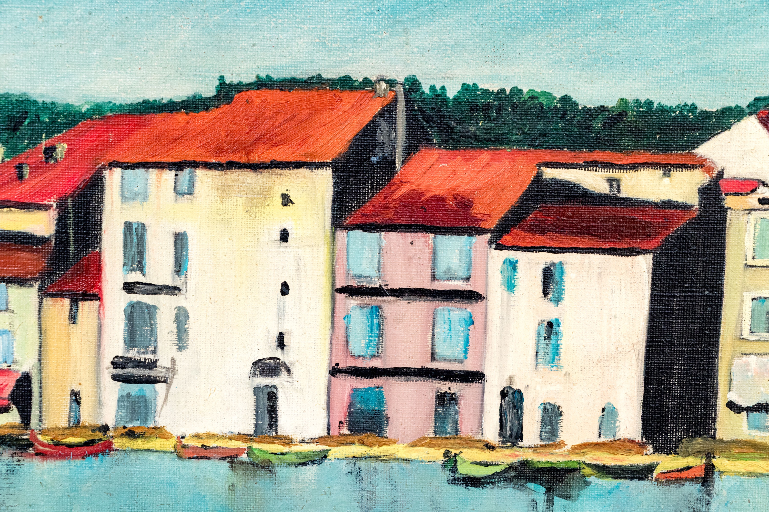 Albert Bergeon (Belgian, 20th C.) "Cassis S/Mer" oil painting on canvas depicting a view of colorful boats along a calm waterway leading to a cityscape along a horizon of dark green canopies under a clear sky. Signed lower right. Labeled on the canvas verso: (Provence) Bouches-du-Rhône, "Cassis S/MER" (sur-mer, "on the sea"), Le Port Par Albert Bergeon, Paris-1951."