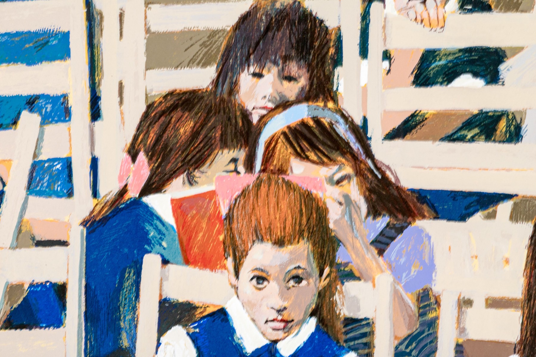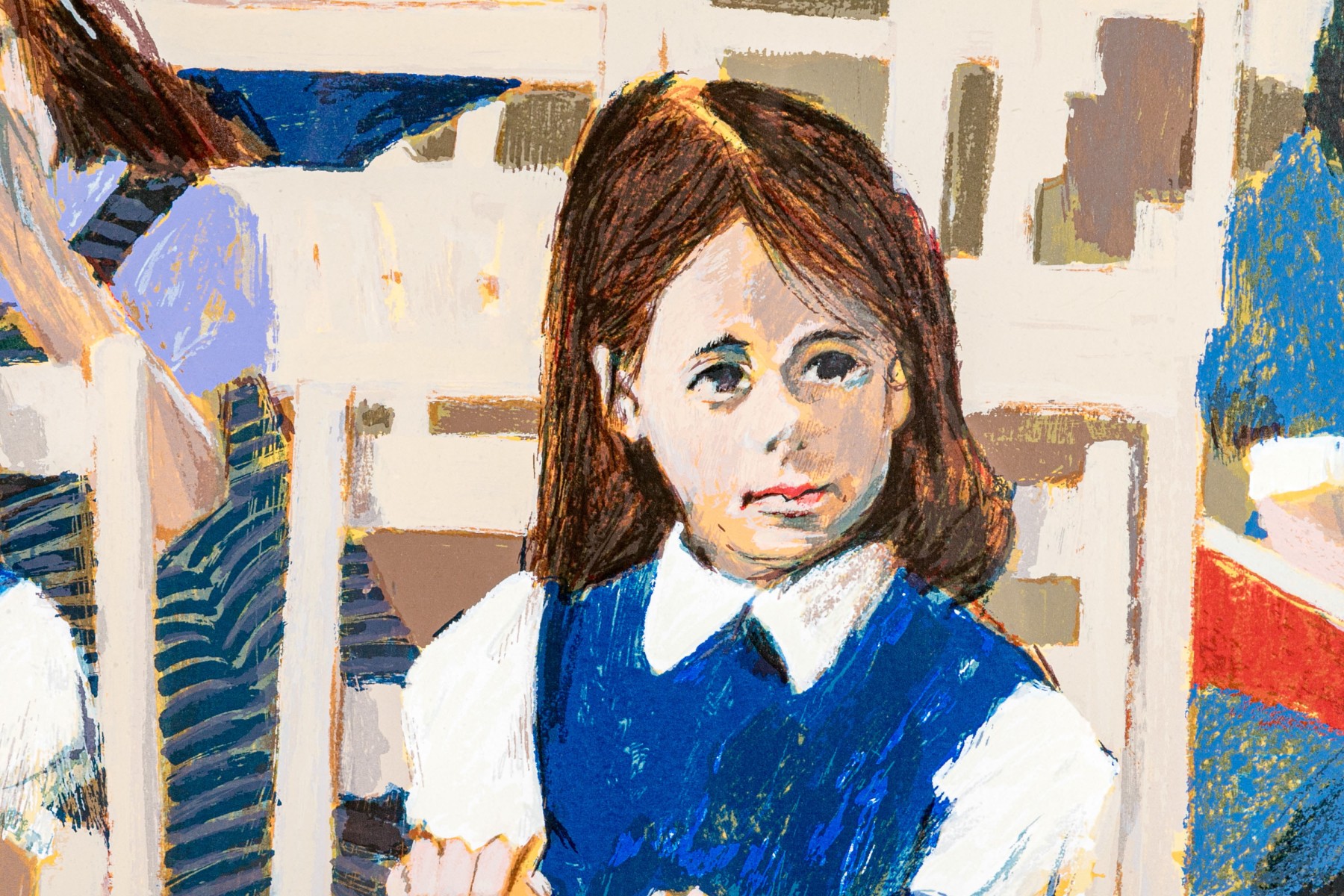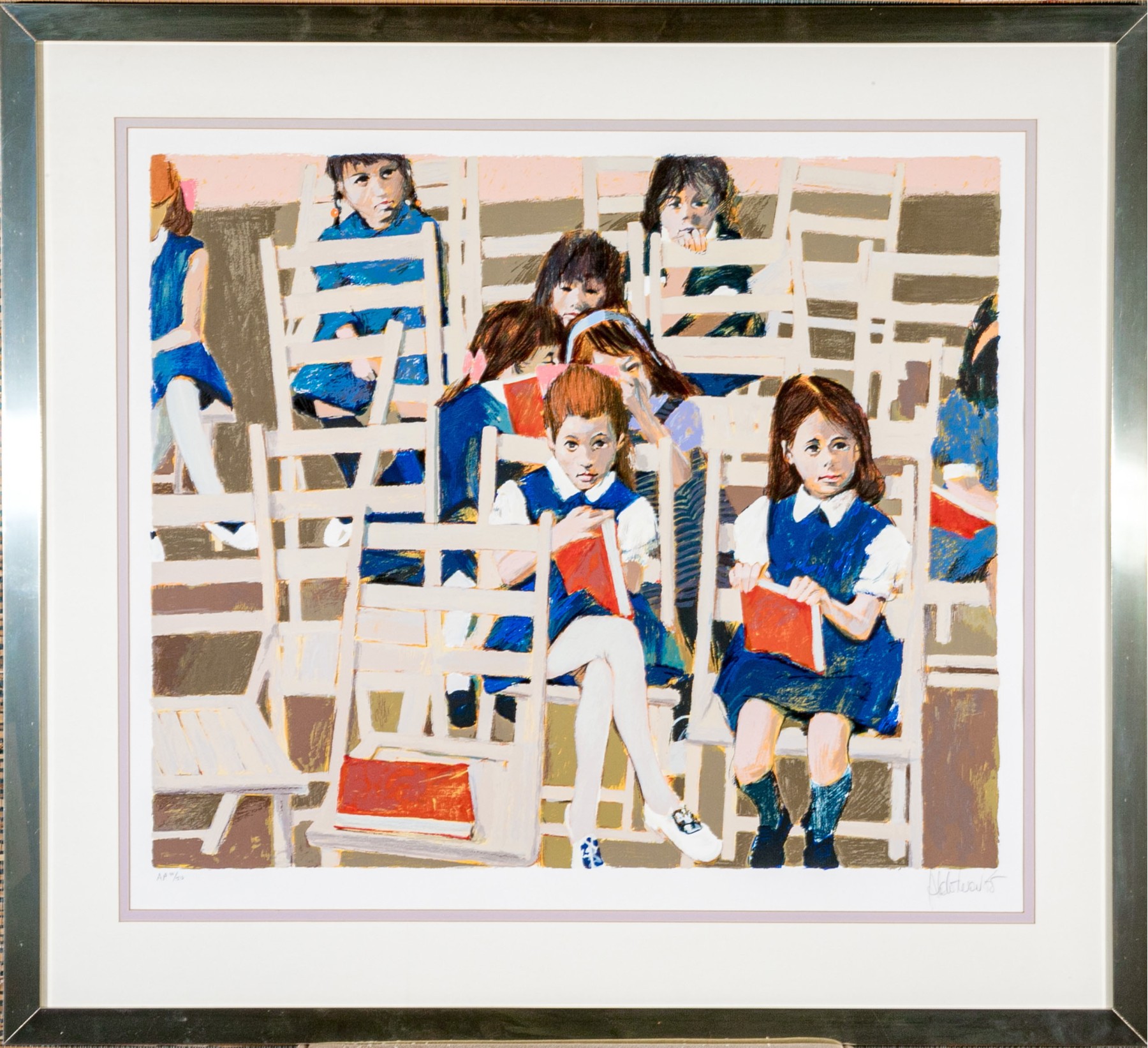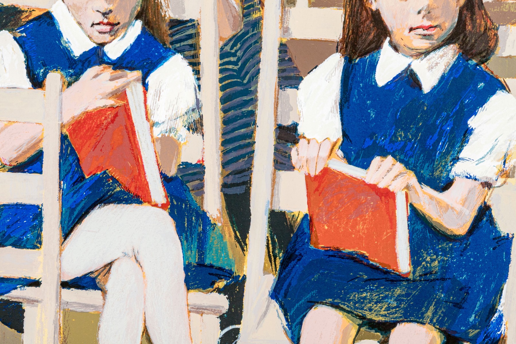 Artist proof depicting a group of little girls in uniforms seated in white chairs and holding their red books.