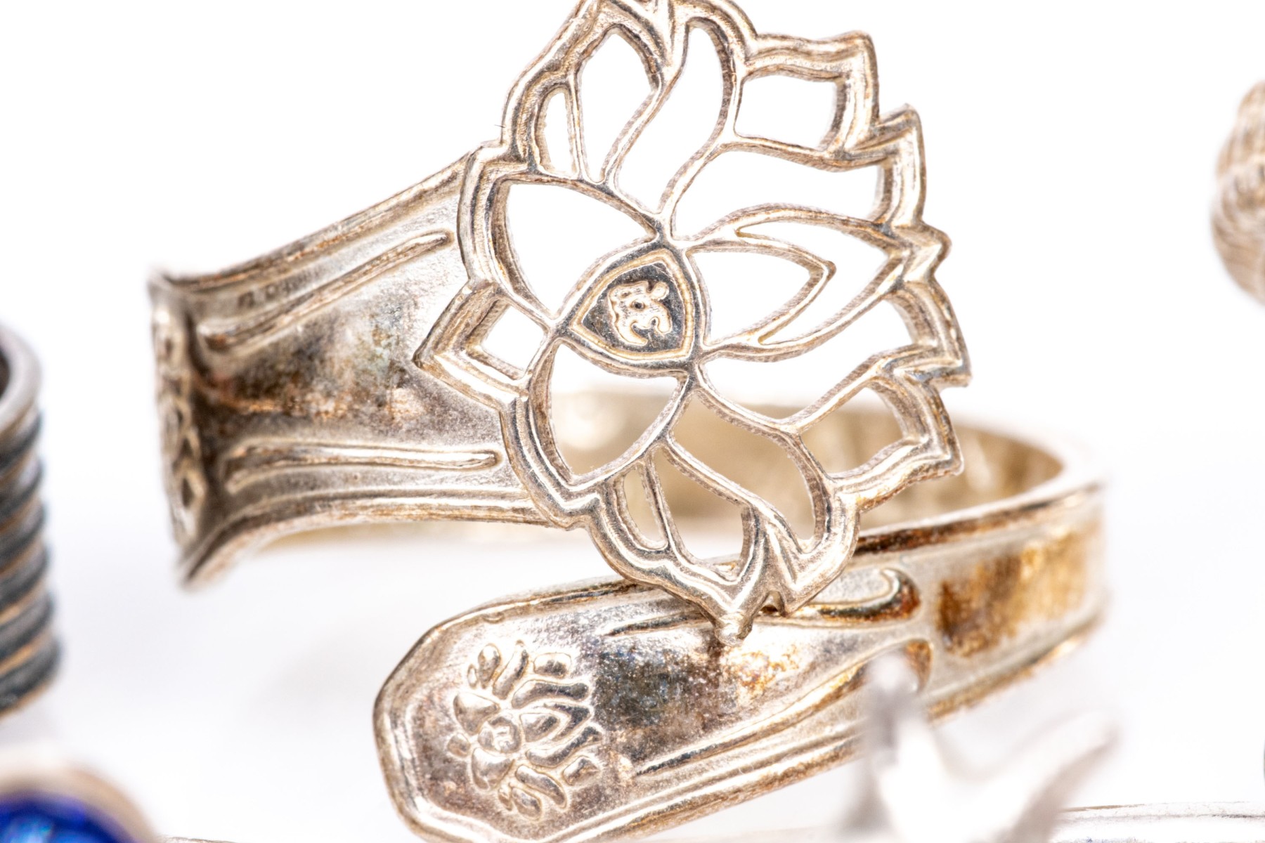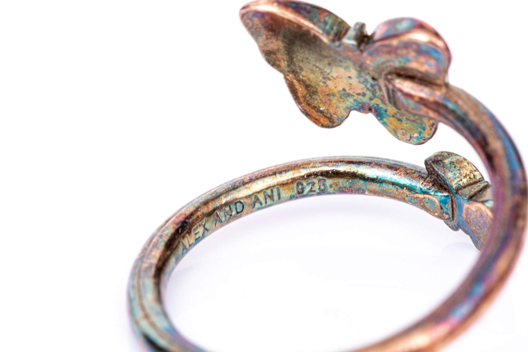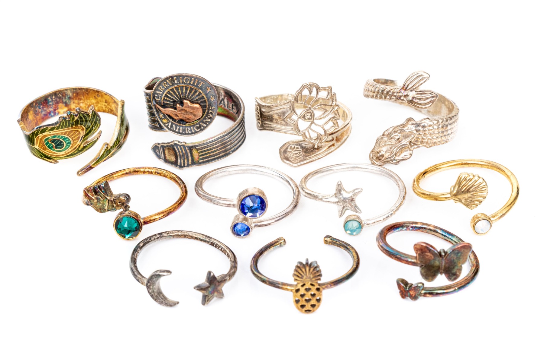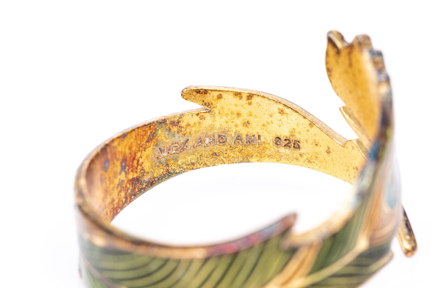 Collection of sterling silver and sterling silver vermeil Alex + Ani adjustable rings, featuring two rings with beach motifs, one peacock feather with enamel, one moon and star, one bedazzled, one lotus, two animal, one butterfly, one pineapple and one cigar band style