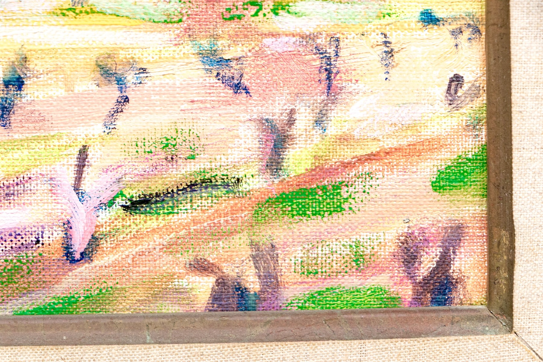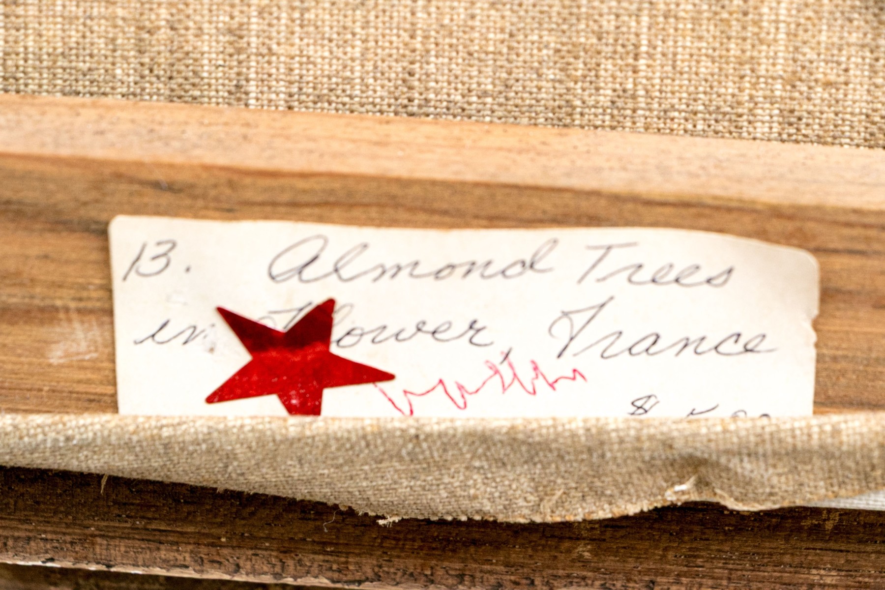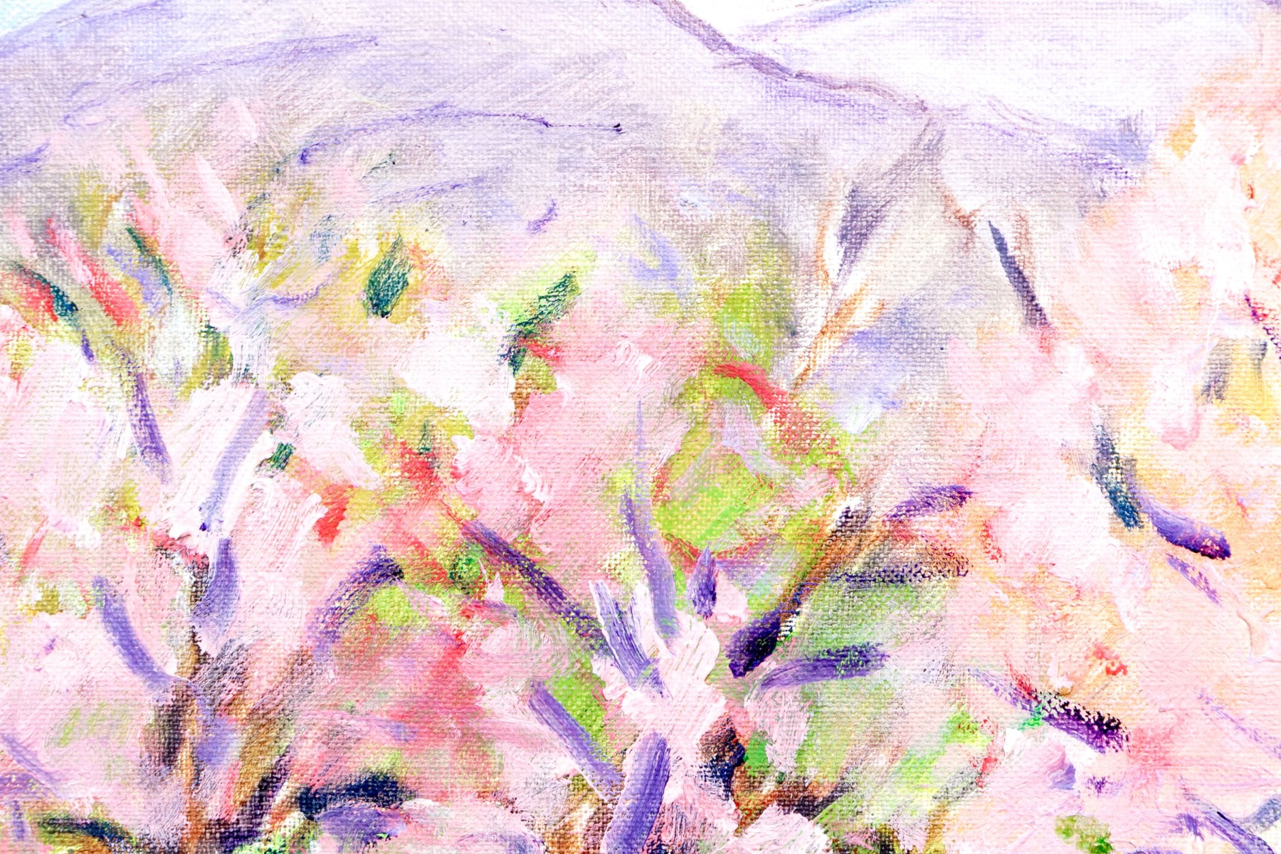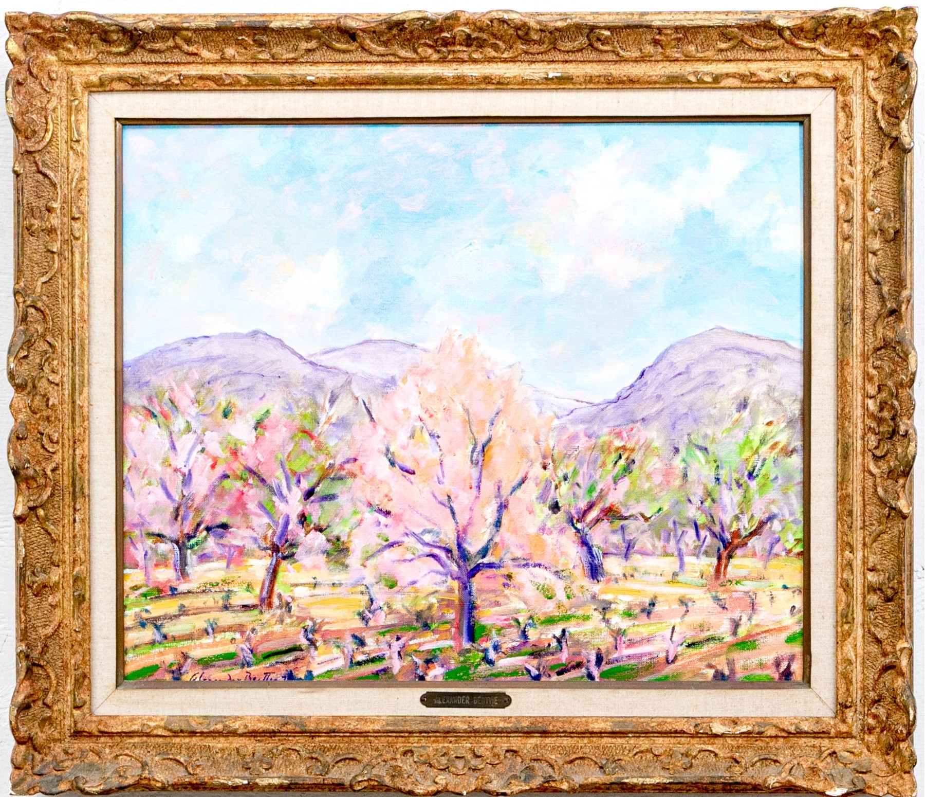 Signed lower left; additionallly the frame has a brass name plaque. The painting is fabulously painted in the Impressionist manner depicting a landscape with rolling mountainous hills in the background and a grove of trees in bloom with pink and green foliate and fence in the foreground.