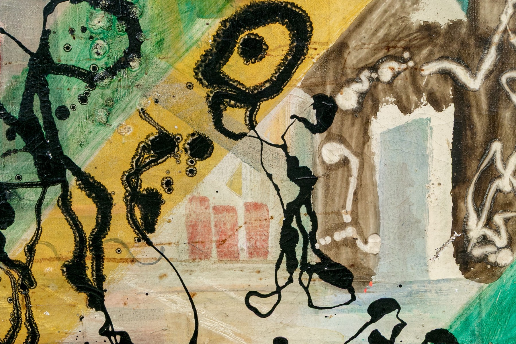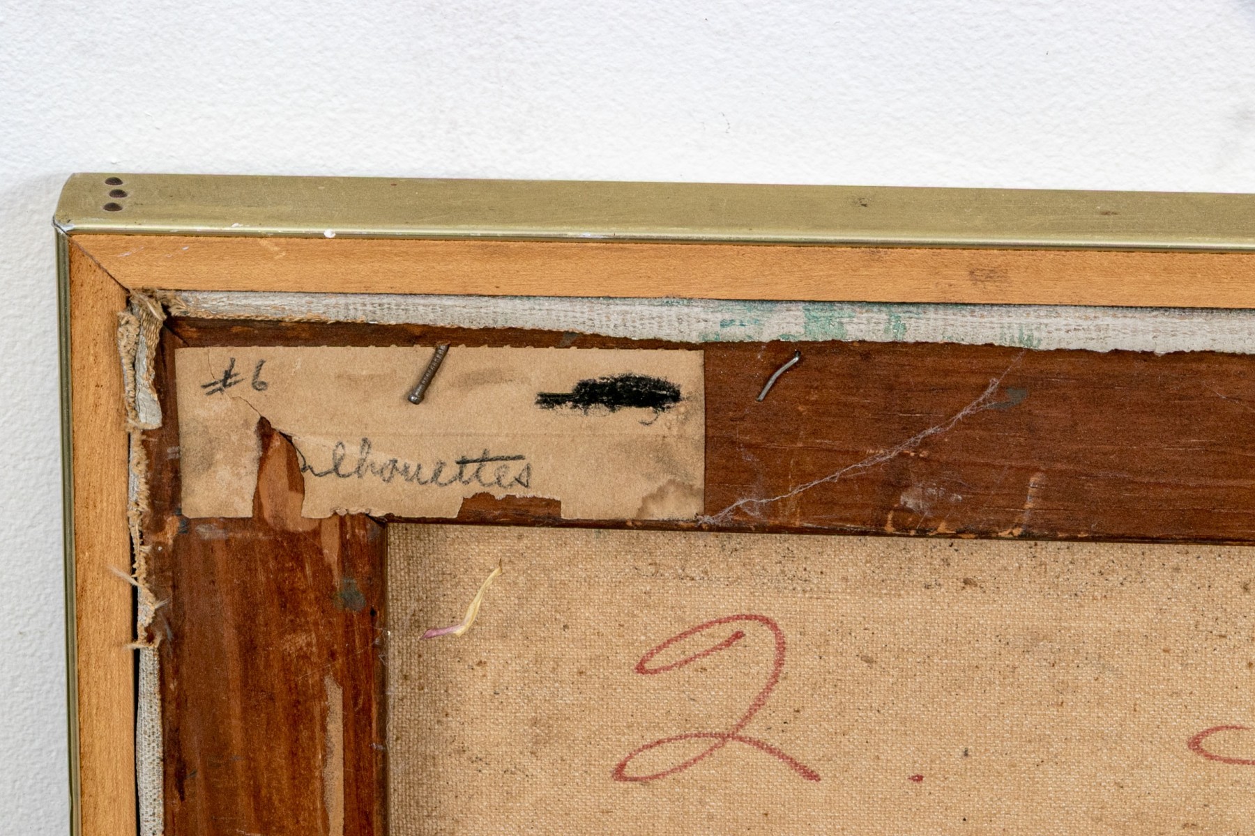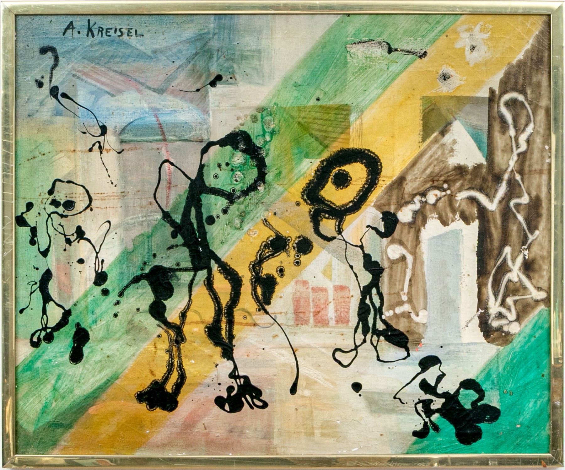 Alexander Kreisel (Russian-American, 1901-1953) "Silhouettes" oil painting on canvas depicting an abstract expressionist scene of inky black figures in an urban landscape with suggested buildings in brown, teal, blue, and gray overlaid by striking diagonal bands in green and yellow. Signed upper left and titled on the verso.
