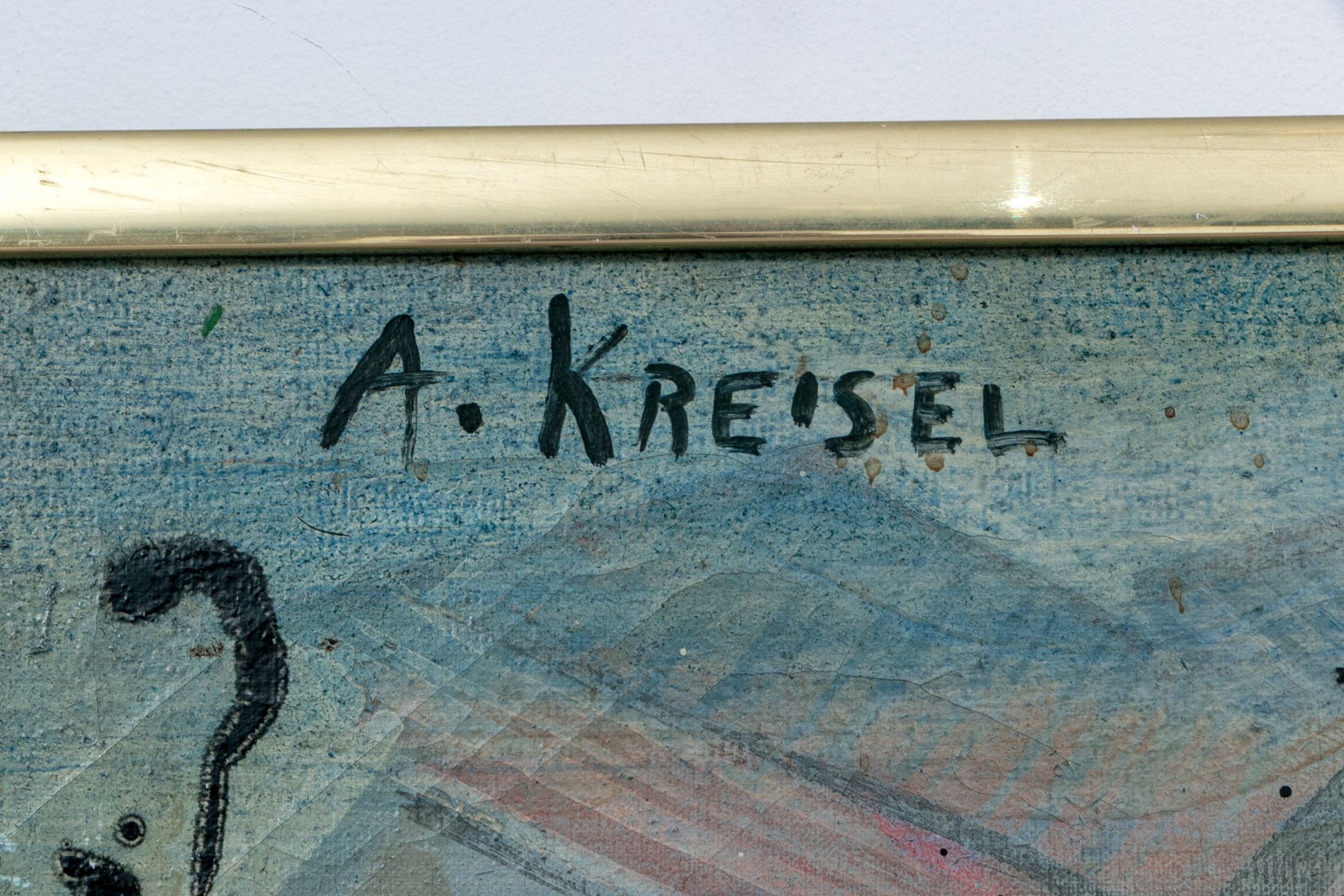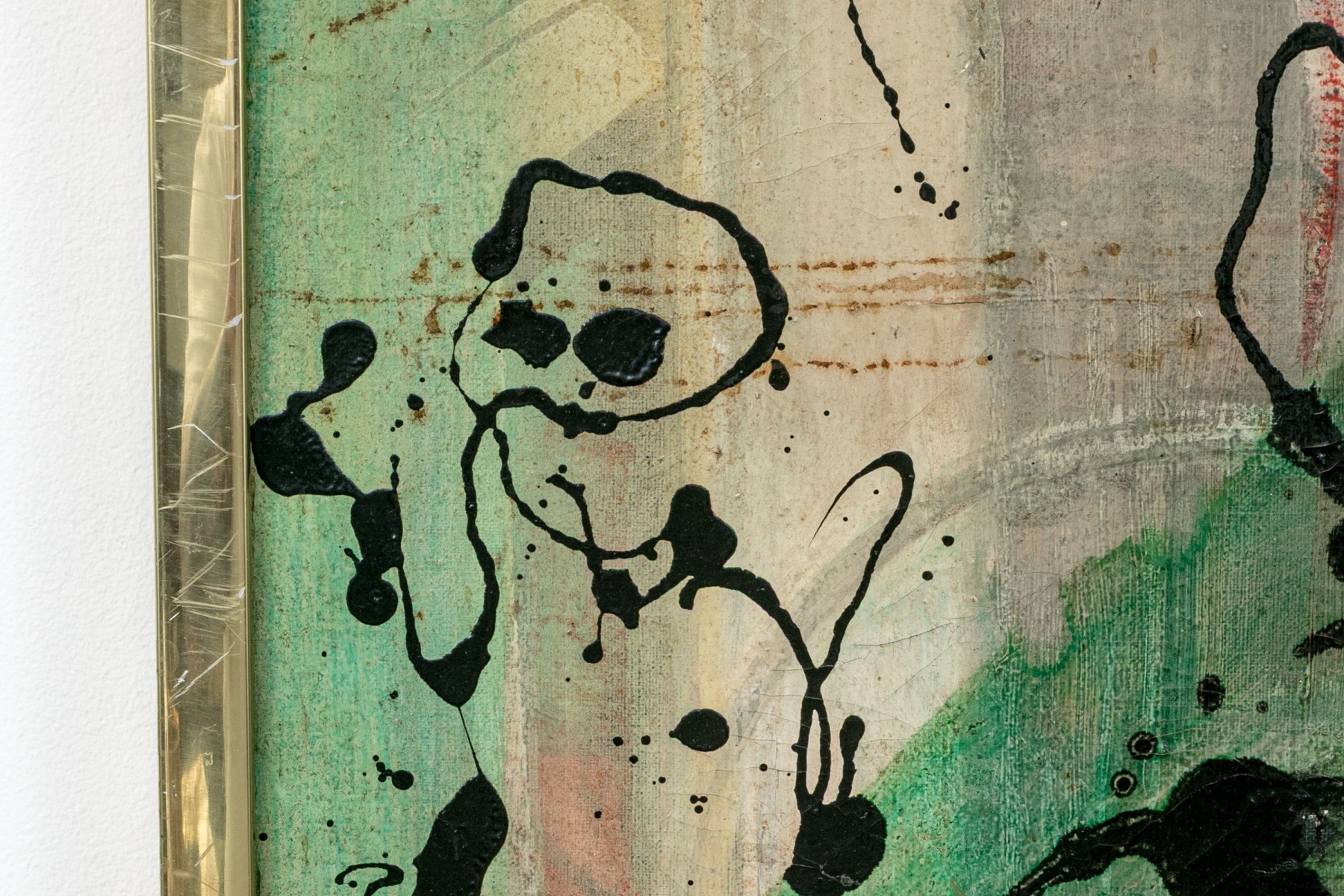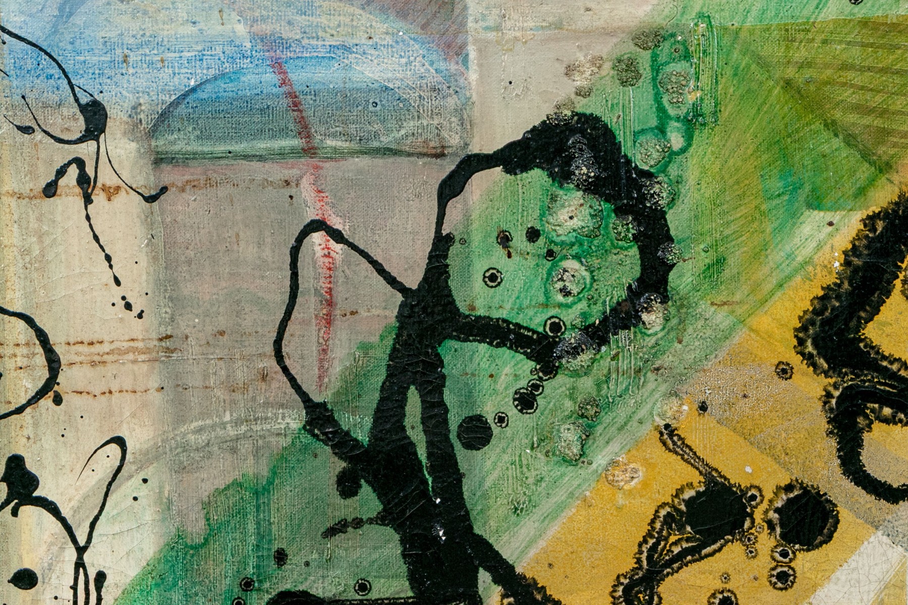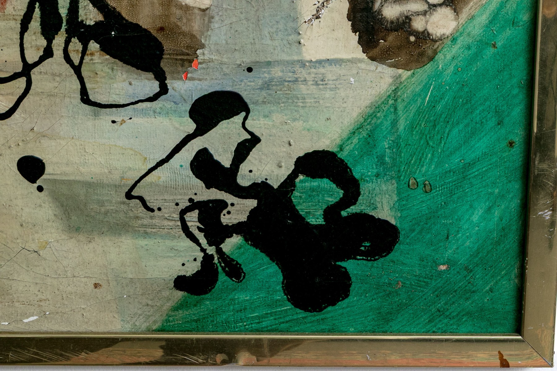 Alexander Kreisel (Russian-American, 1901-1953) "Silhouettes" oil painting on canvas depicting an abstract expressionist scene of inky black figures in an urban landscape with suggested buildings in brown, teal, blue, and gray overlaid by striking diagonal bands in green and yellow. Signed upper left and titled on the verso.