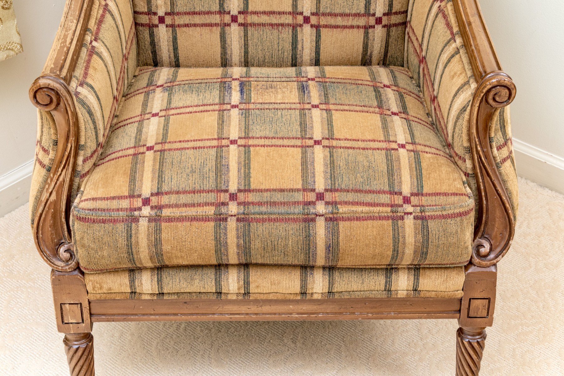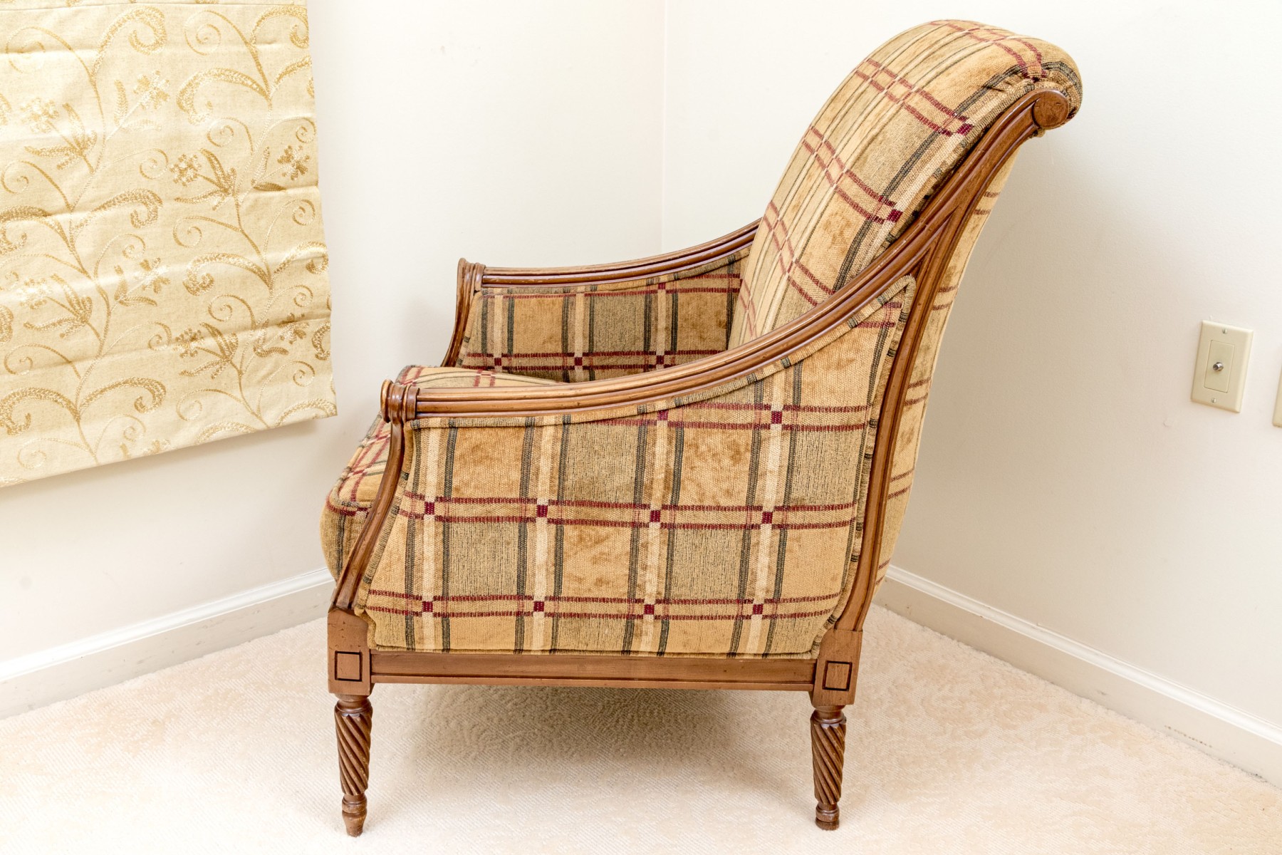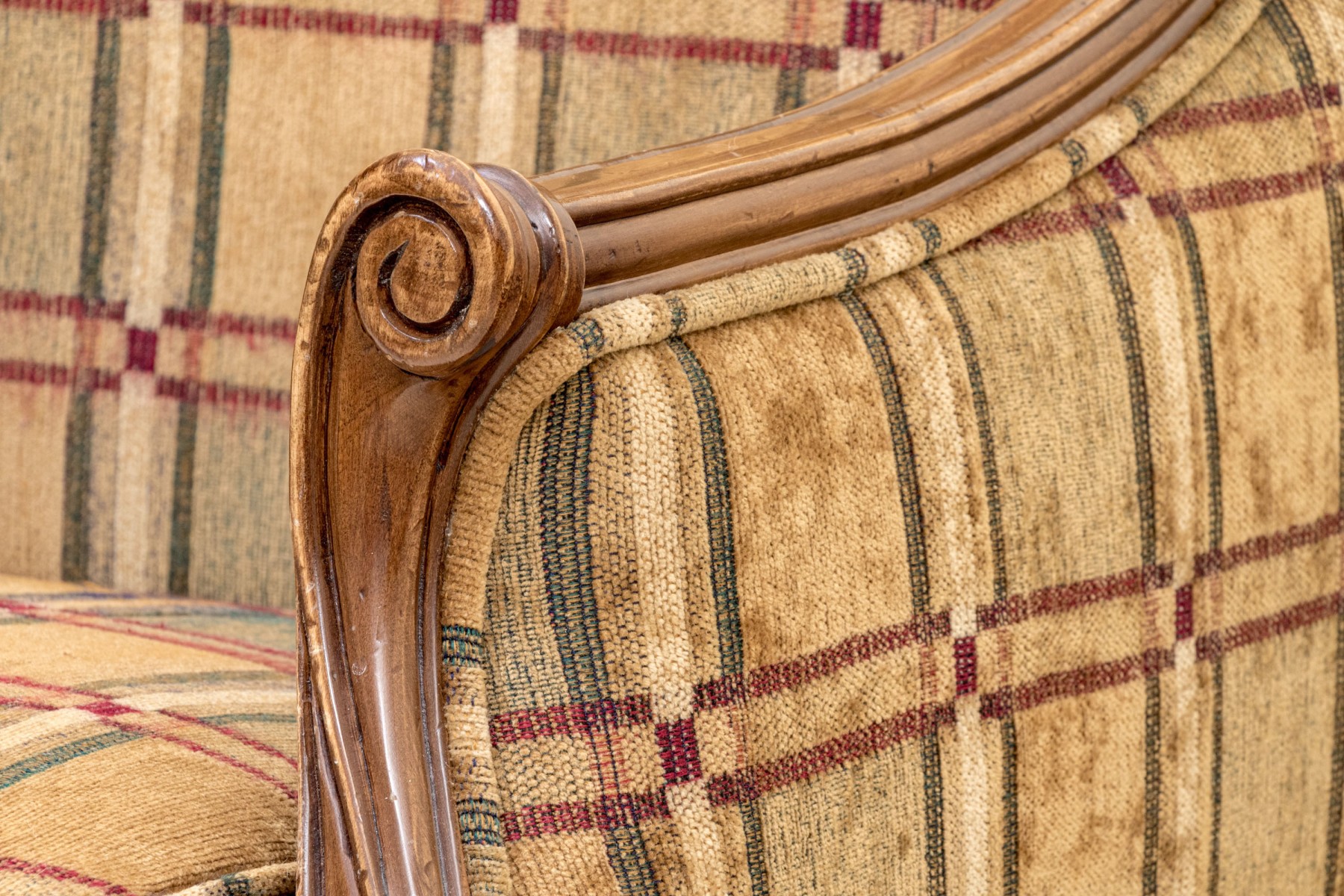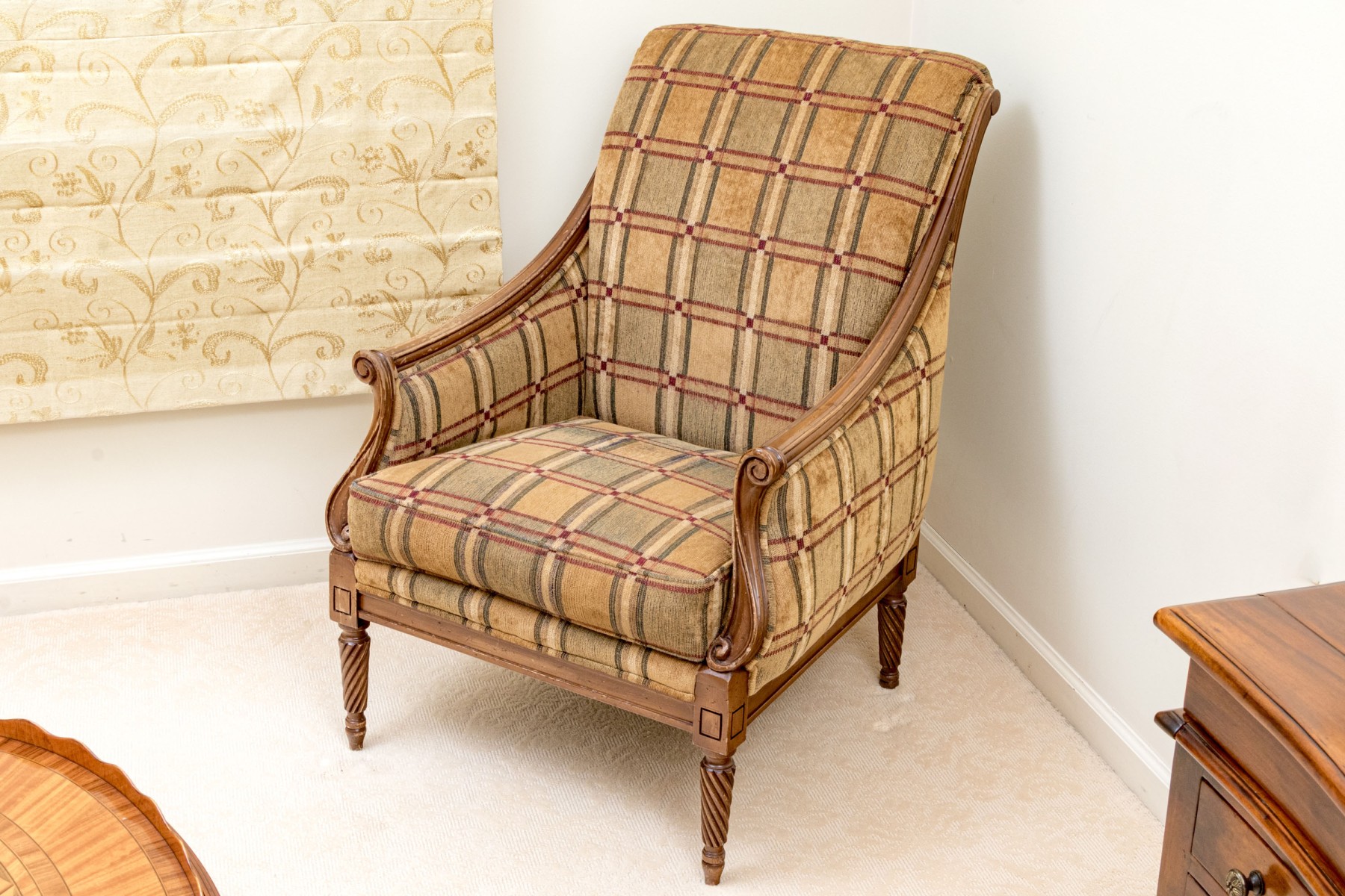 A fabulous Alexandra Gates bergere with Louis XVI appeal, featuring a honeyed medium brown frame with a rolled back, scrolled arm fronts, and spiraled tapered legs. Upholstered in a wonderful brown, green, red, and cream plaid-like grid design.