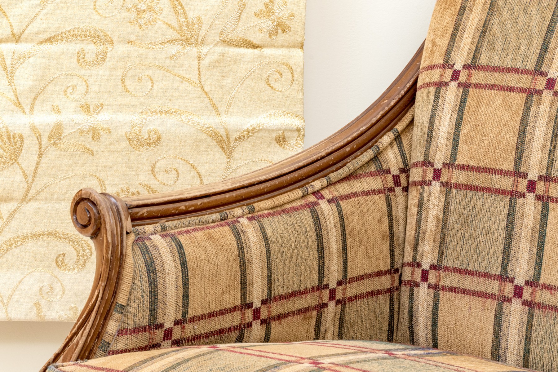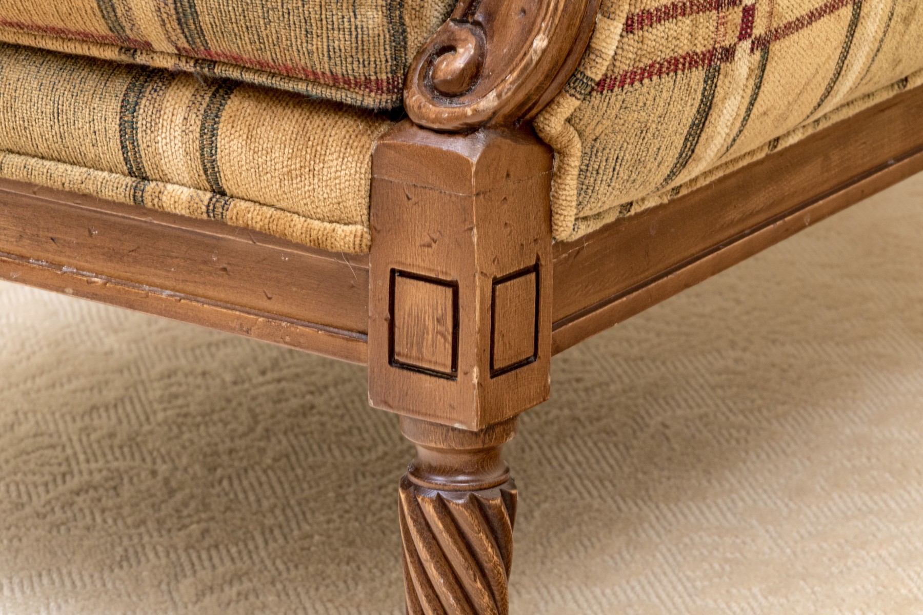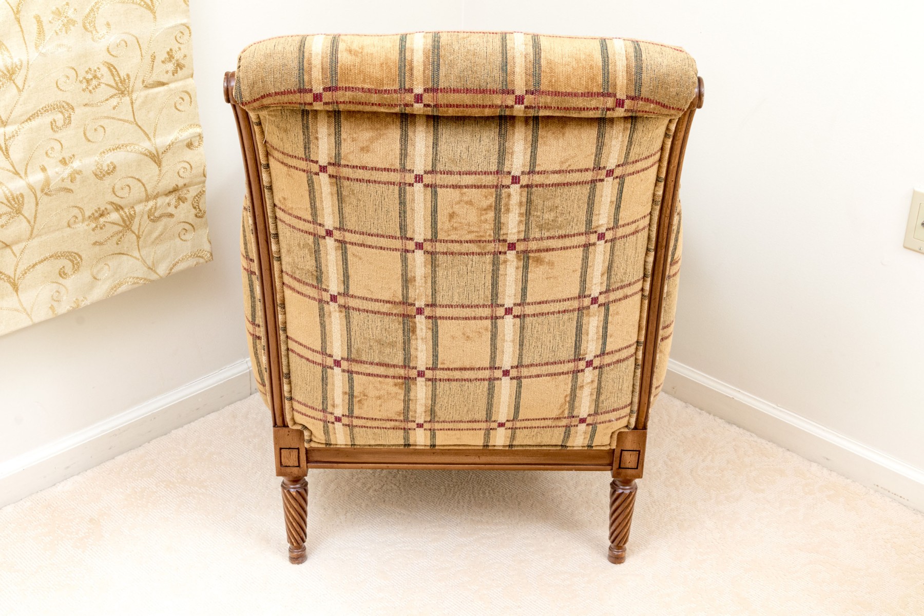 A fabulous Alexandra Gates bergere with Louis XVI appeal, featuring a honeyed medium brown frame with a rolled back, scrolled arm fronts, and spiraled tapered legs. Upholstered in a wonderful brown, green, red, and cream plaid-like grid design.