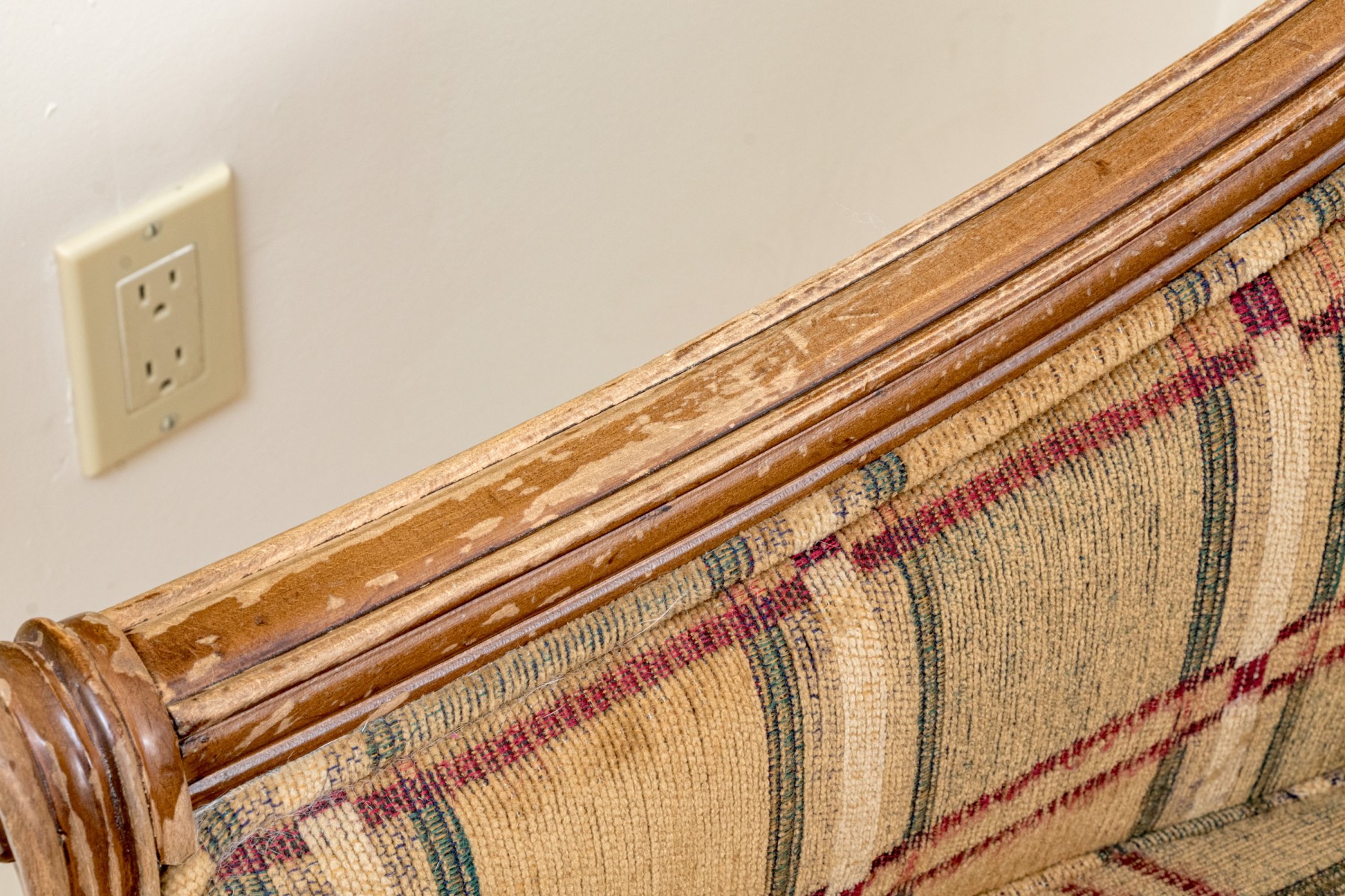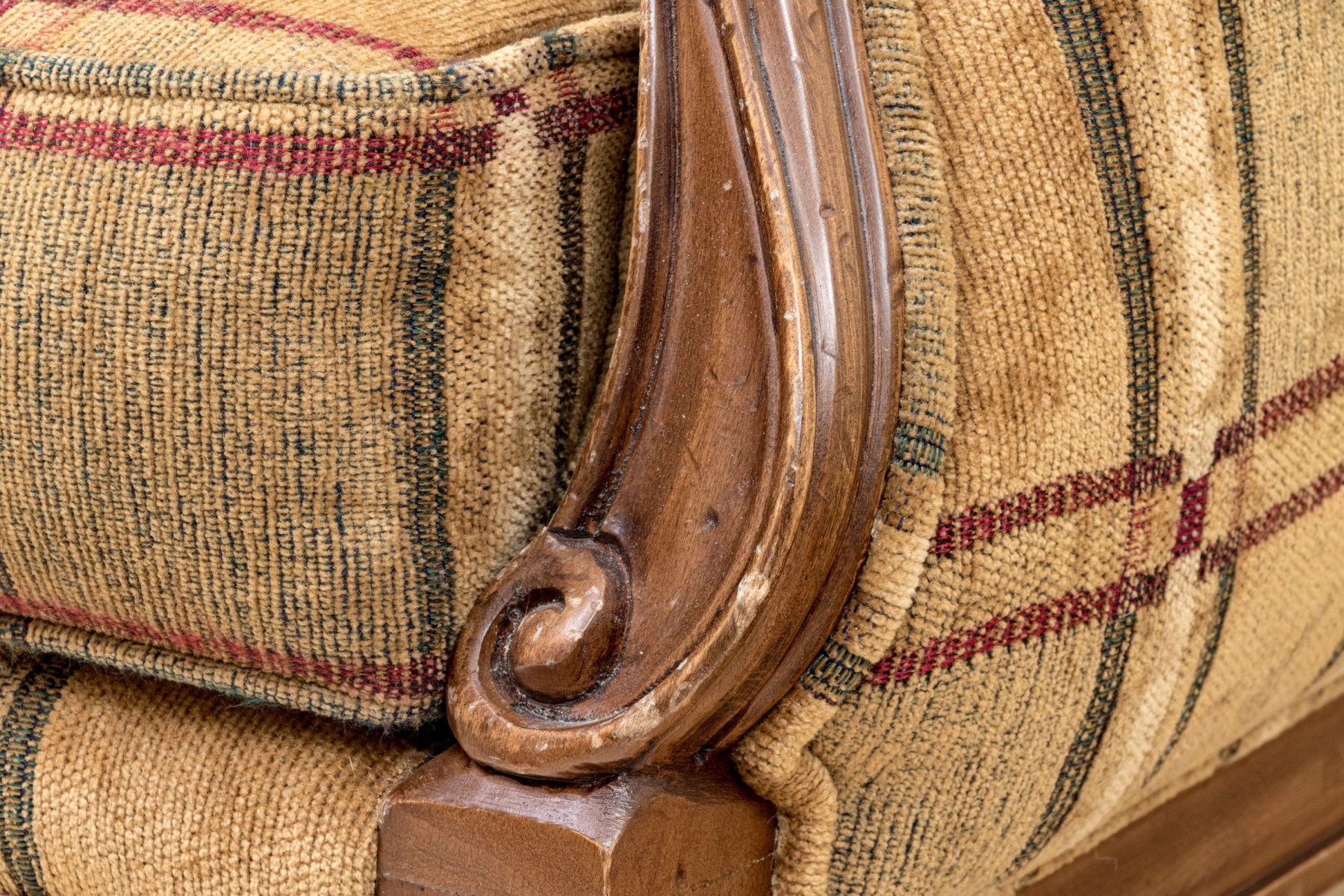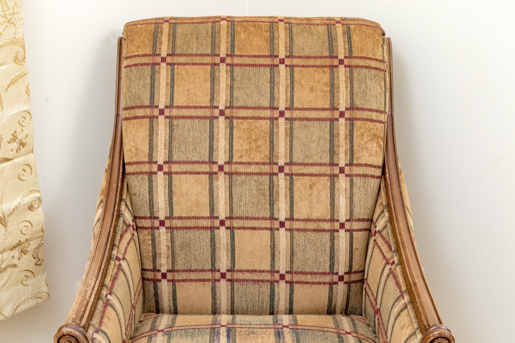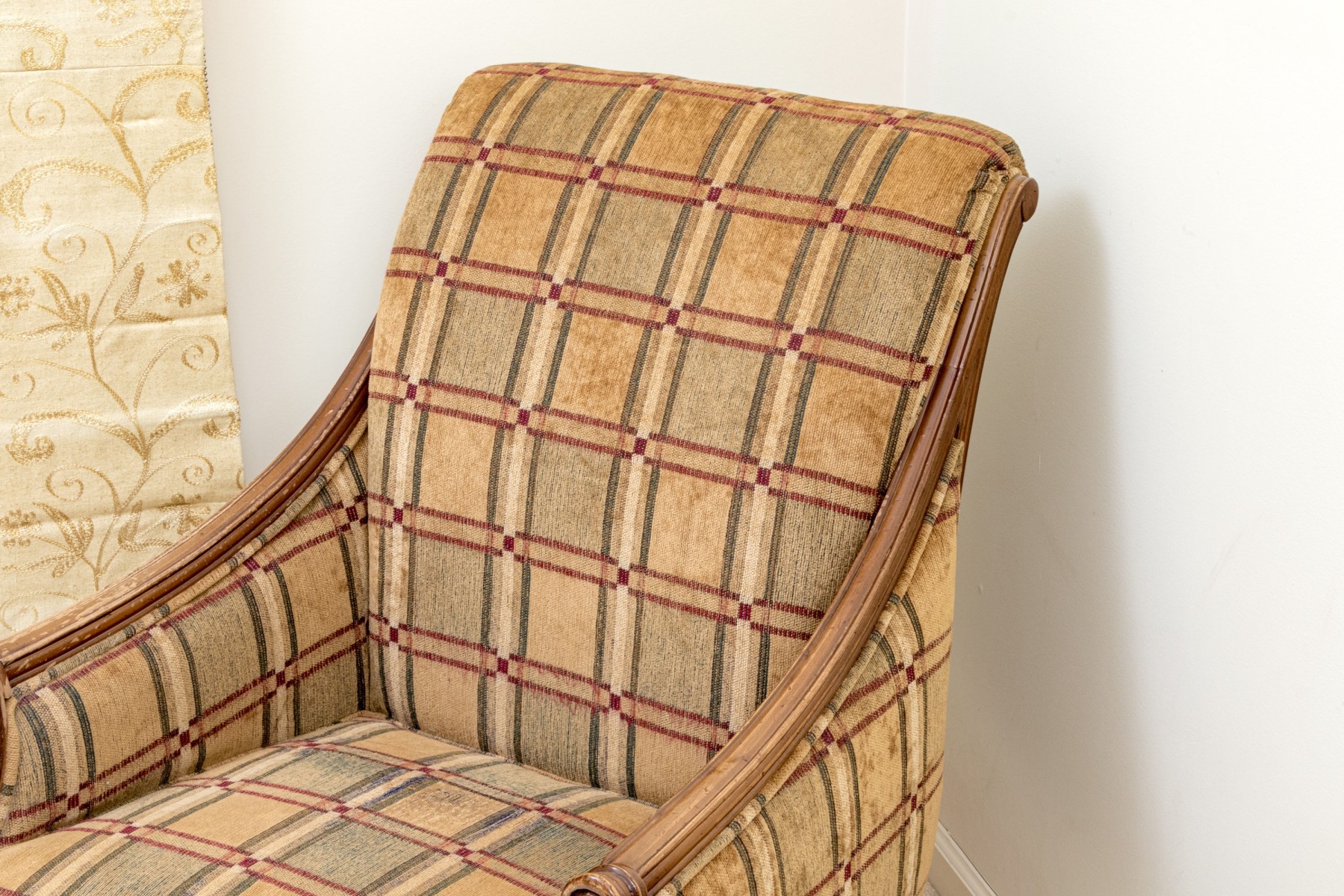 A fabulous Alexandra Gates bergere with Louis XVI appeal, featuring a honeyed medium brown frame with a rolled back, scrolled arm fronts, and spiraled tapered legs. Upholstered in a wonderful brown, green, red, and cream plaid-like grid design.