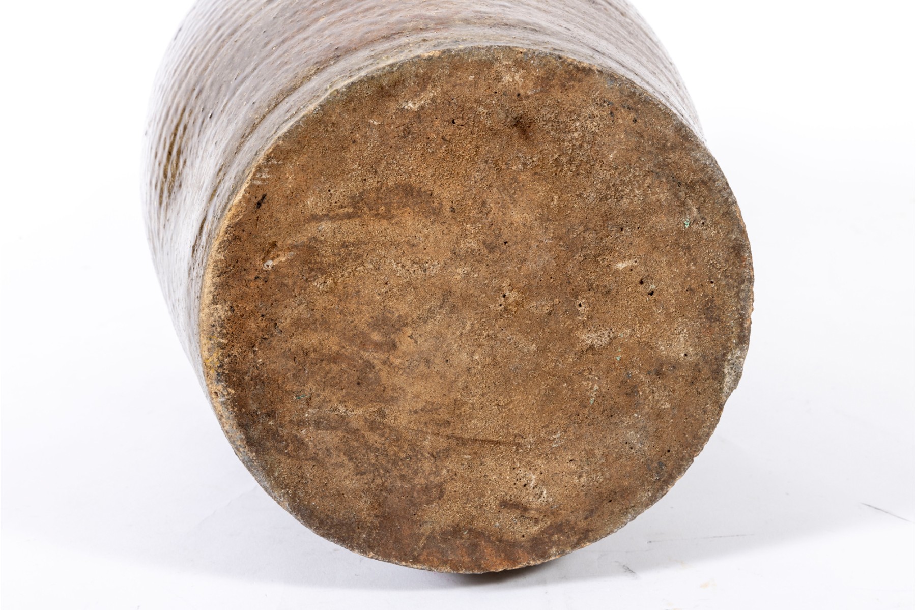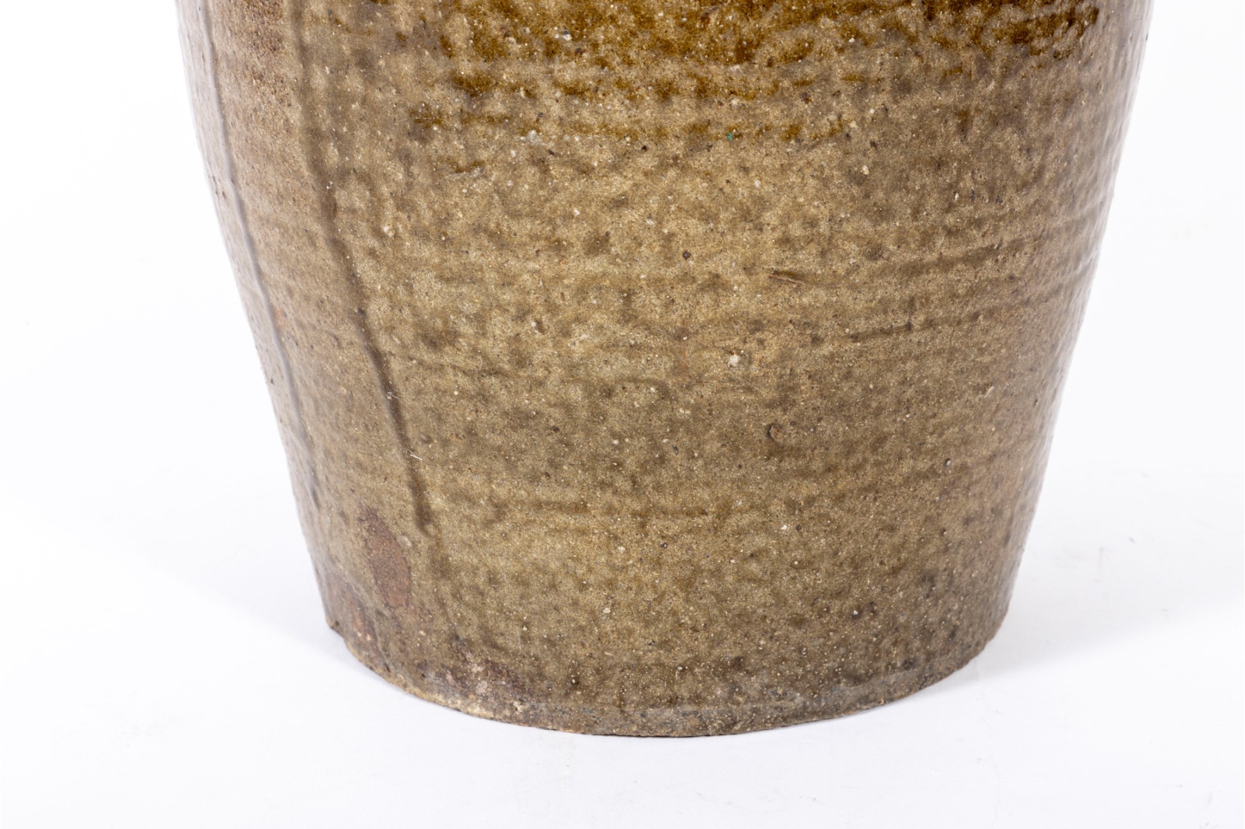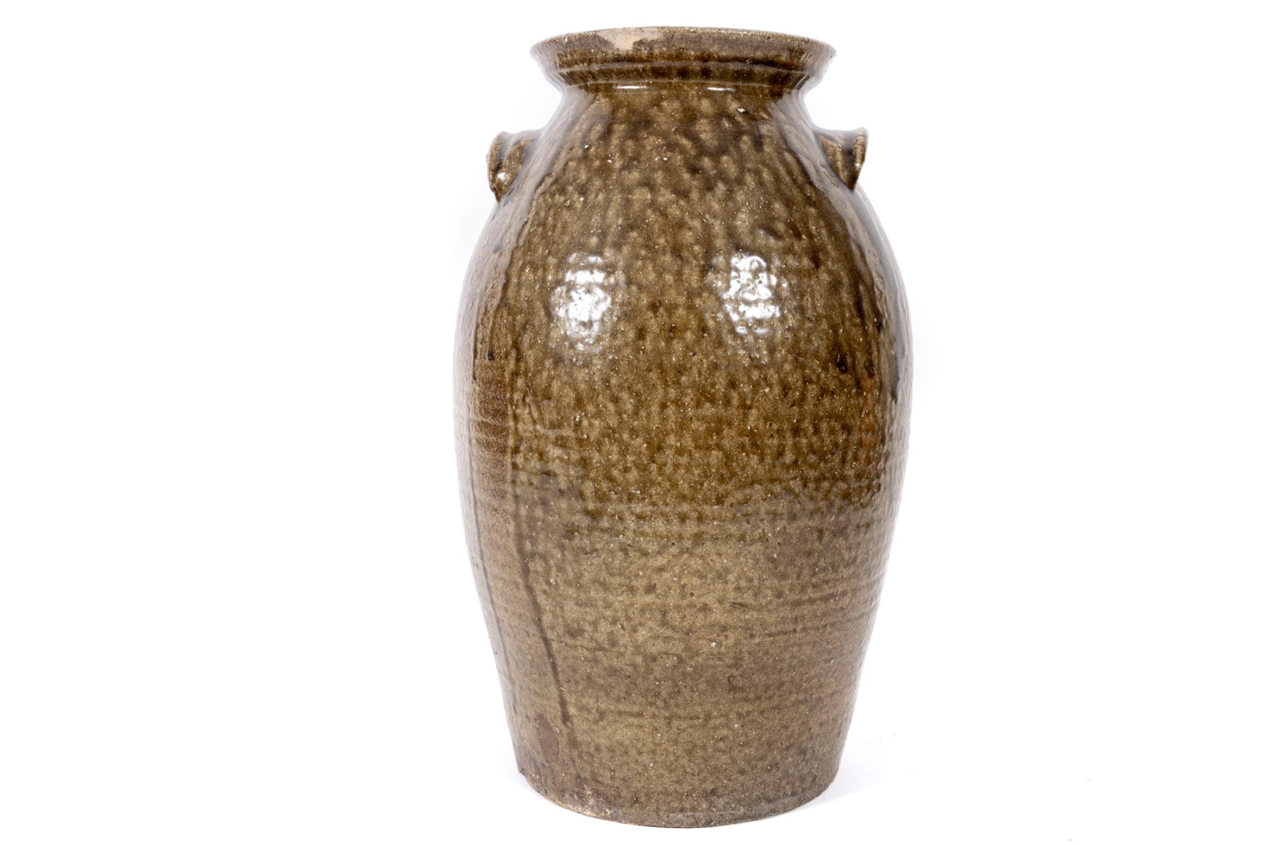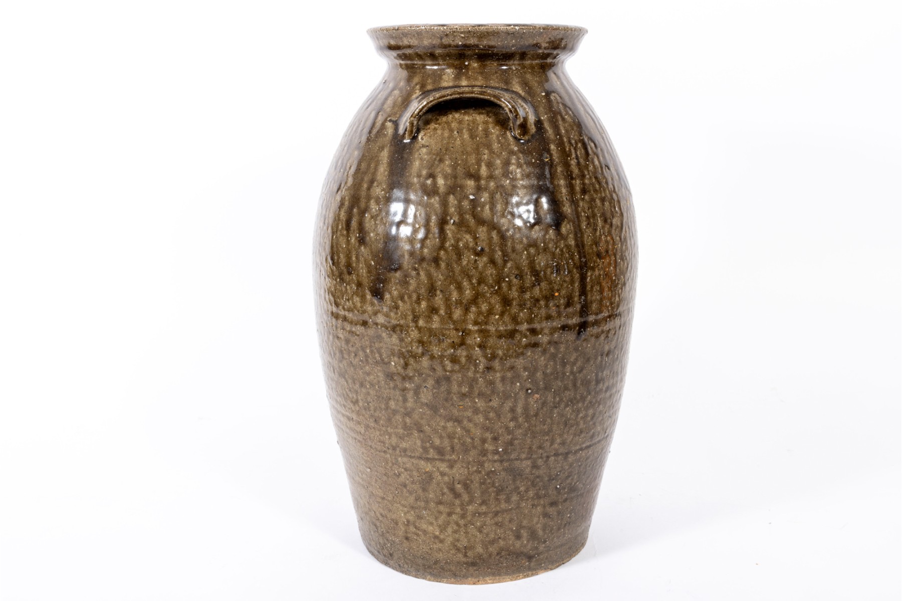 A three gallon stoneware jar with handles. Adorned in a glossy alkaline glaze with drips descending from the rim, this 19th century example is unsigned and unmarked.