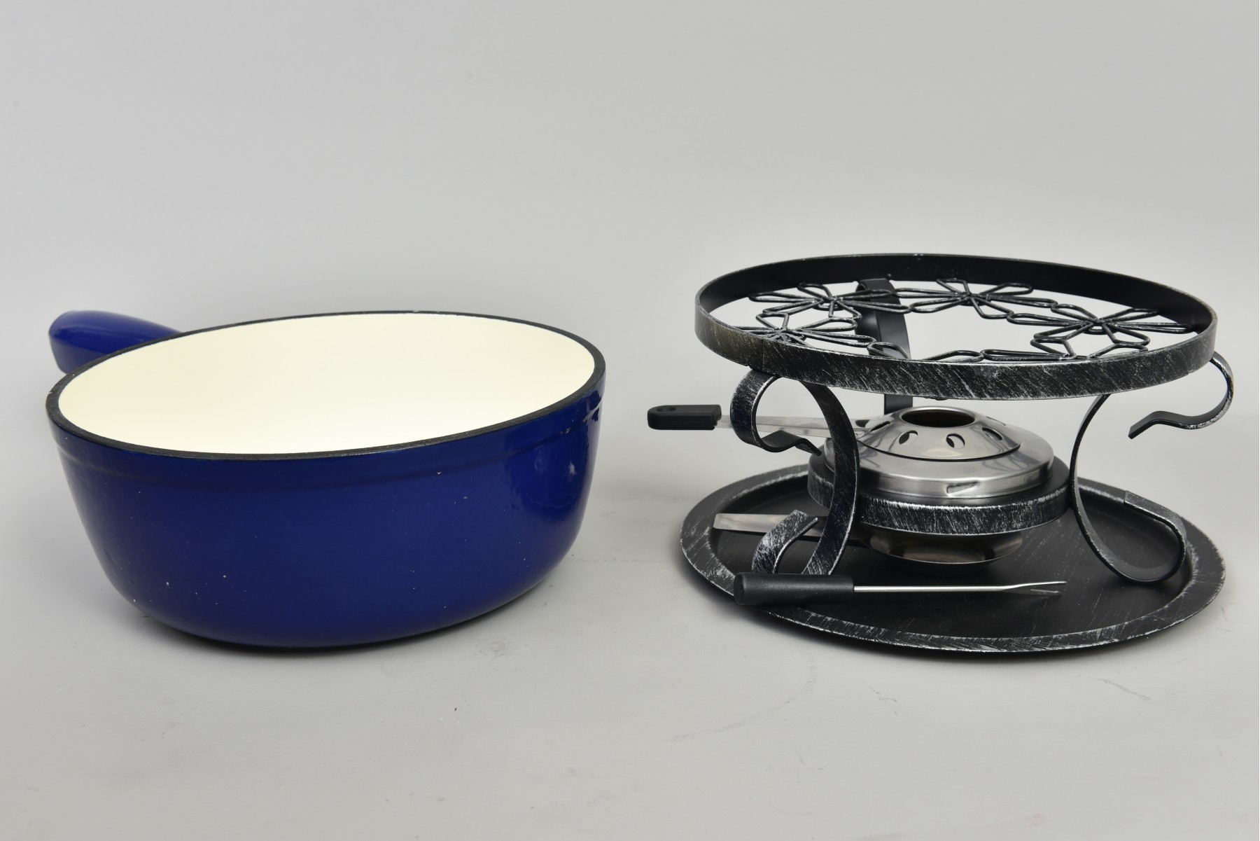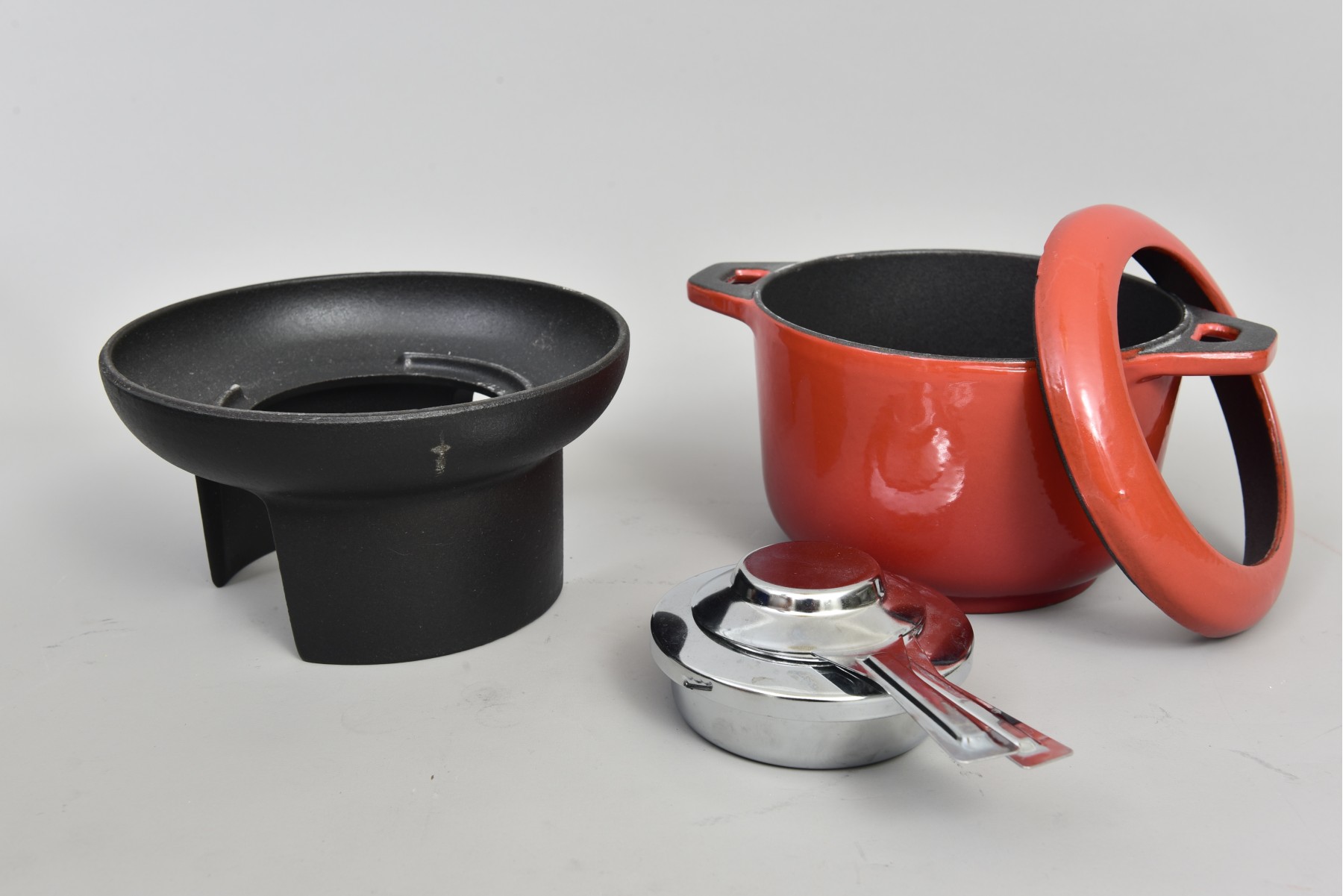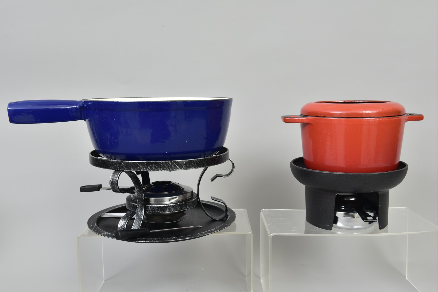 Includes an Artestia cast iron fondue pot set and red enamel cast iron fondue pot with lid and stand.
