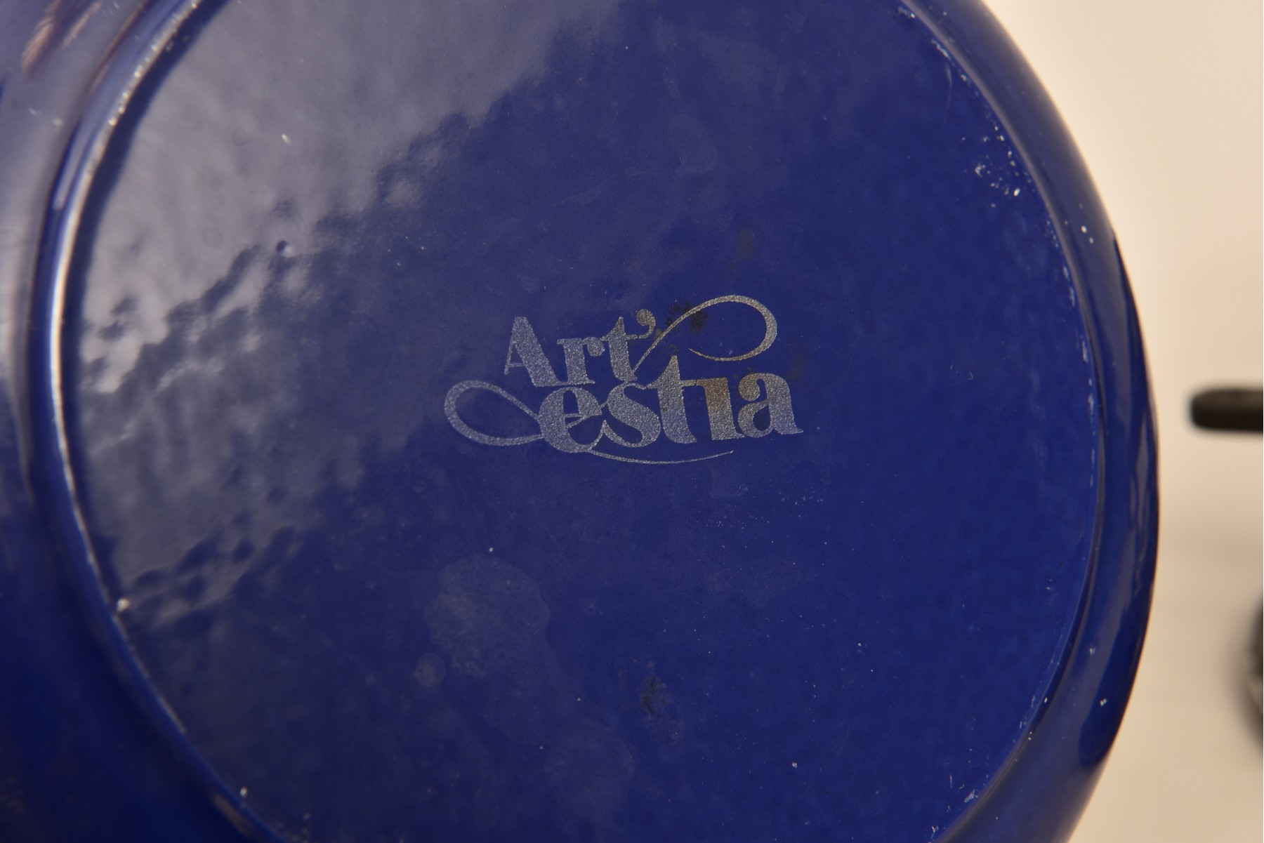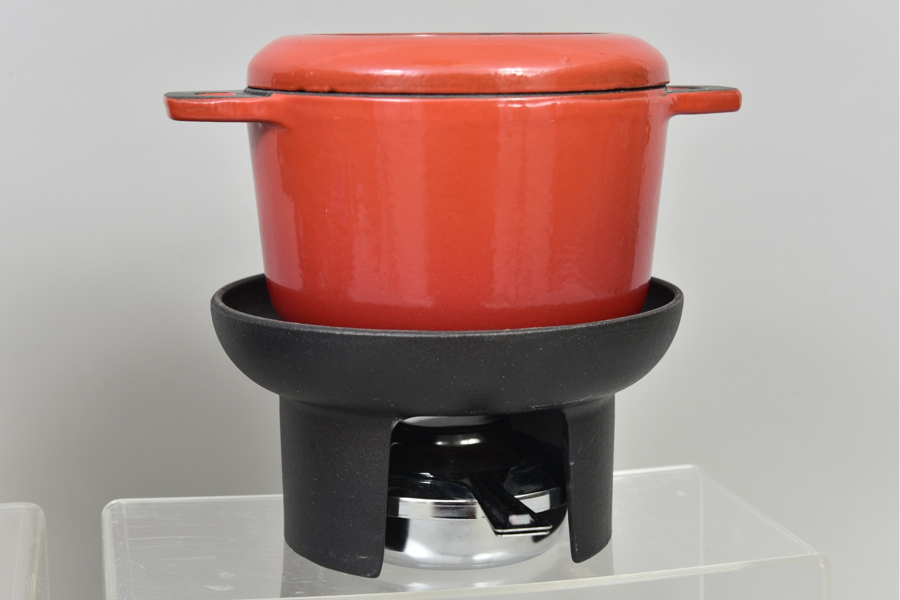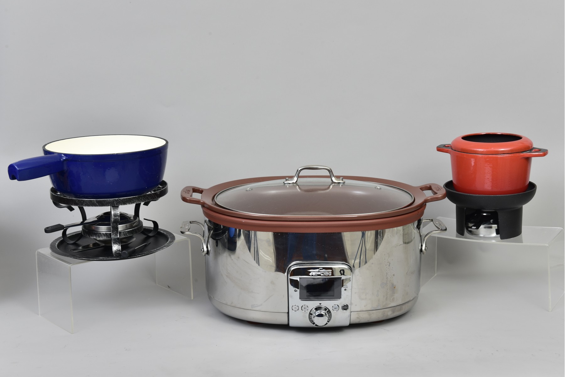 Includes an Artestia cast iron fondue pot set and red enamel cast iron fondue pot with lid and stand.