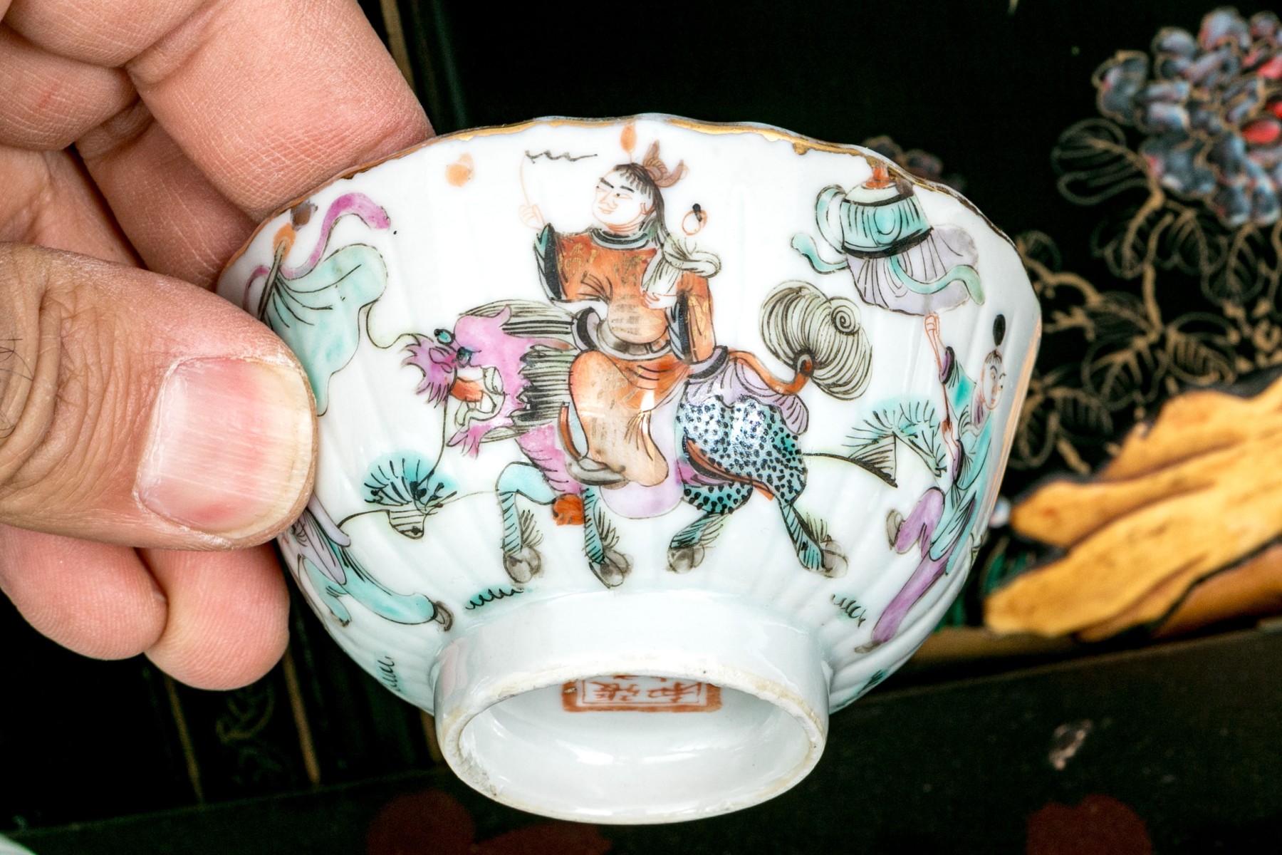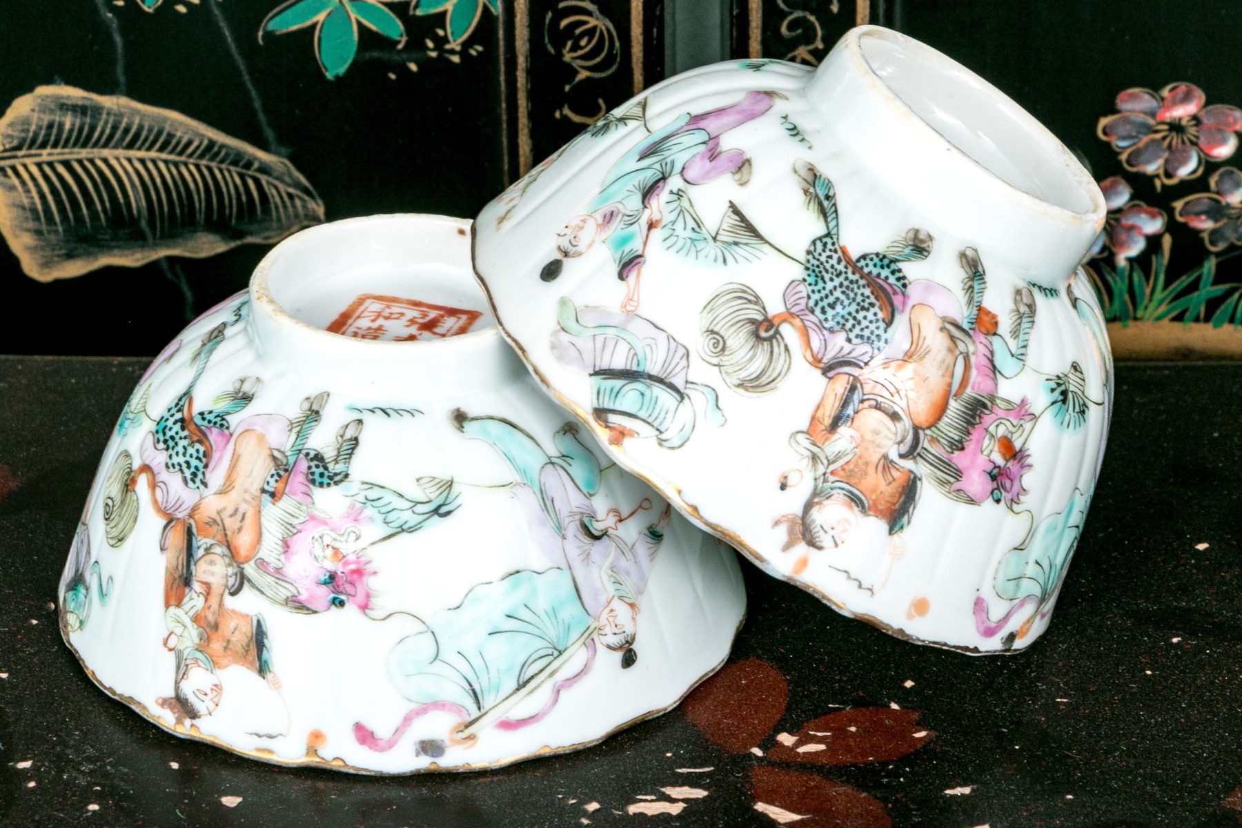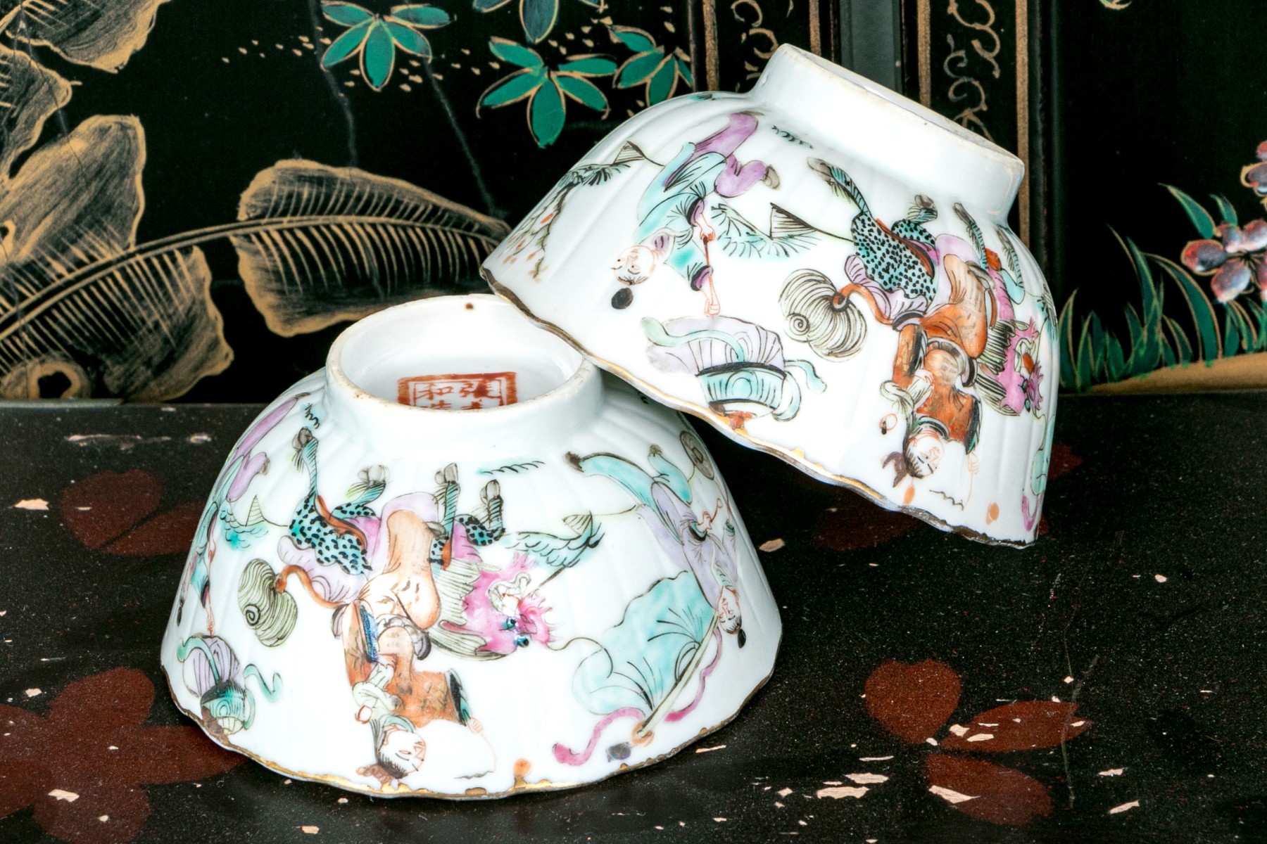 Both bowls are decorated with famille rose figural imagery all around the exterior.