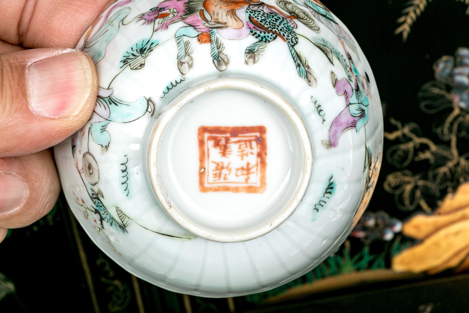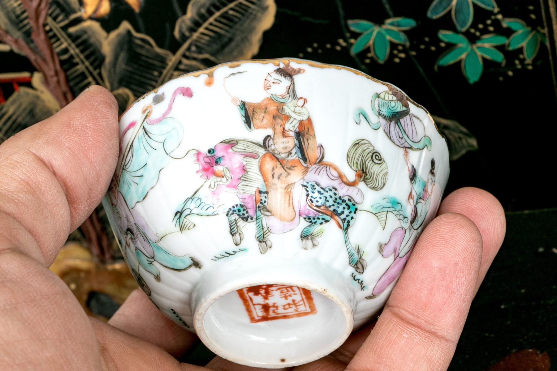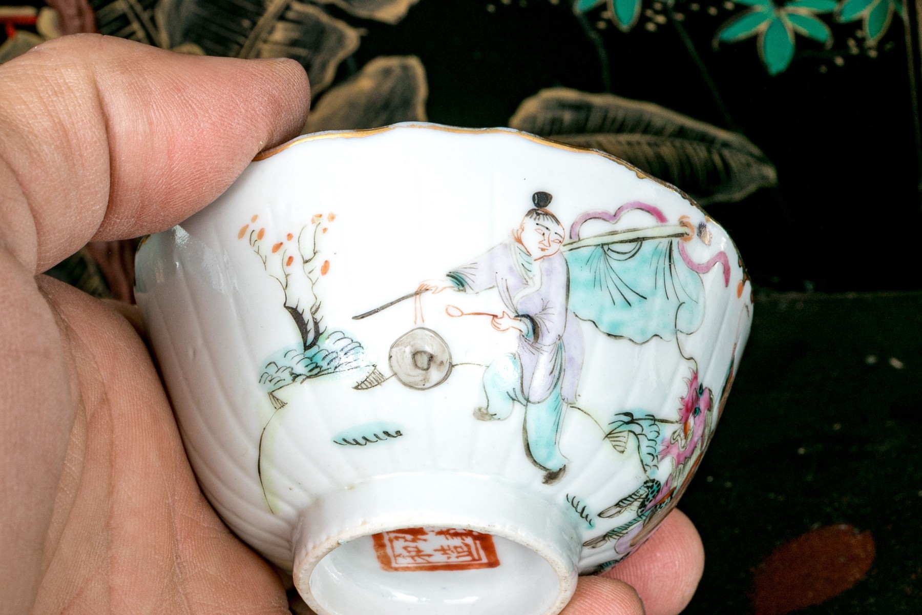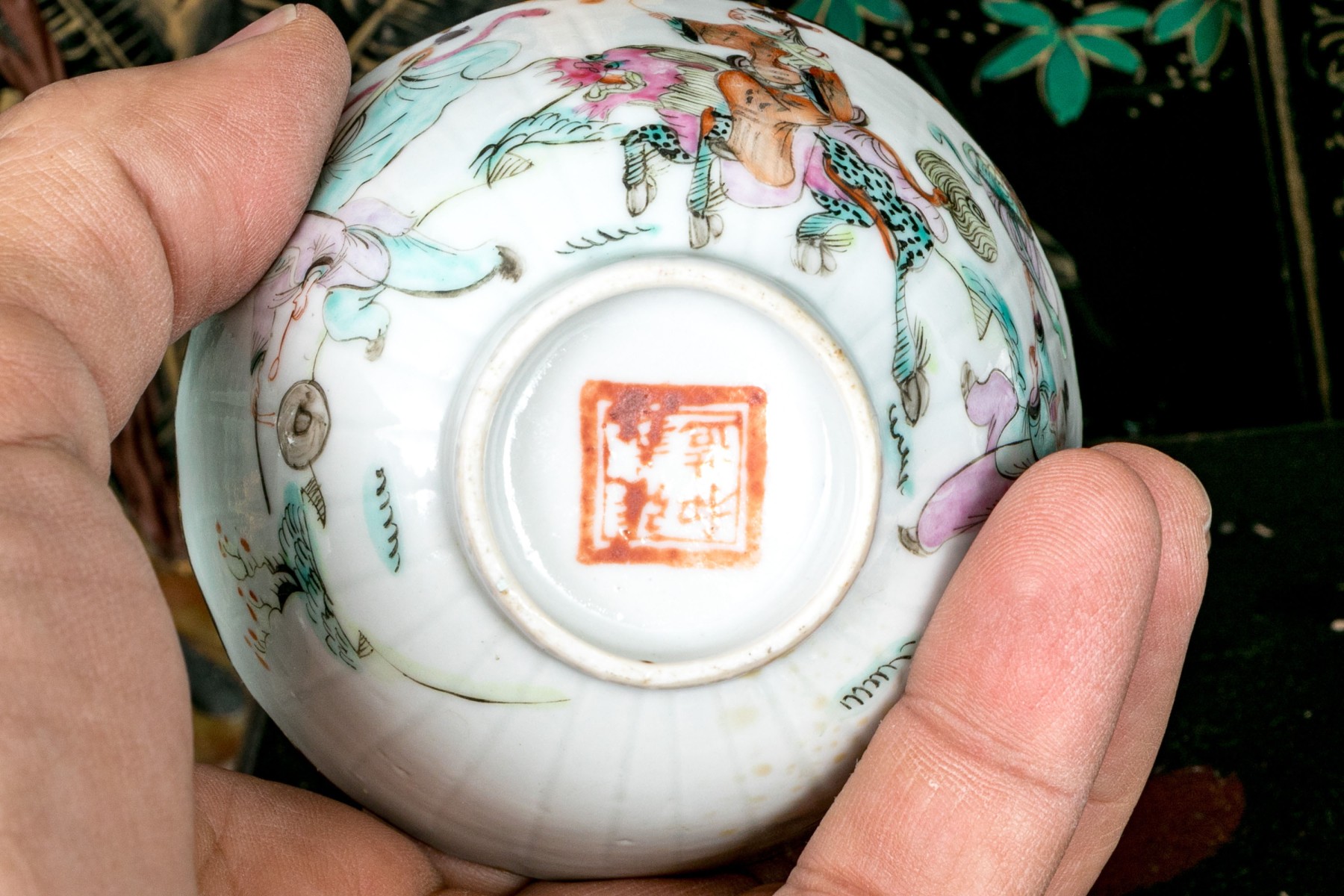 Both bowls are decorated with famille rose figural imagery all around the exterior.