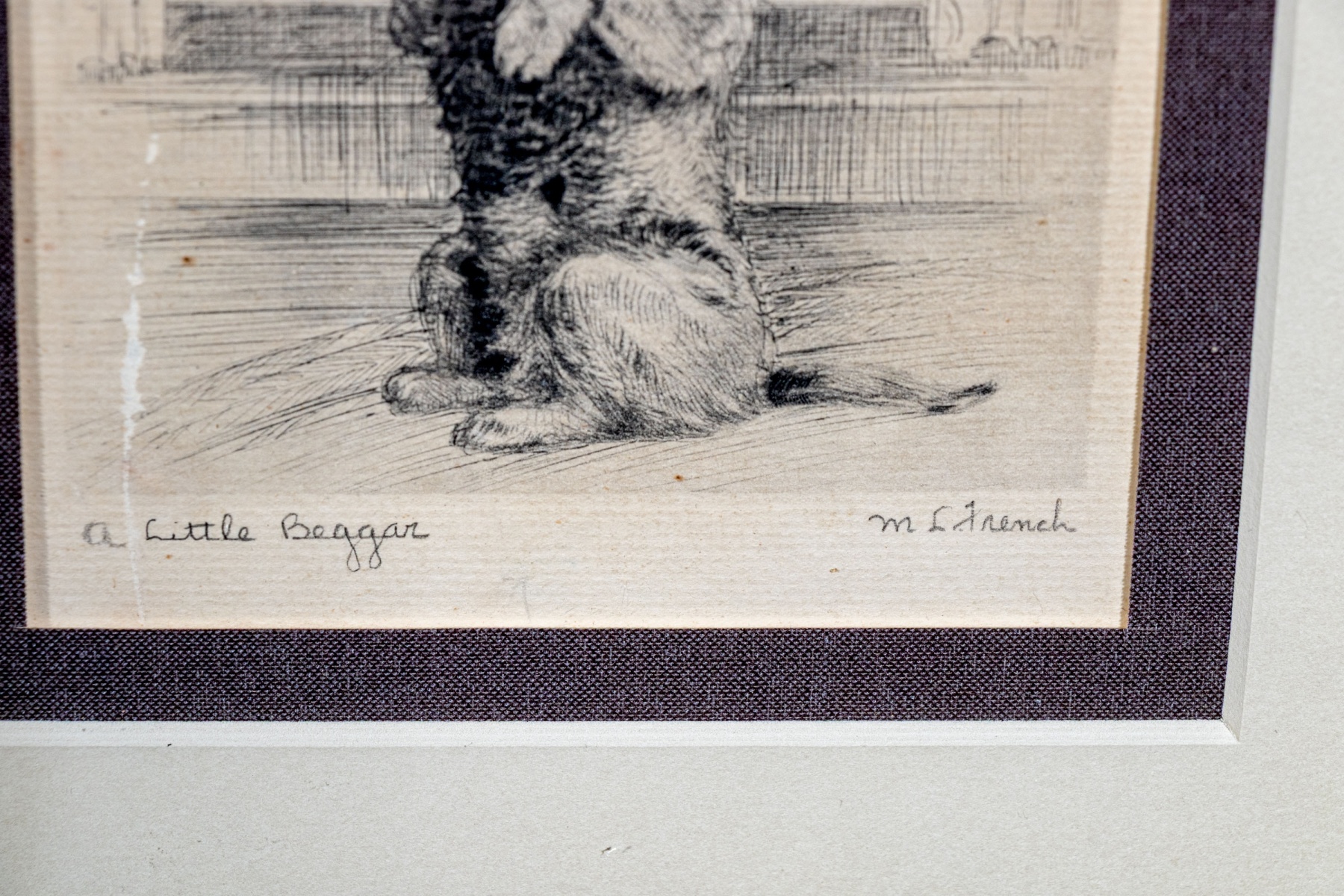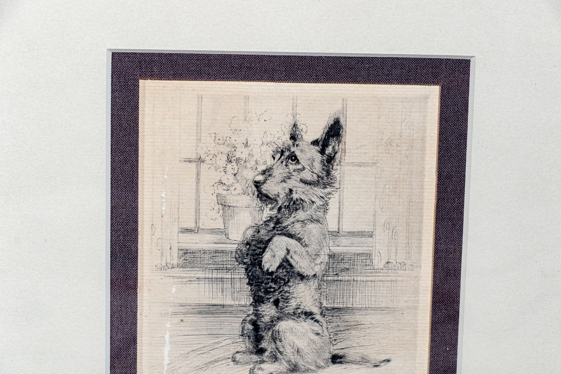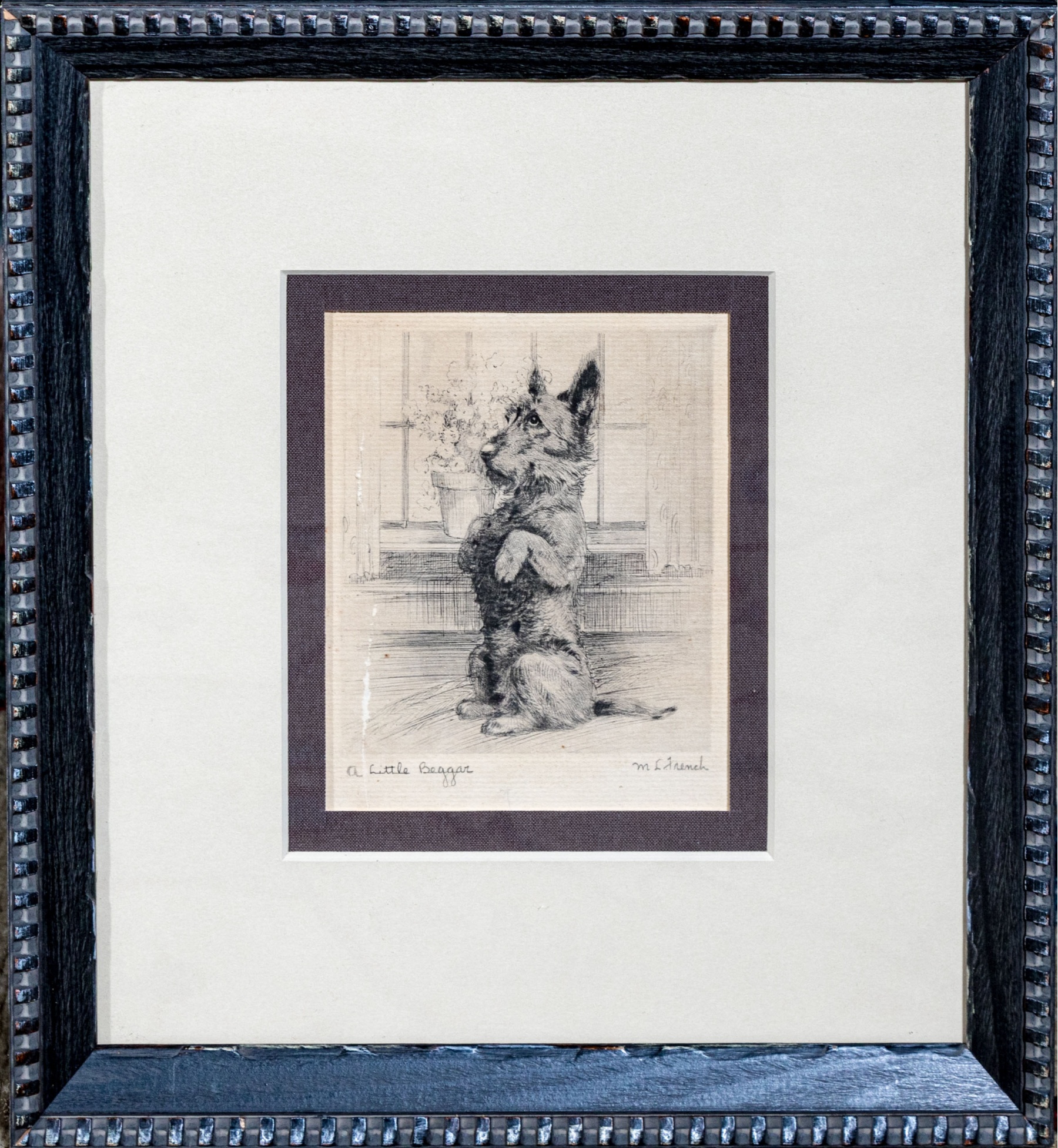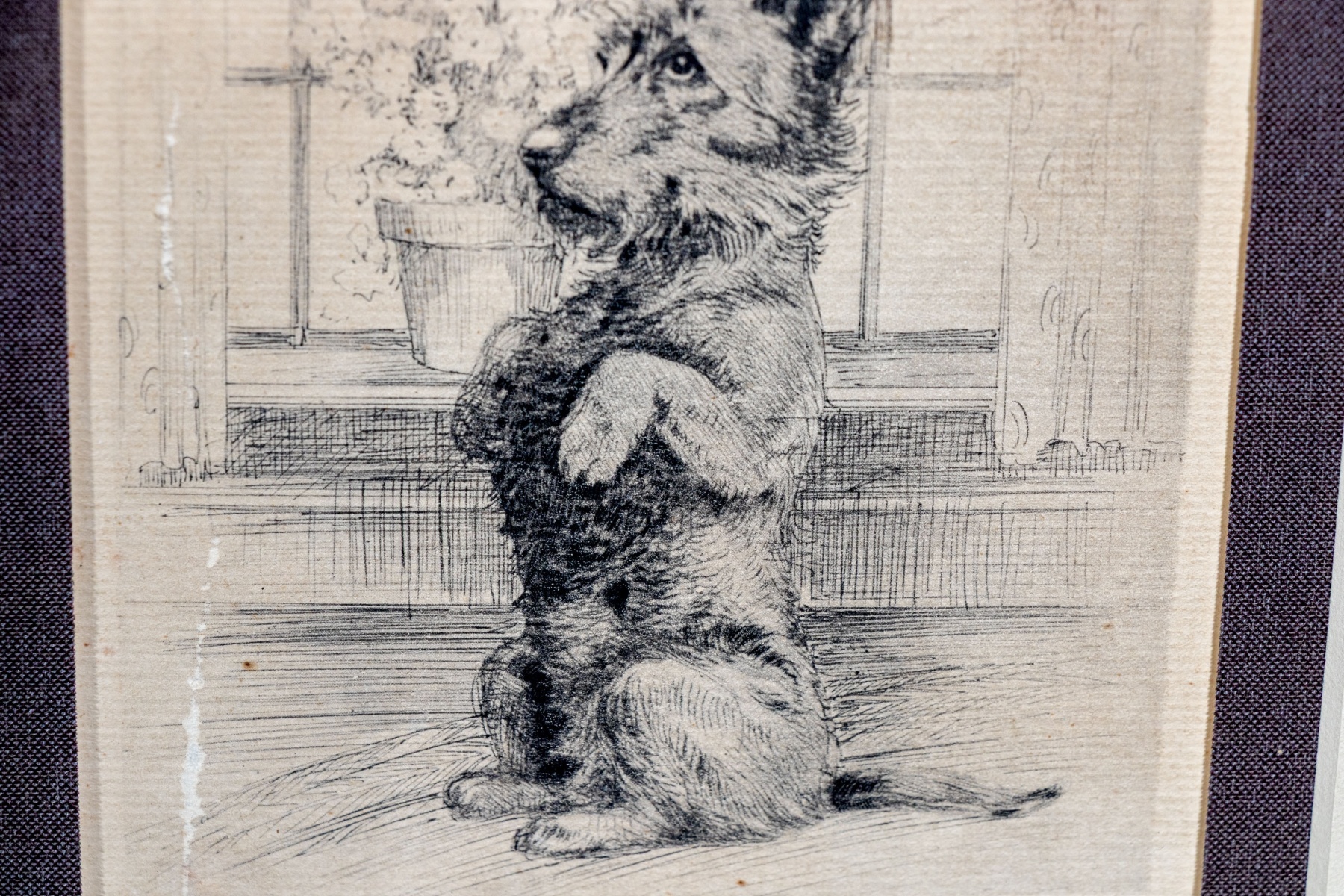 Alphonse Legros (French, 1837-1911) "A Little Beggar" etching depicting an adorable dog posed begging, sitting up on their hind legs with a cute expression in front of a window with a large potted plant on the window sill. Pencil signed lower right, titled lower left.