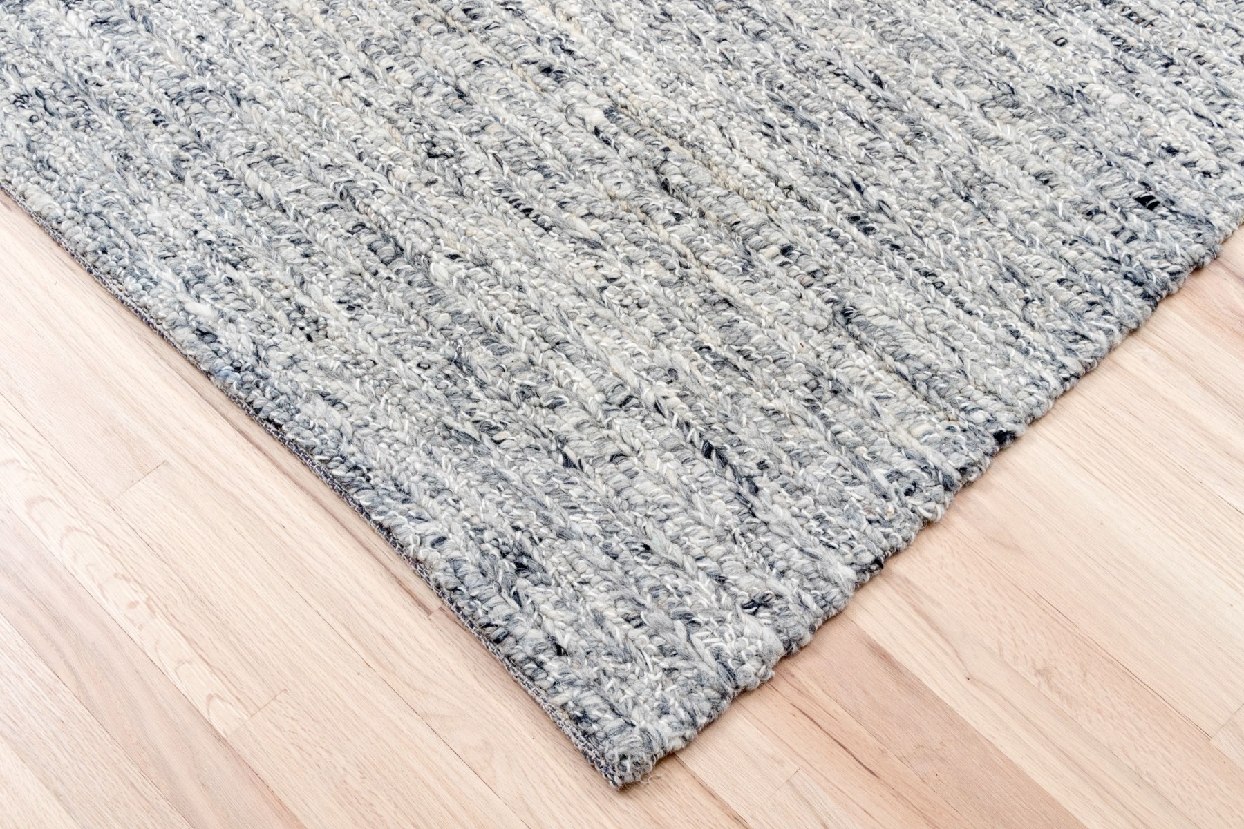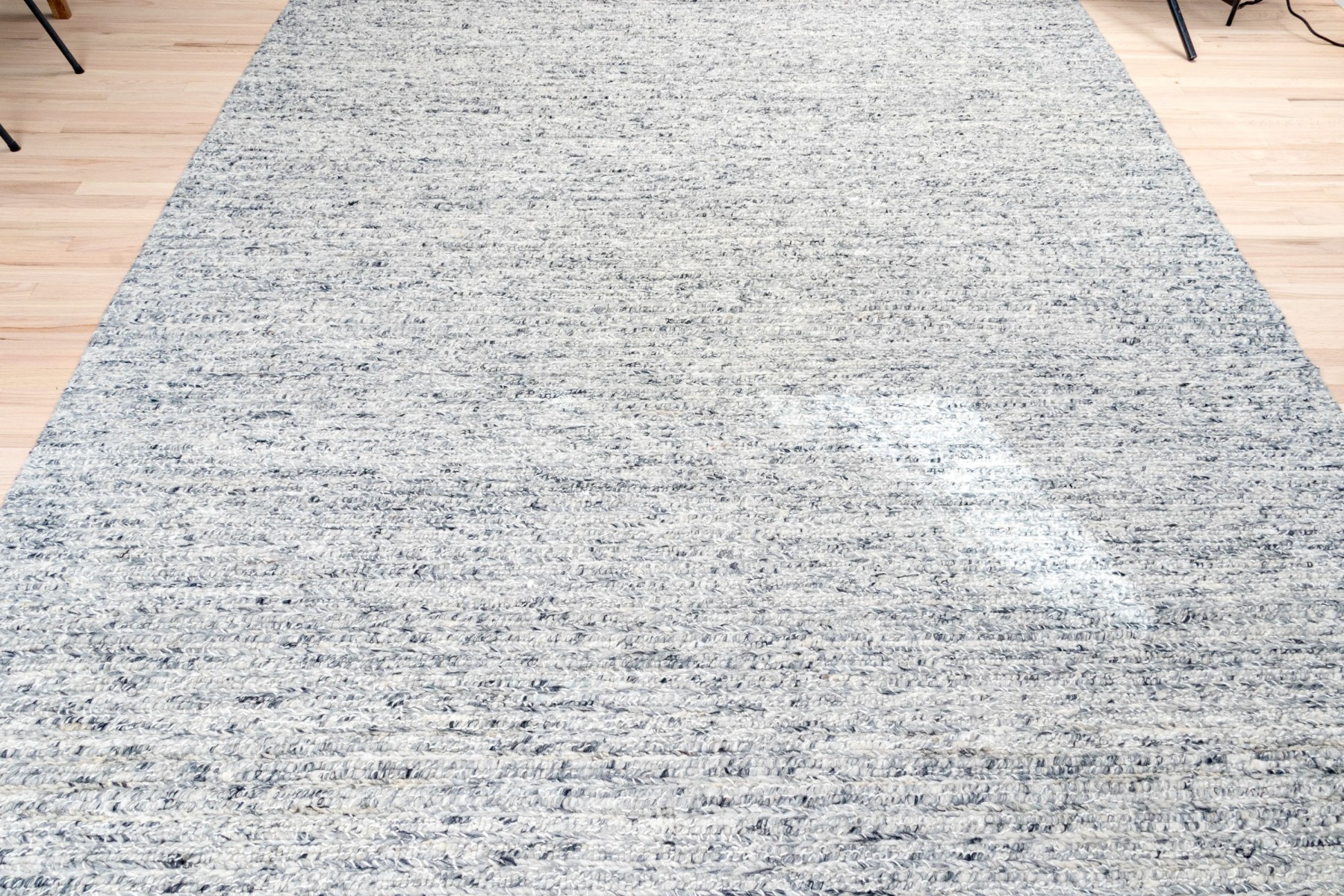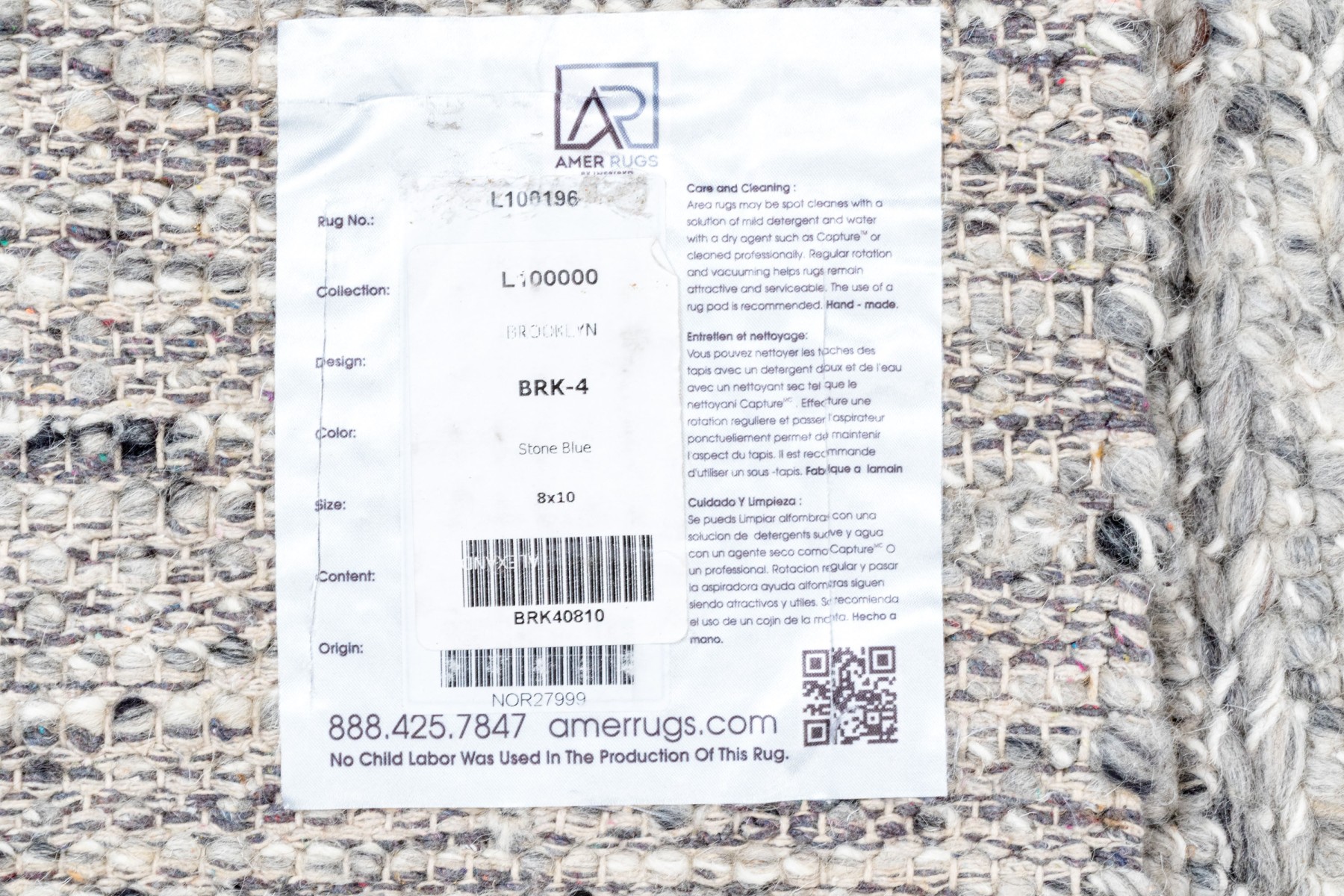 A handsome Amer Rugs Brooklyn "BRK-4" handmade area rug crafted in India of 60% New Zealand wool and 40% viscose. Detailed in neutral gray, cream, and soft blue with a finely heathered design creating a perfectly versatile, contemporary aesthetic.