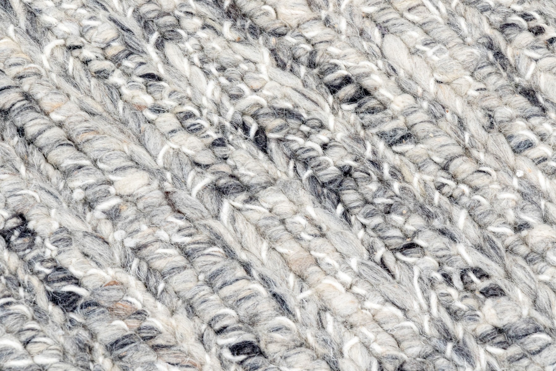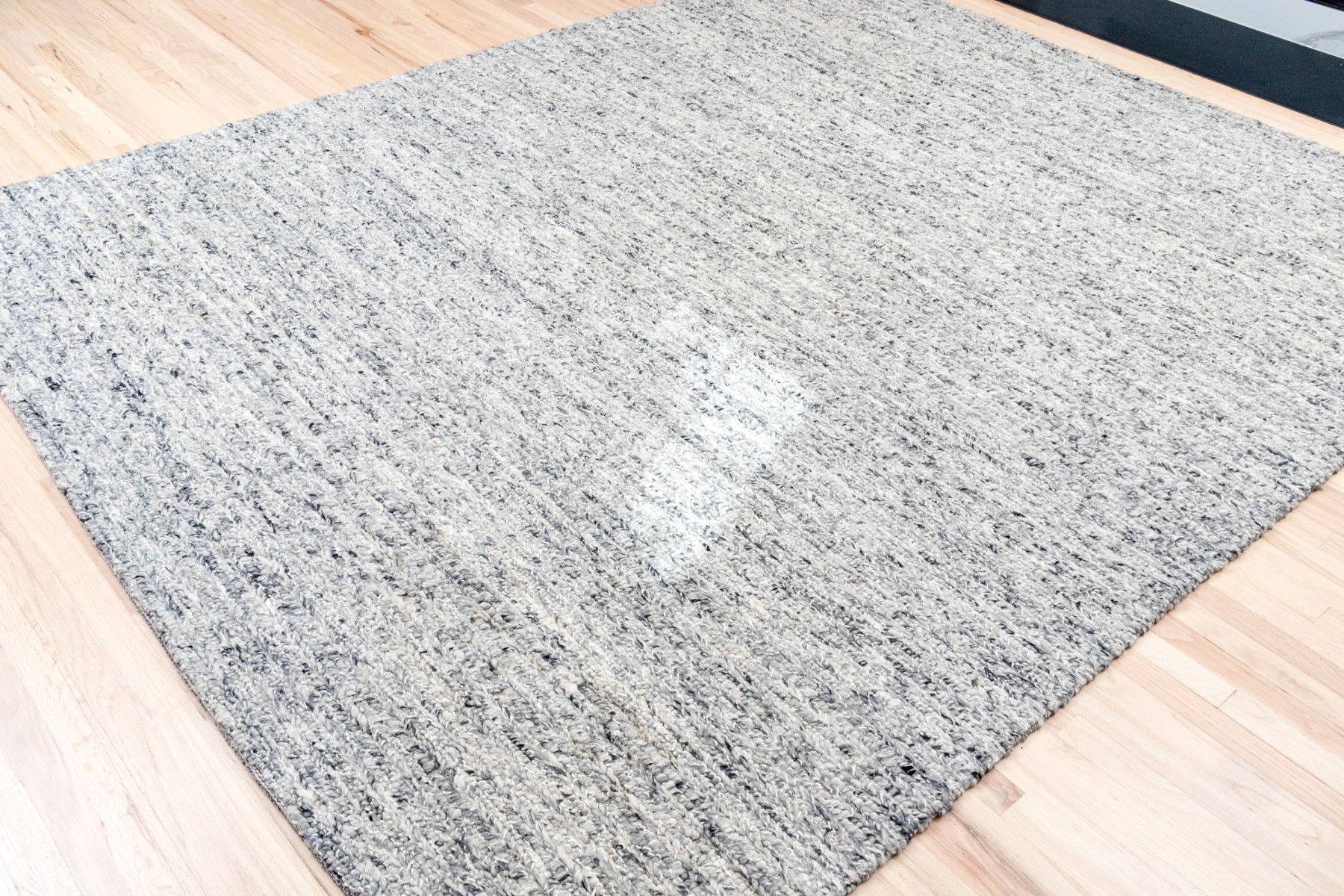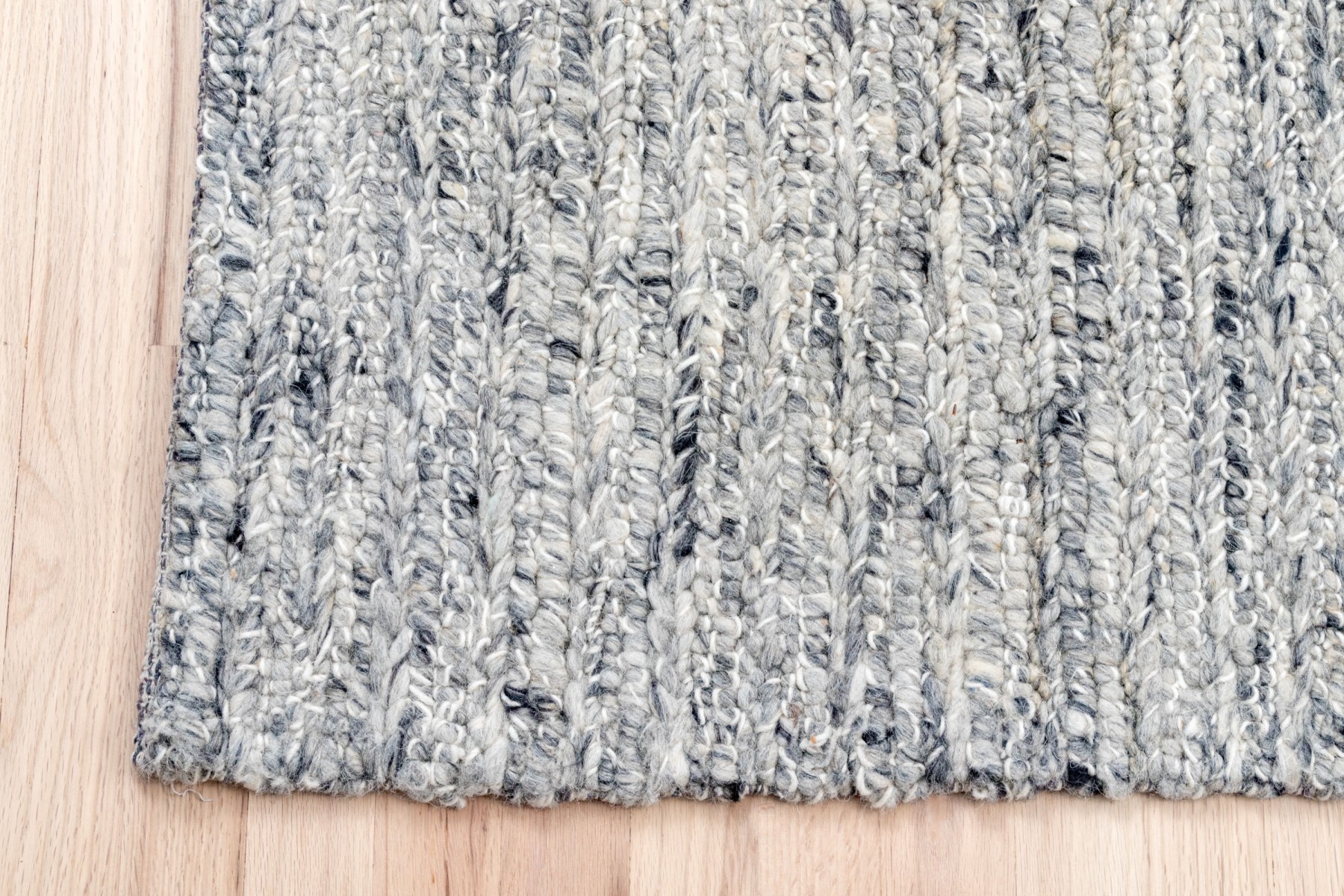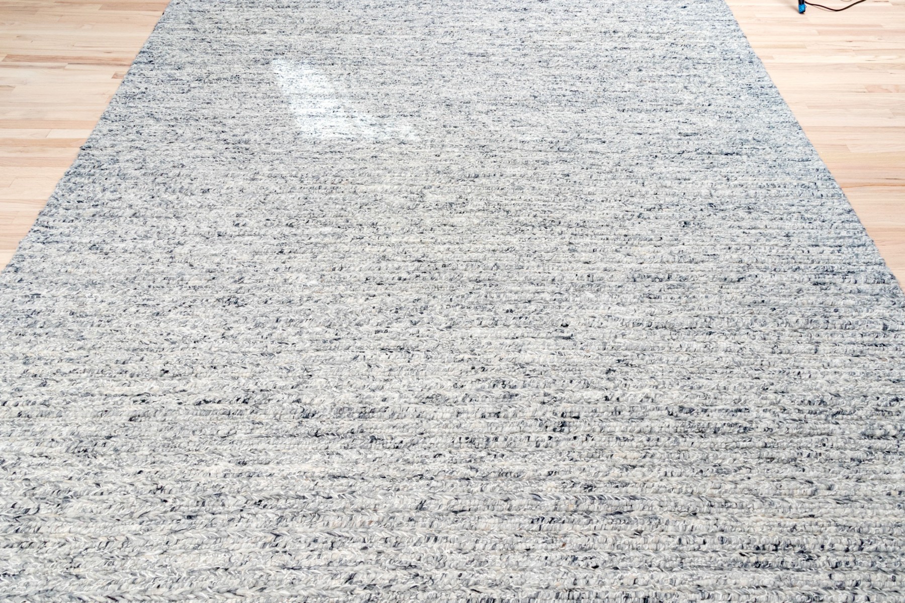 A handsome Amer Rugs Brooklyn "BRK-4" handmade area rug crafted in India of 60% New Zealand wool and 40% viscose. Detailed in neutral gray, cream, and soft blue with a finely heathered design creating a perfectly versatile, contemporary aesthetic.