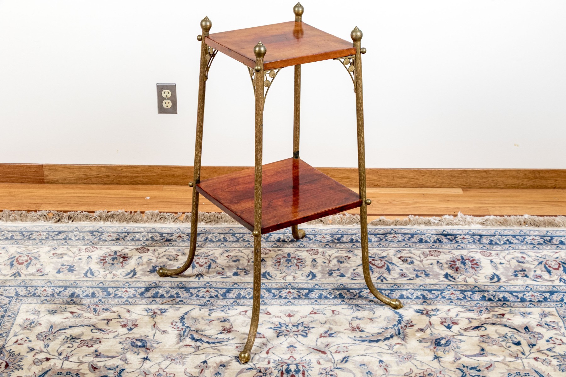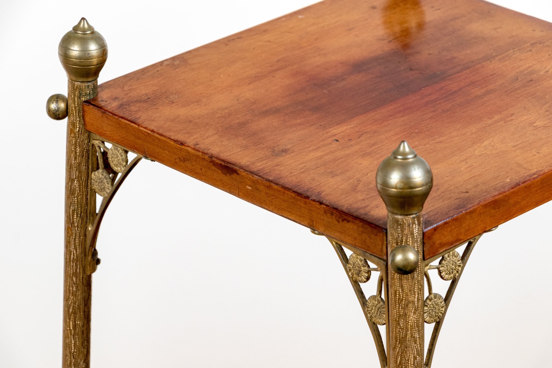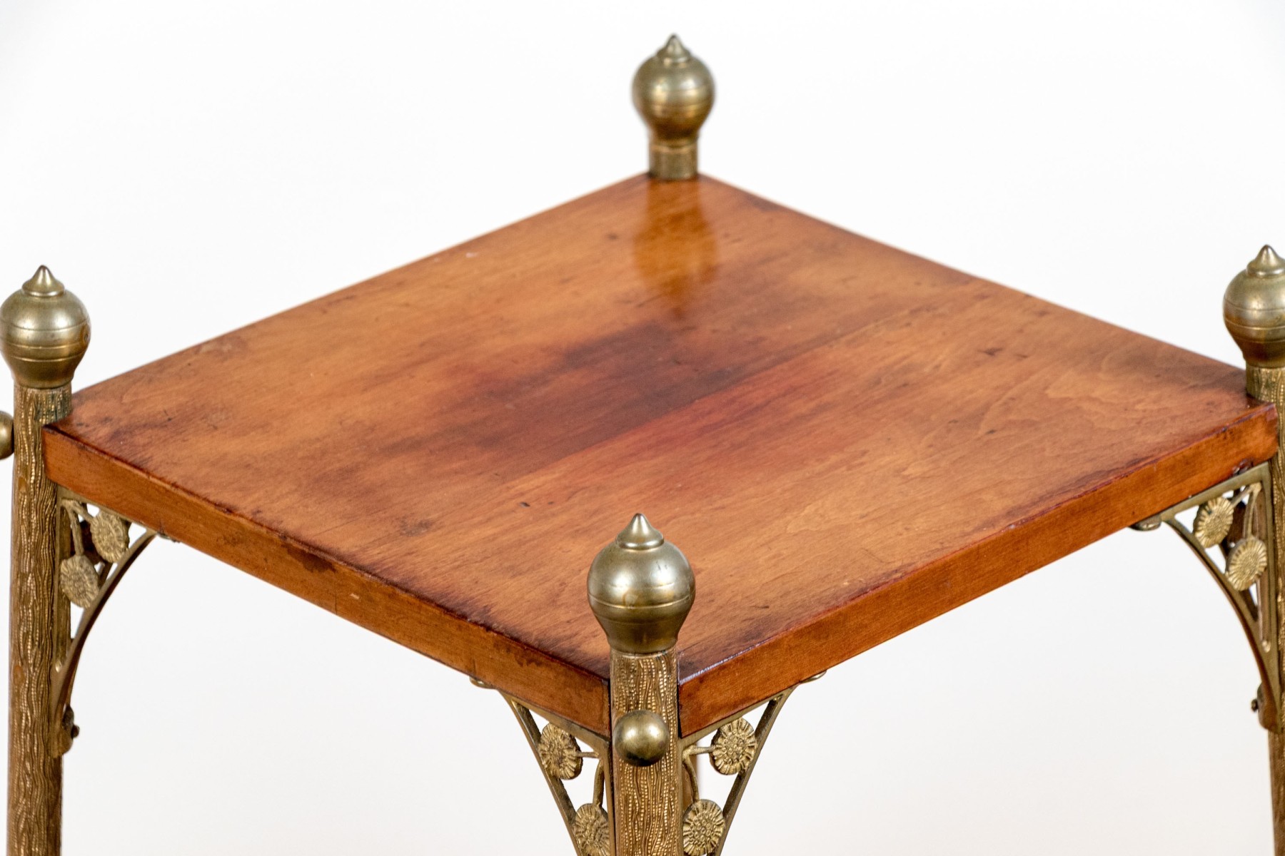 A beautiful American Aesthetic end table ca. 1870-1880 raised on four brass etched tree trunk motif legs with flared feet with ball form finials with two tiers. Detailed with a rosewood lower shelf.