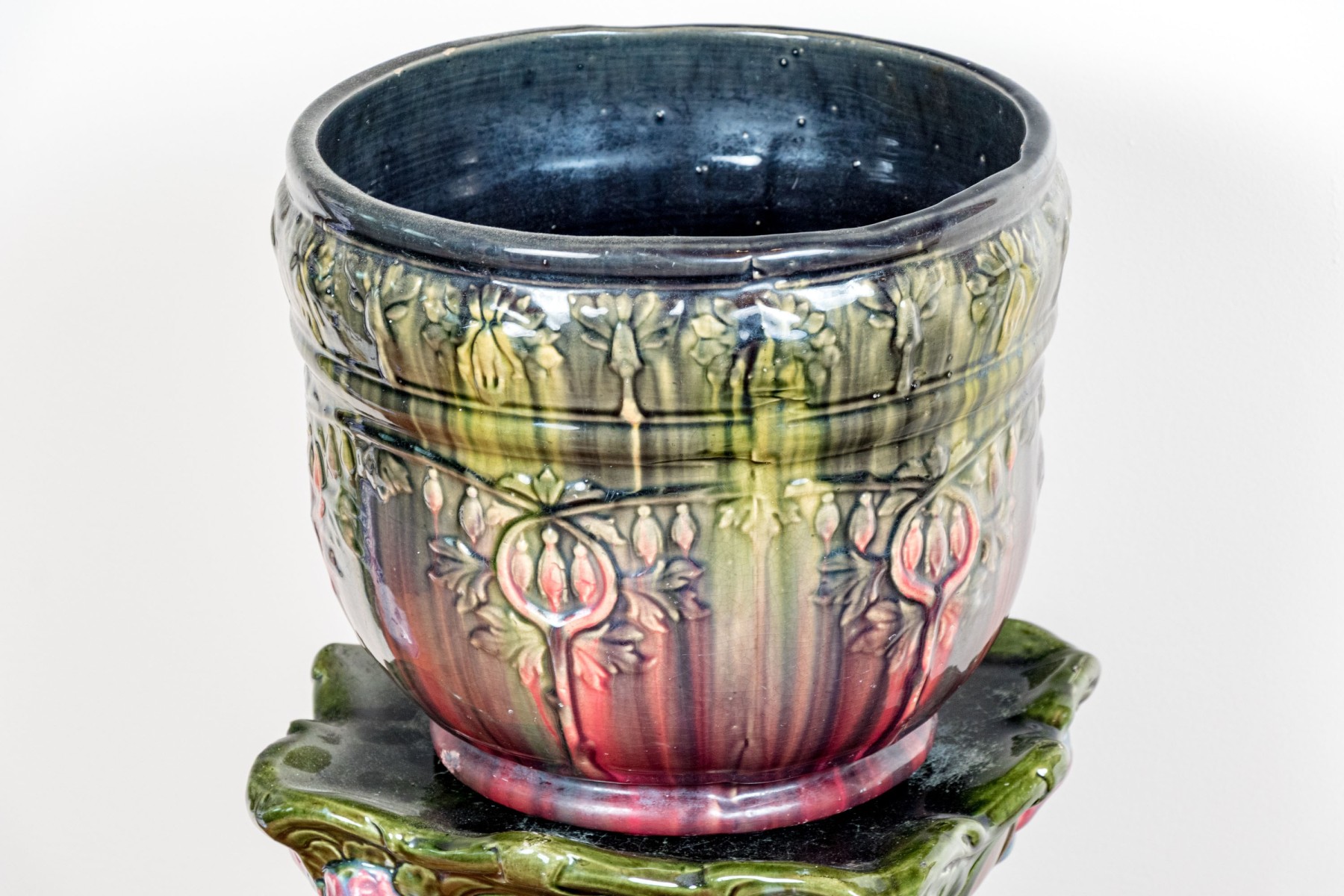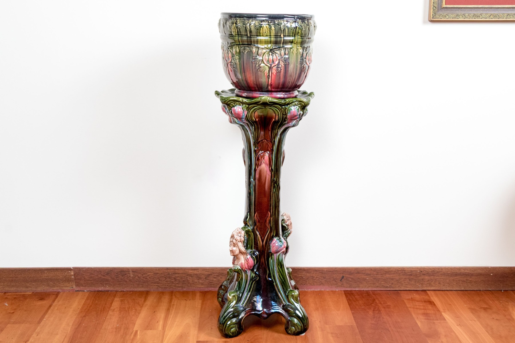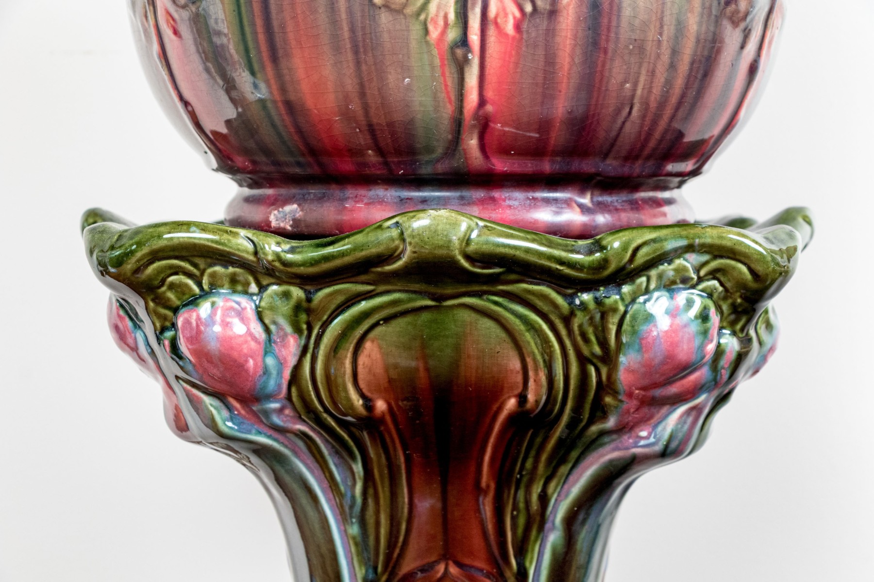 A gorgeous American ceramic jardiniere on a pedestal in elegant Art Nouveau style. The jardiniere features a gently curved and tapered cylindrical form with a flared circular foot, glazed in fabulous streaky green and pinkish-red over pretty foliate relief. The jardiniere is set atop a matching pedestal with a scalloped and bulbous capital tapering down the column to a base of four scrolled feet with a figural bust and pretty floral accents throughout the tree trunk-like design.