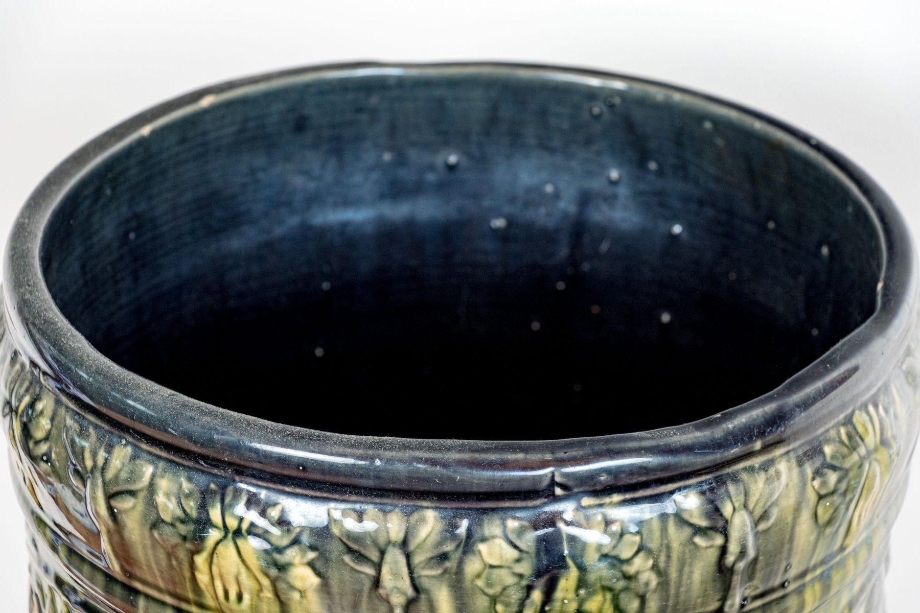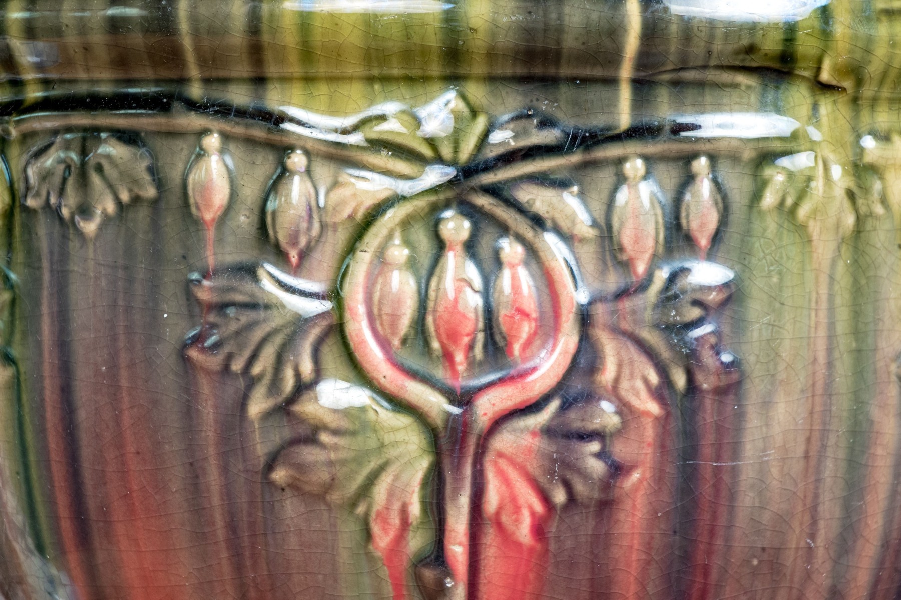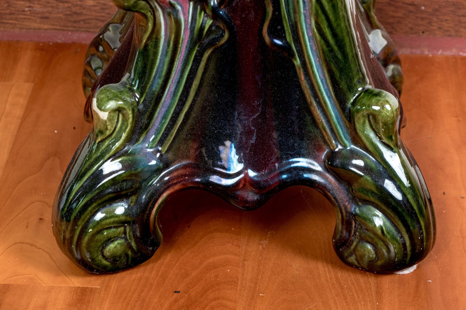 A gorgeous American ceramic jardiniere on a pedestal in elegant Art Nouveau style. The jardiniere features a gently curved and tapered cylindrical form with a flared circular foot, glazed in fabulous streaky green and pinkish-red over pretty foliate relief. The jardiniere is set atop a matching pedestal with a scalloped and bulbous capital tapering down the column to a base of four scrolled feet with a figural bust and pretty floral accents throughout the tree trunk-like design.