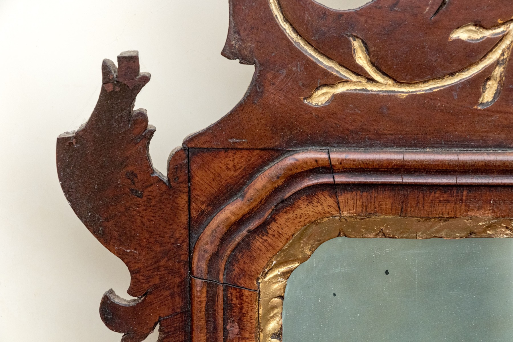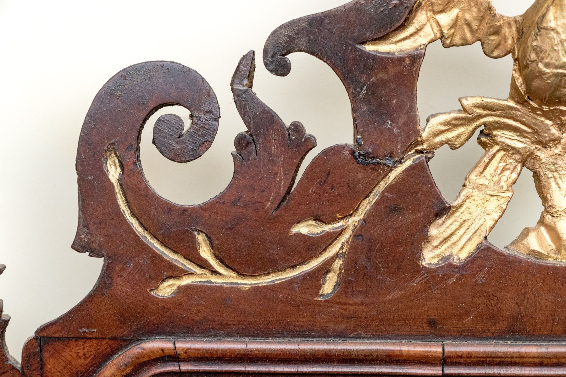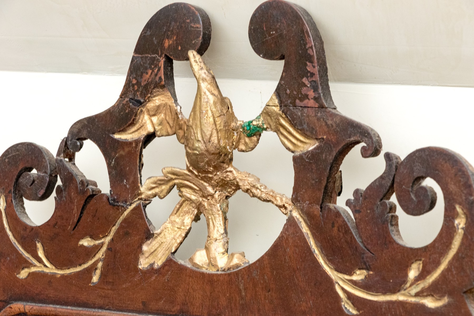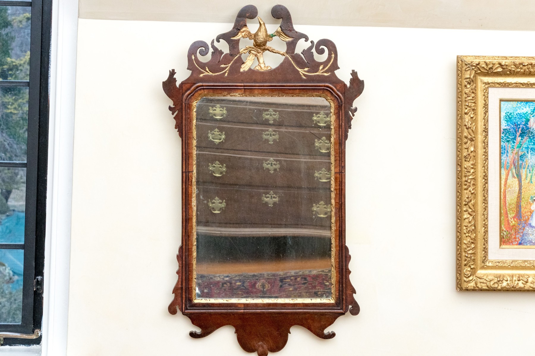A gorgeous Chippendale looking glass with a rectangular mirror sporting cut upper corners with a rustic gilt bevel in a beautiful red-brown mahogany frame with an ogee edge. The frame is surrounded by ornate scrolled and flourished carved decoration, featuring a gilt eagle with splayed wings perched on a vine at the center of a scrolled pediment.
