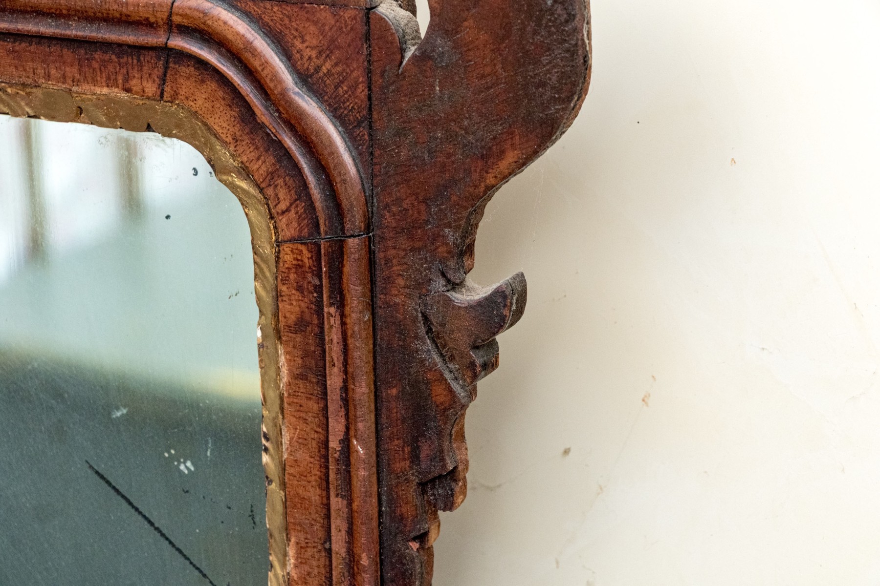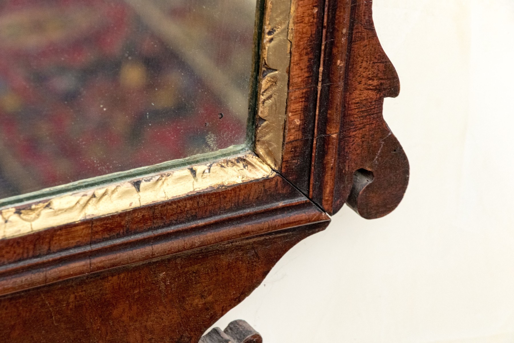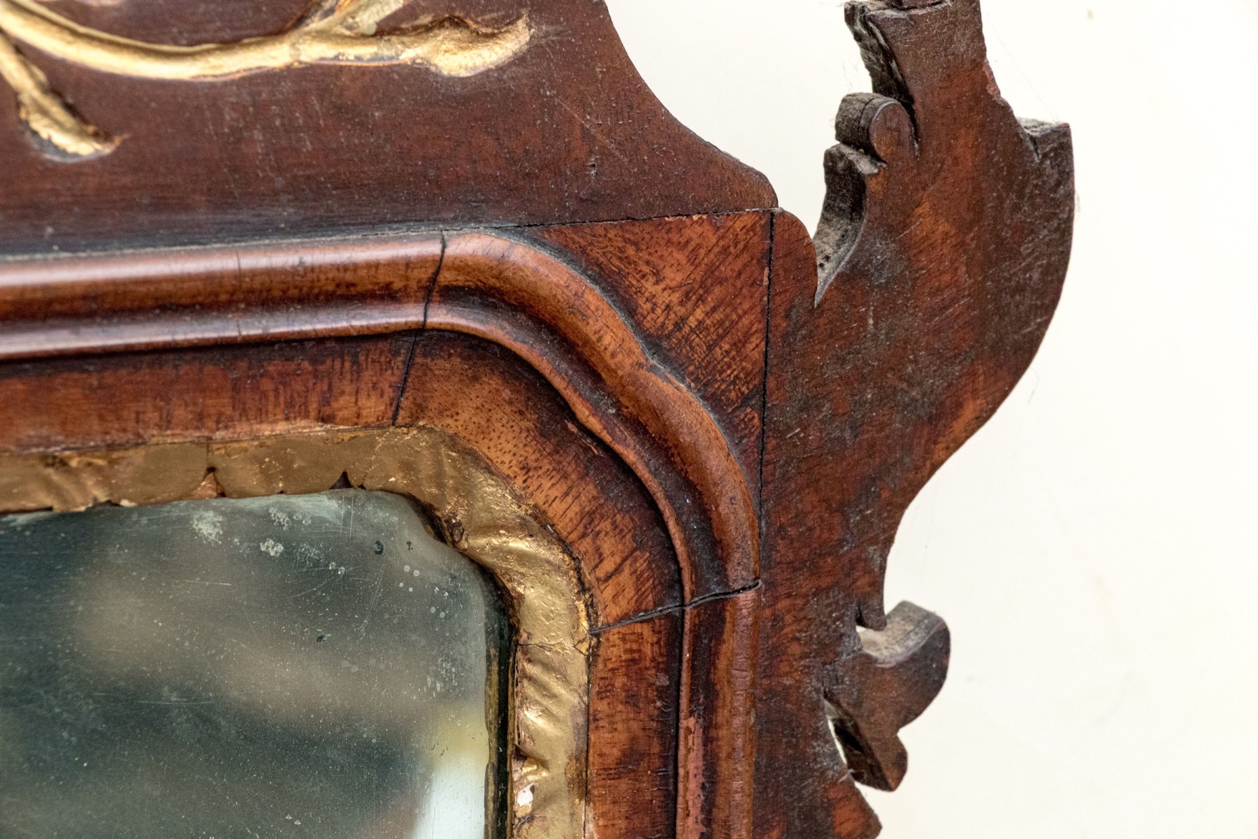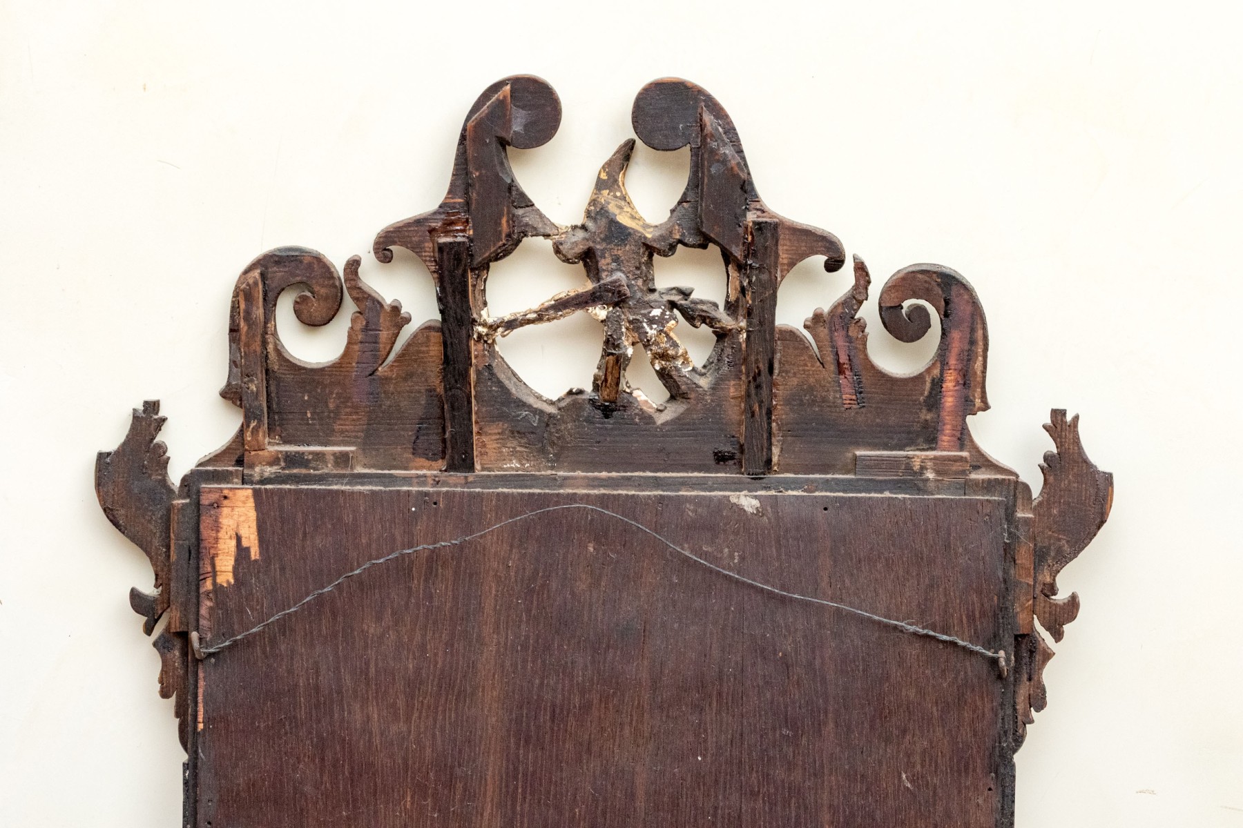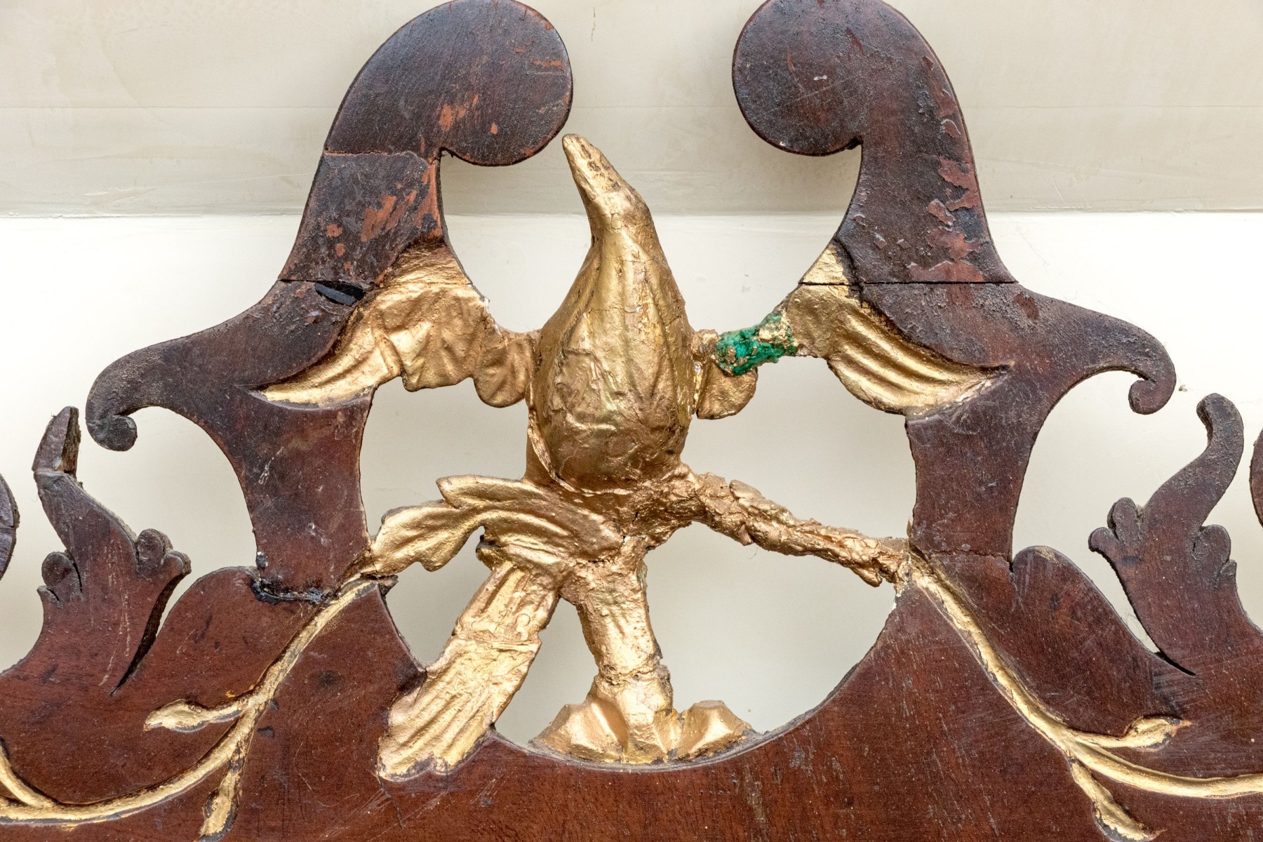 A gorgeous Chippendale looking glass with a rectangular mirror sporting cut upper corners with a rustic gilt bevel in a beautiful red-brown mahogany frame with an ogee edge. The frame is surrounded by ornate scrolled and flourished carved decoration, featuring a gilt eagle with splayed wings perched on a vine at the center of a scrolled pediment.