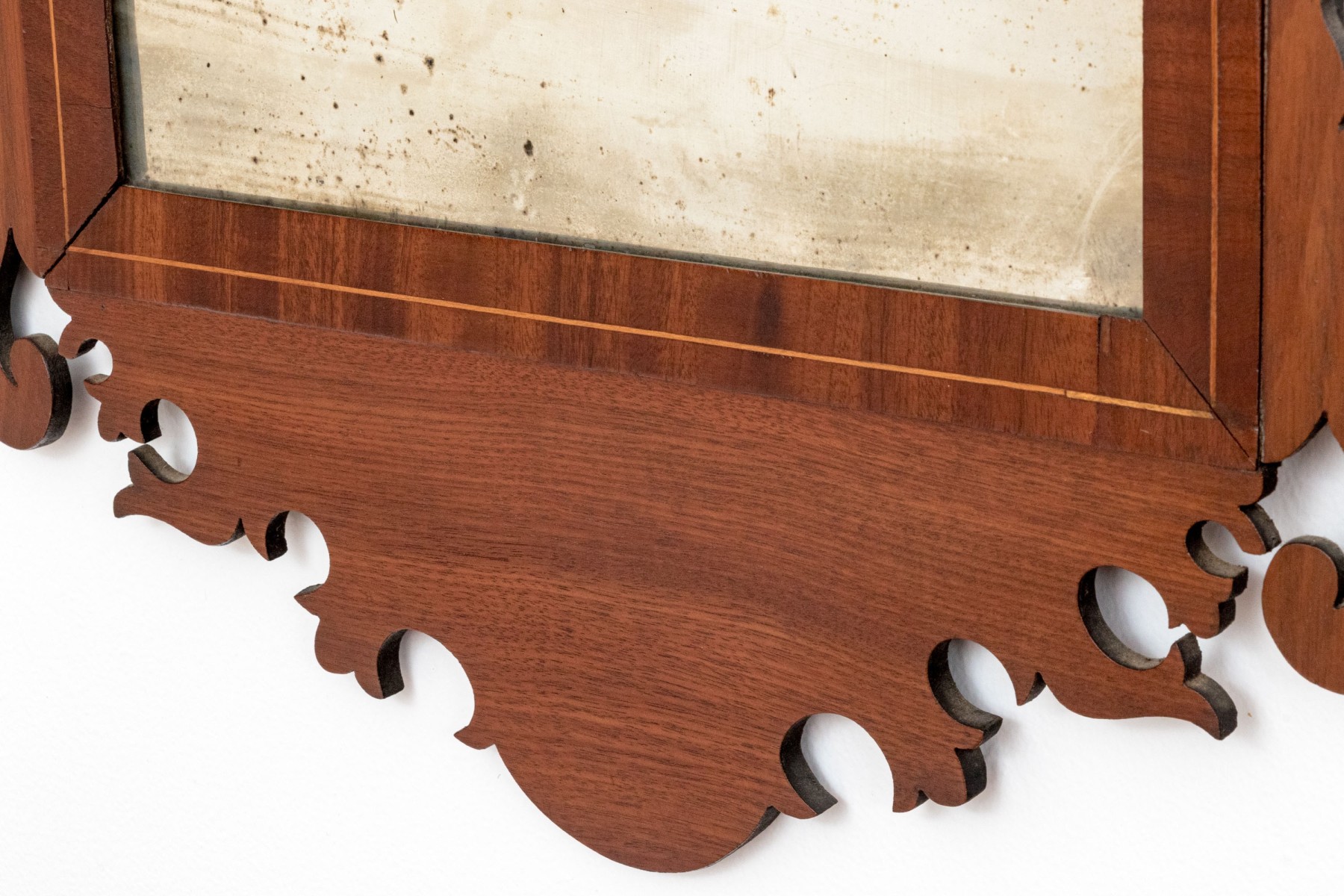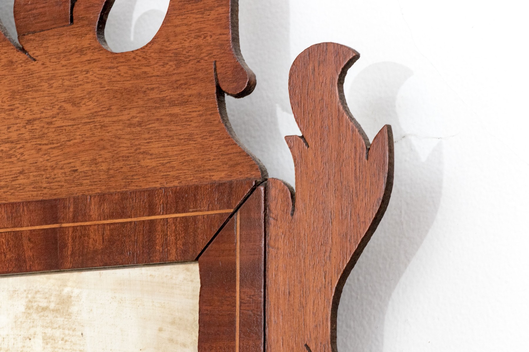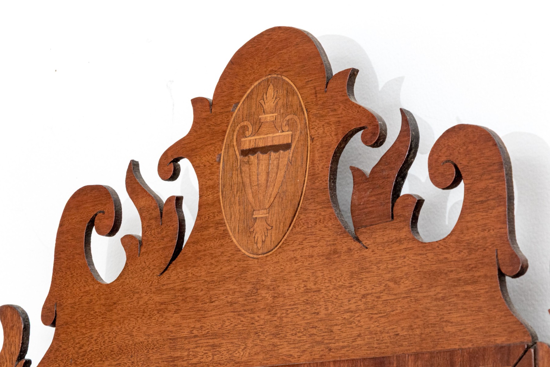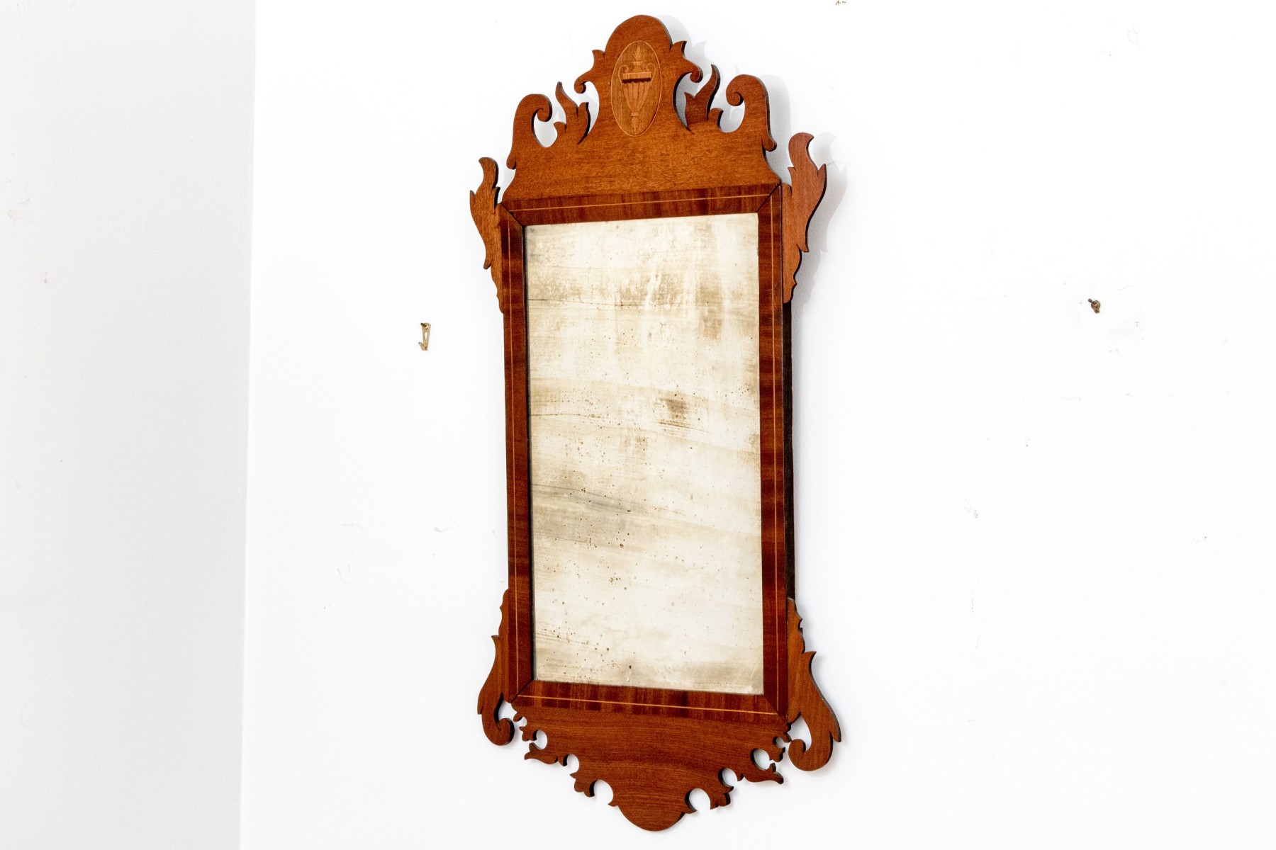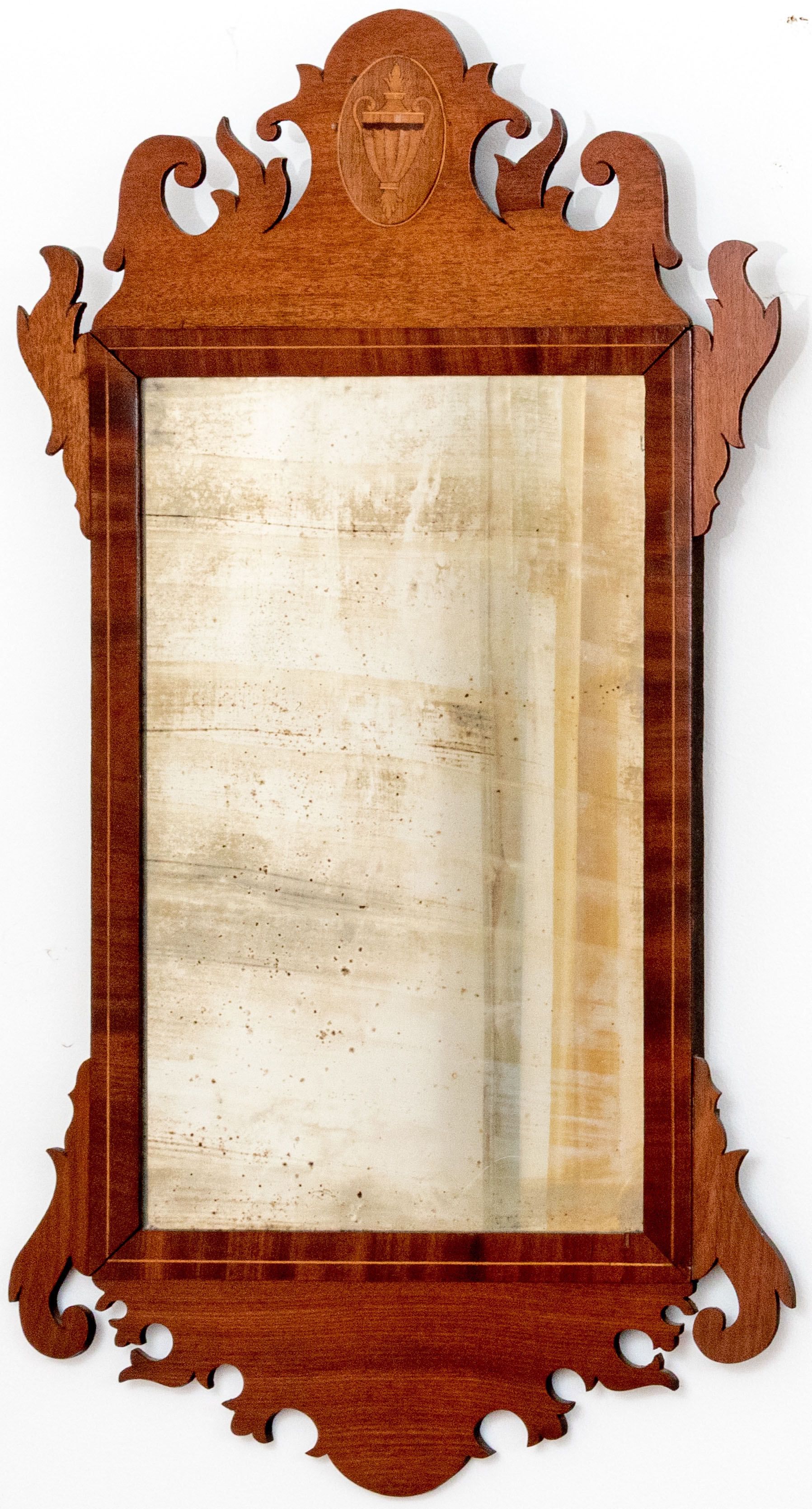 A finely figured mahogany Chippendale mirror showcasing a rectangular center in a rich deep brown mahogany frame with a shoestring inlaid border. The top and bottom of the frame are decorated with shapely scrolls and foliate flourishes, finishing with an oval marquetry medallion of an urn at the center top.
