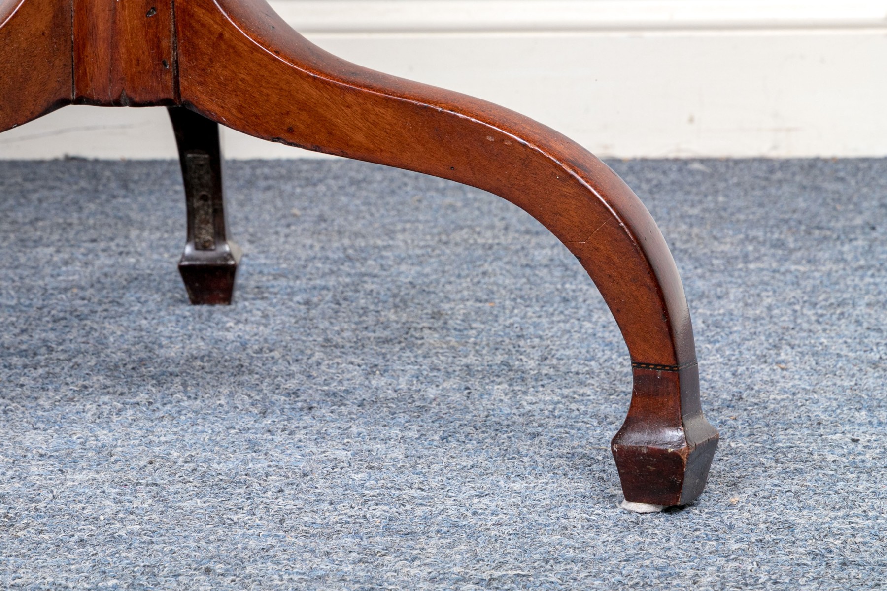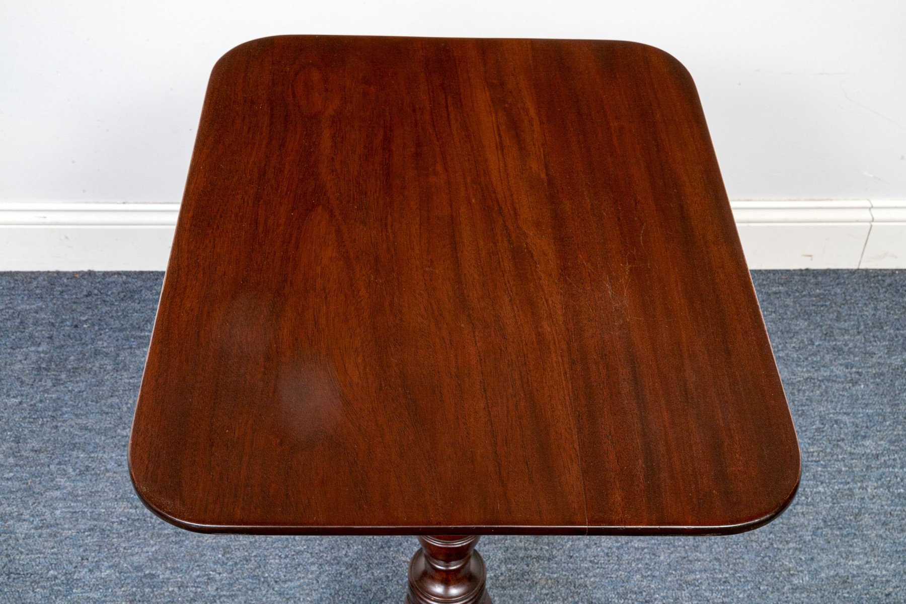 On three carved legs with a central turned baluster form pedestal with hinged, rectangular flip top.