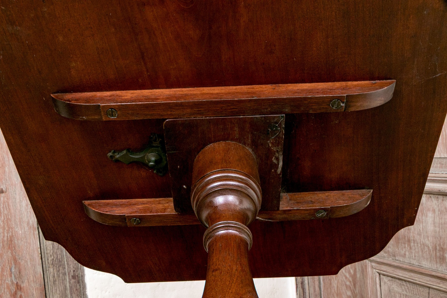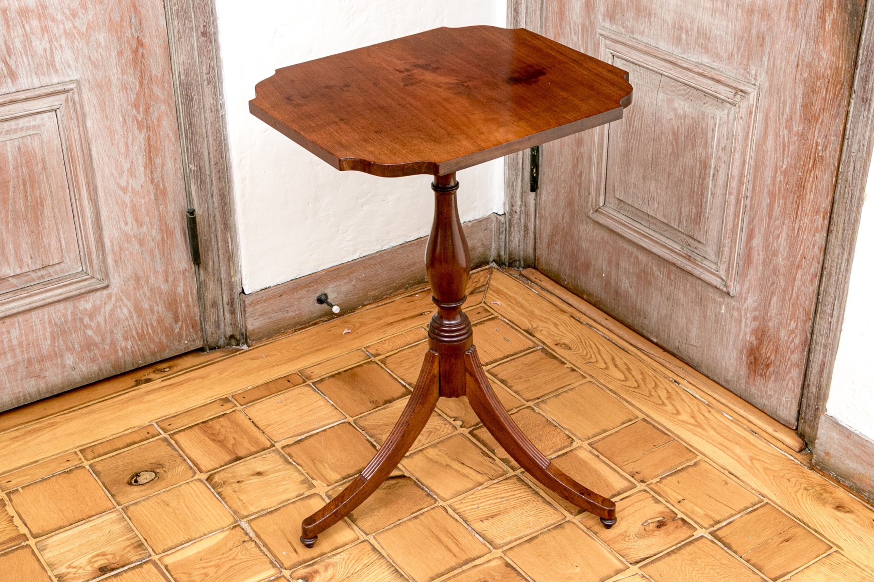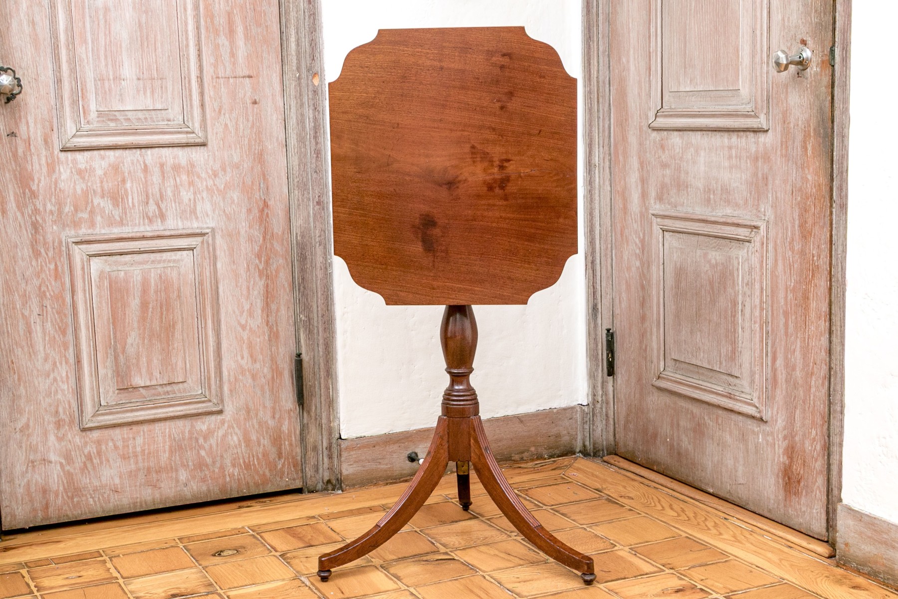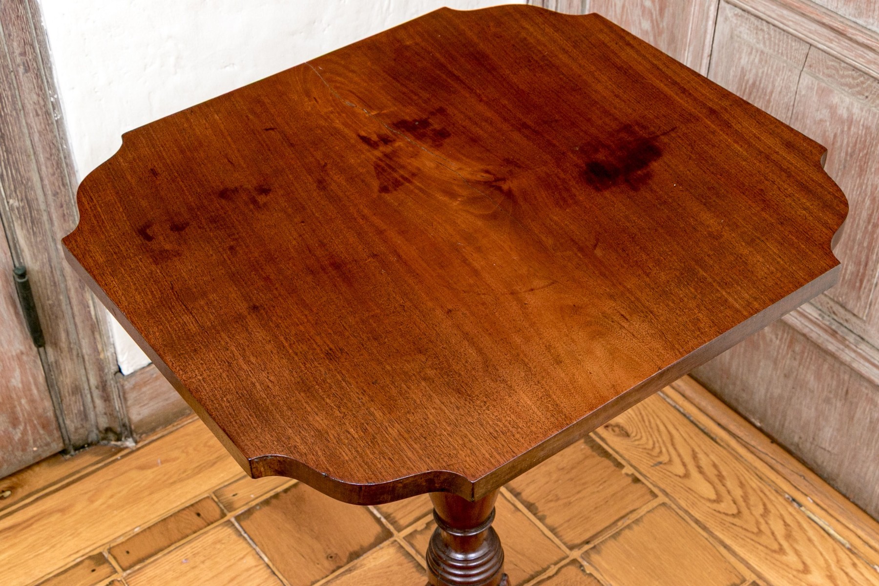 A nicely aged American Federal tilt top table in rich, warm-toned brown mahogany. The rectangular top is beautifully shaped with scalloped corners and is supported by a nicely turned baluster column over a tripod of swooping, curved legs with reeded texture and dainty bun feet.