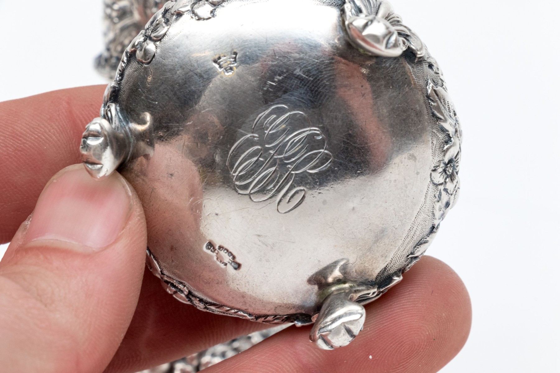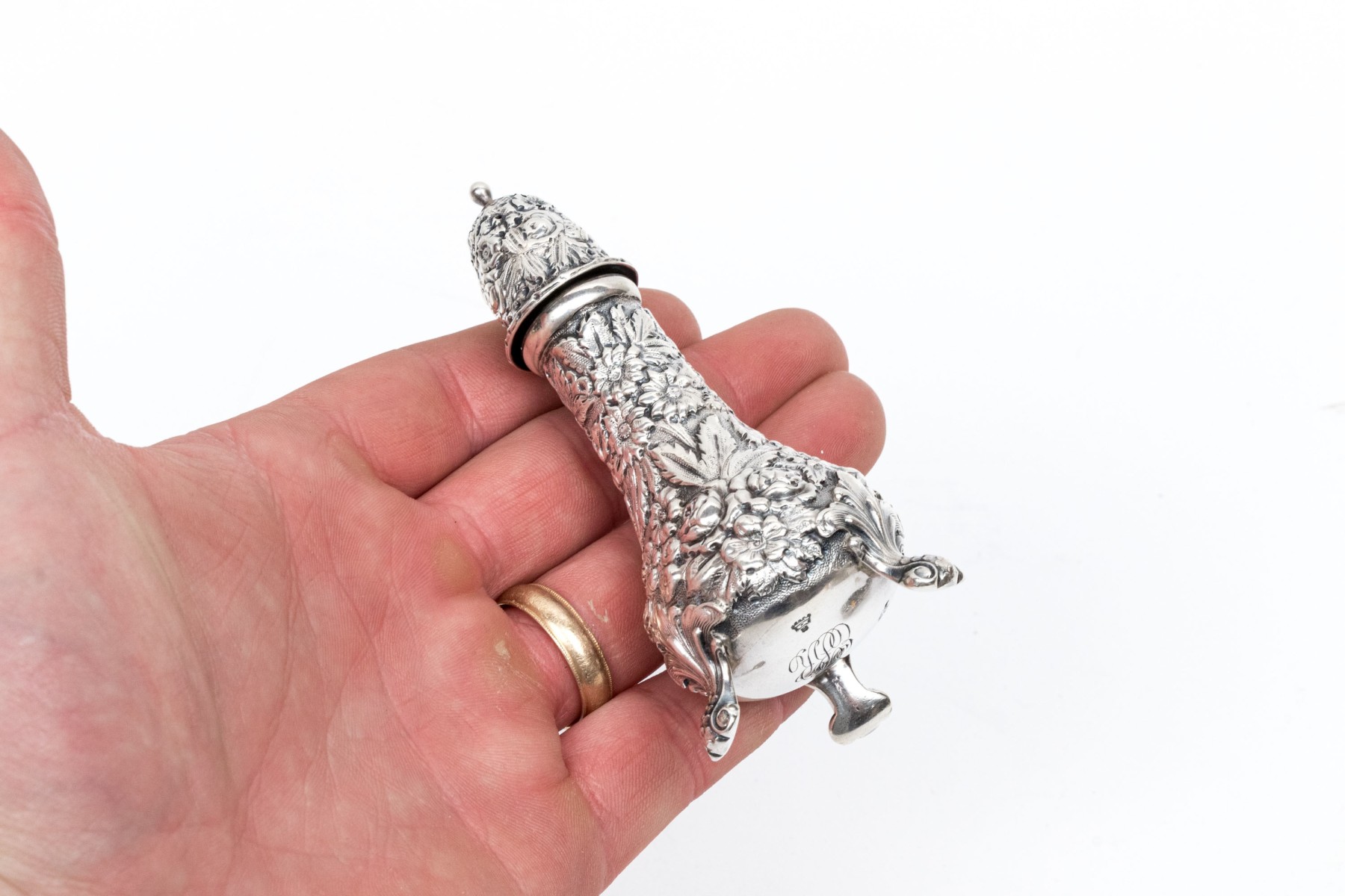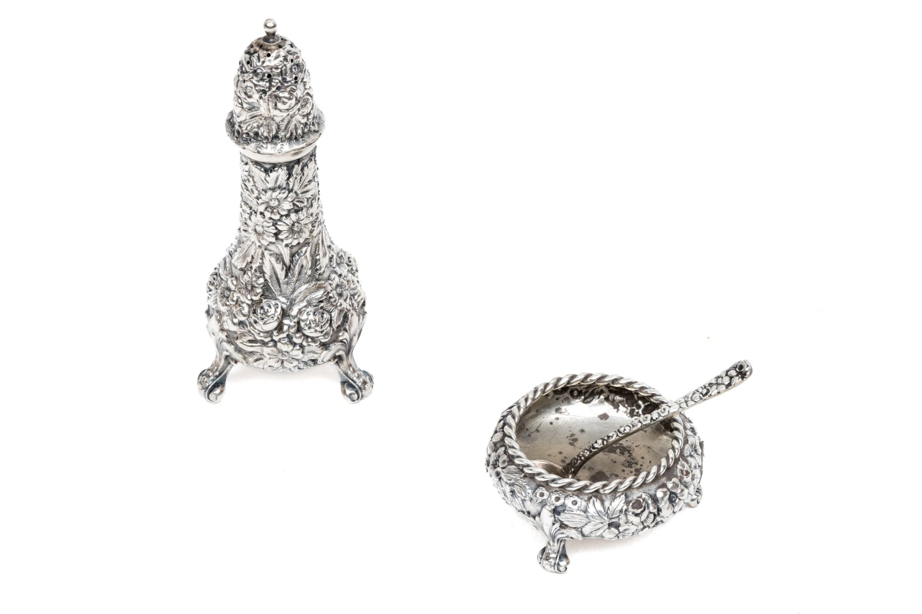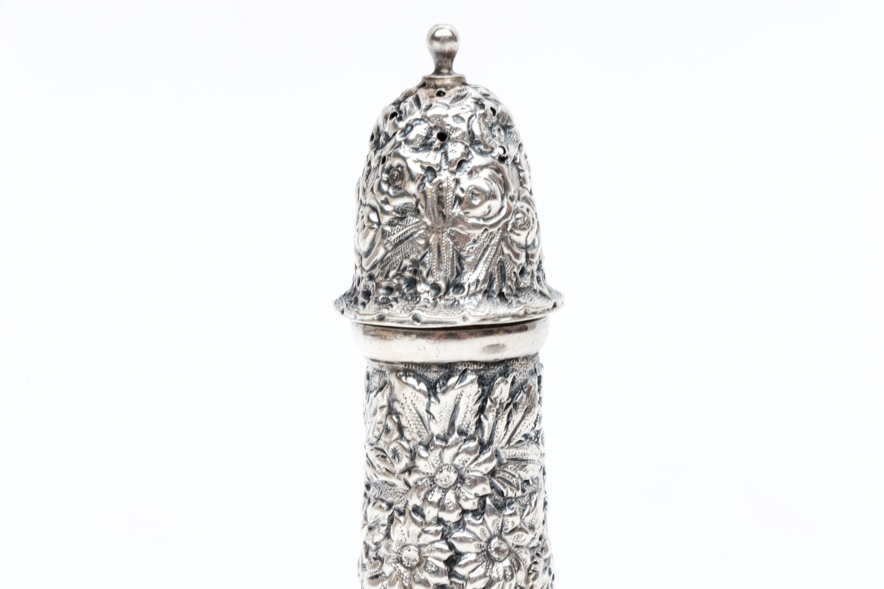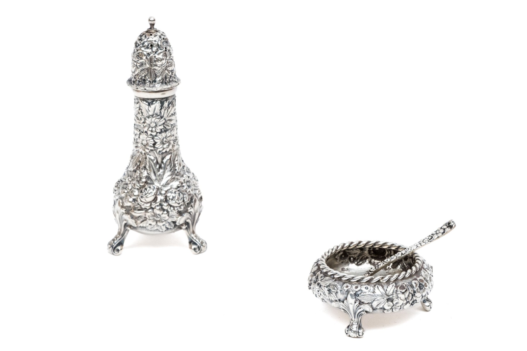 Comprised of a fabulously ornate footed caster with pierced lid. Together with a footed open salt cellar with salt spoon.