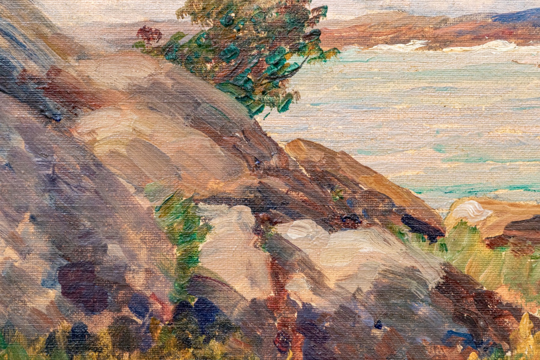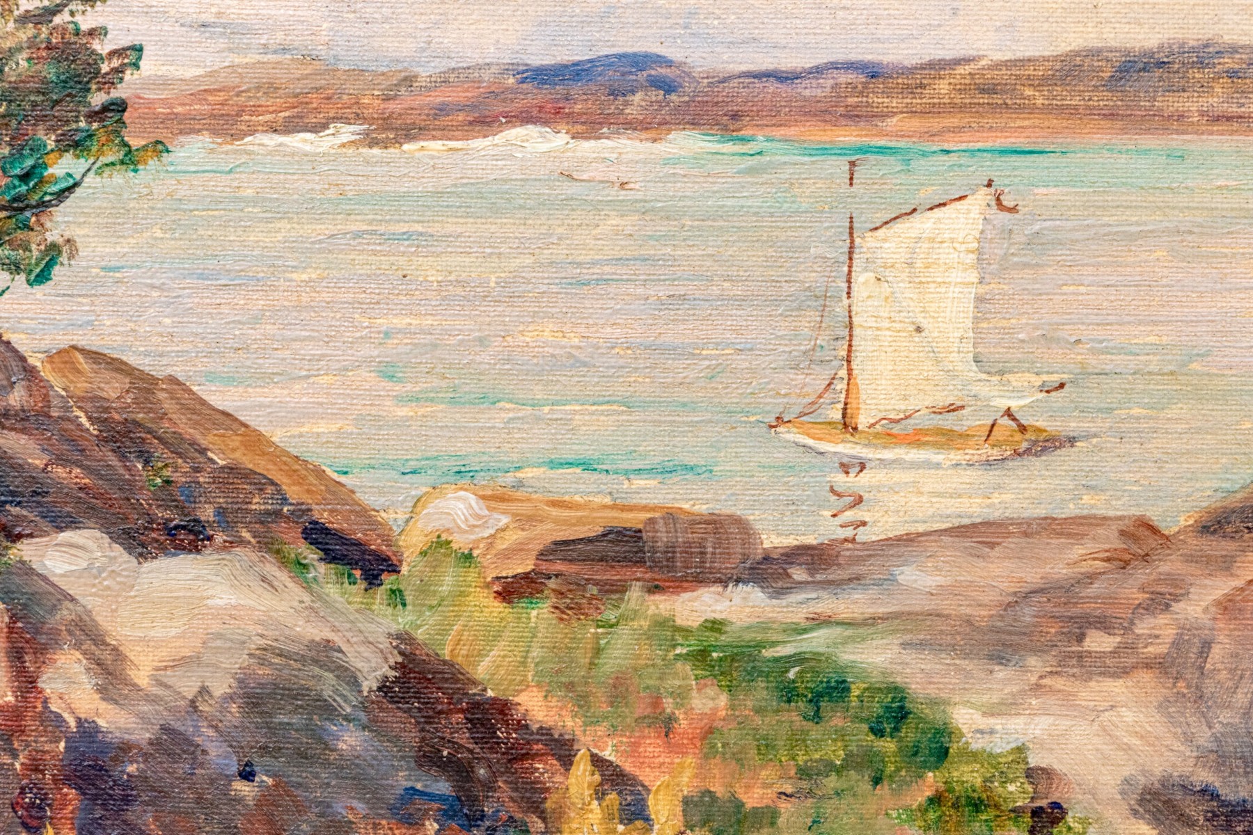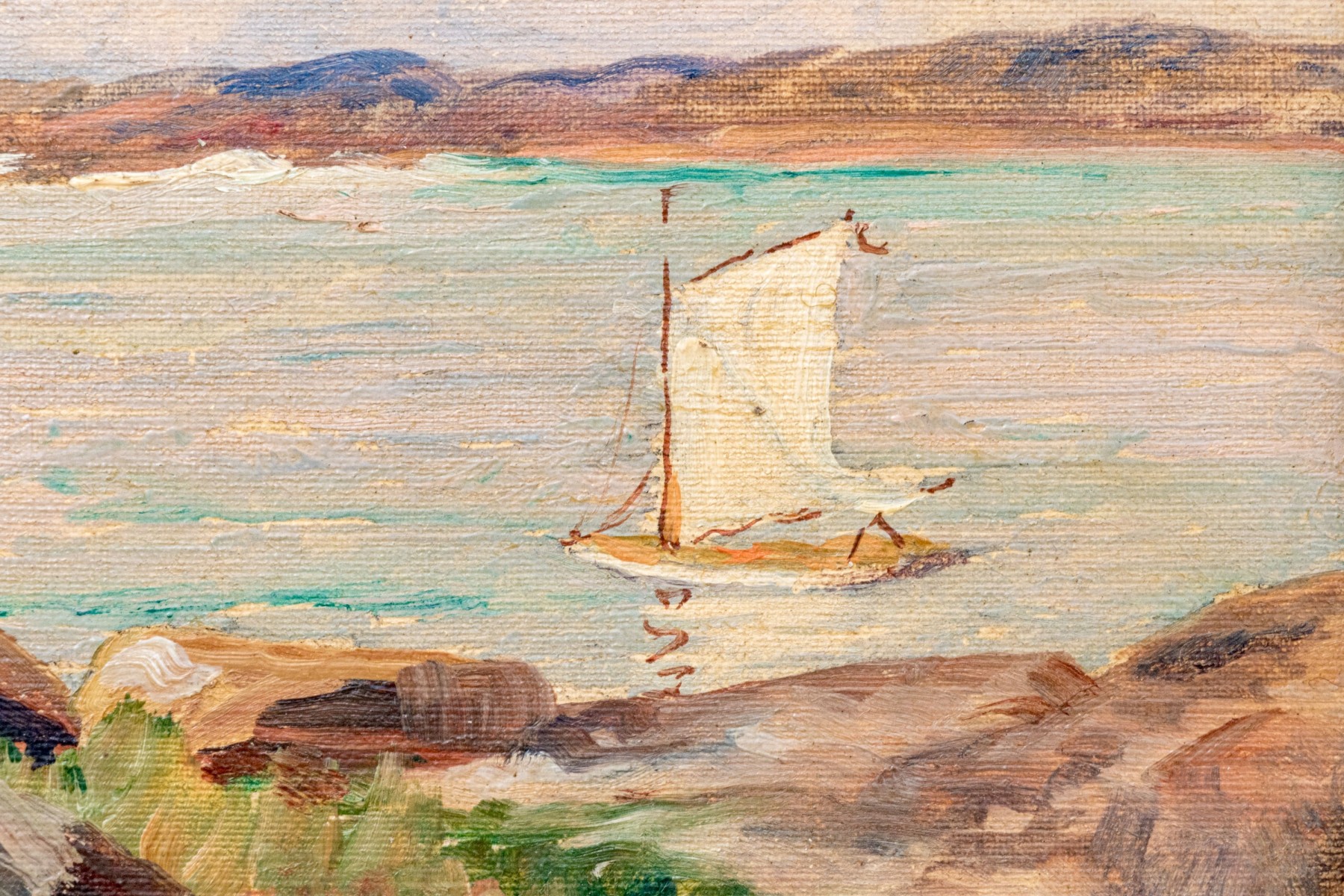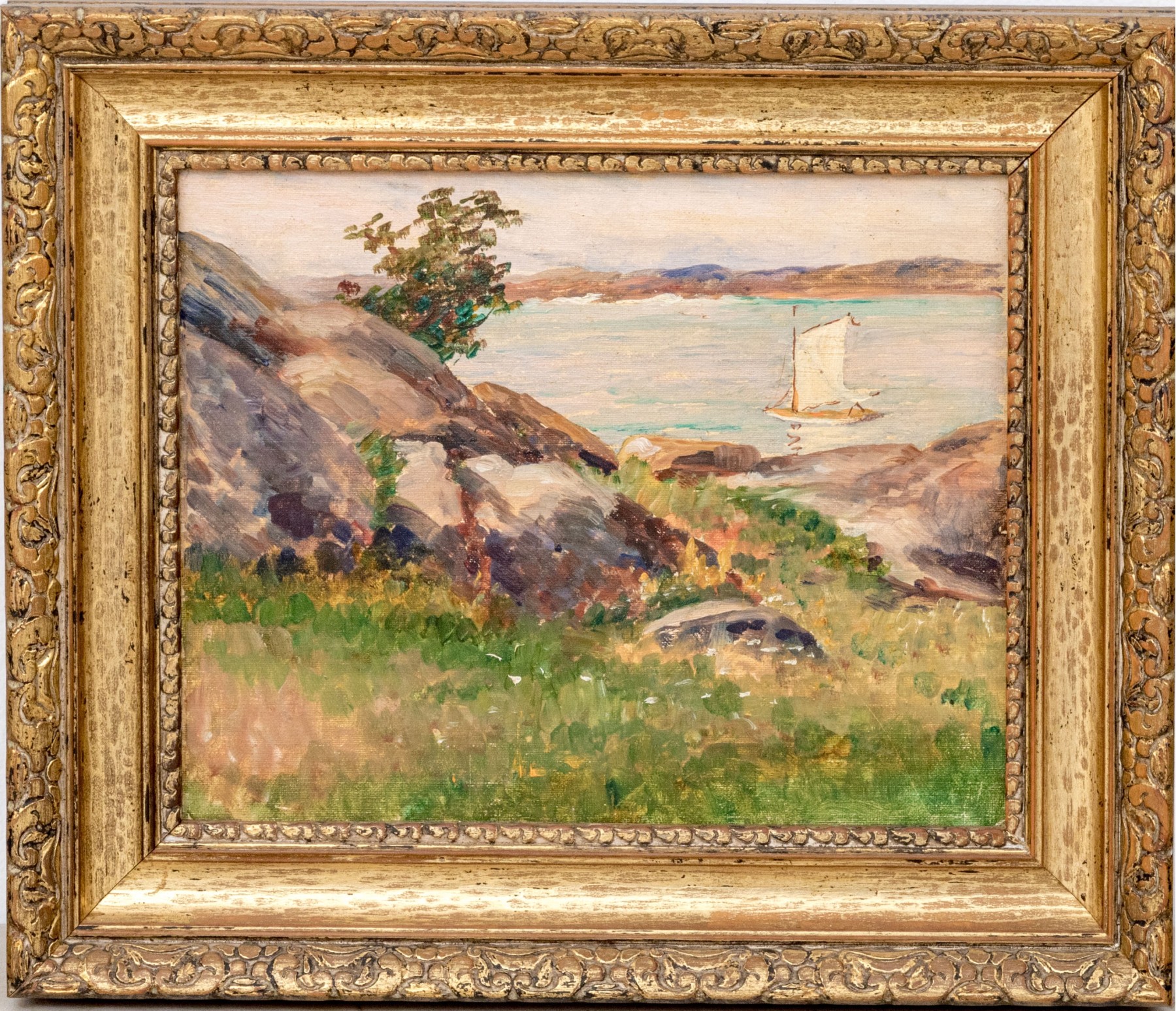 A wonderful oil painting on board depicting a landscape with a grassy, rocky field leading to a view of a lone sailboat on calm pale blue water. Appears to be unsigned.
