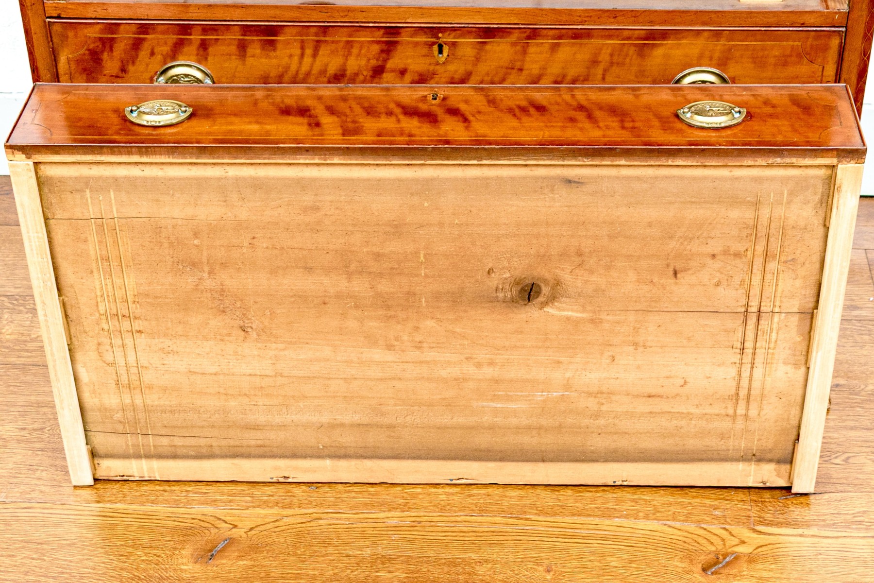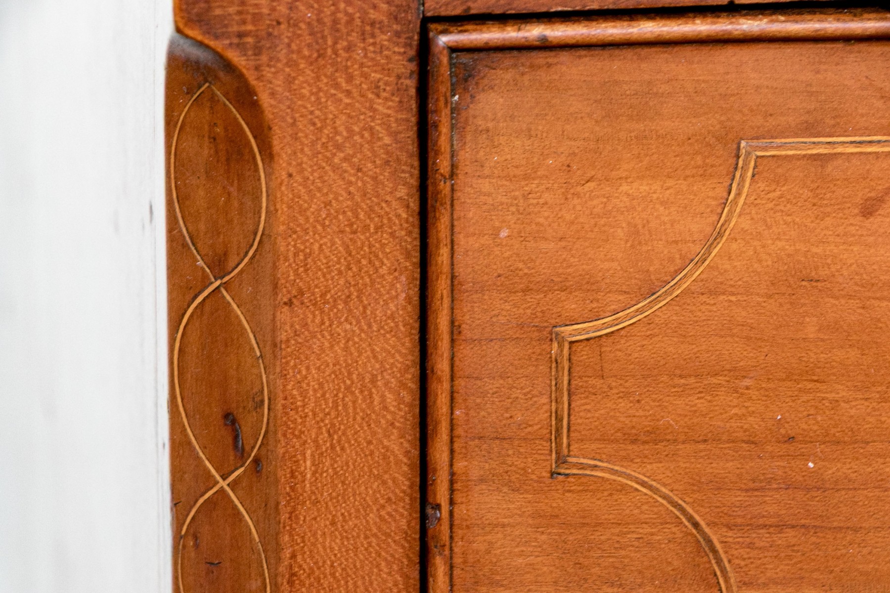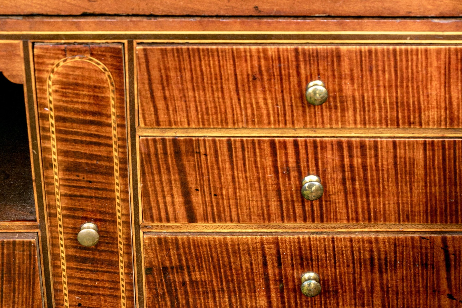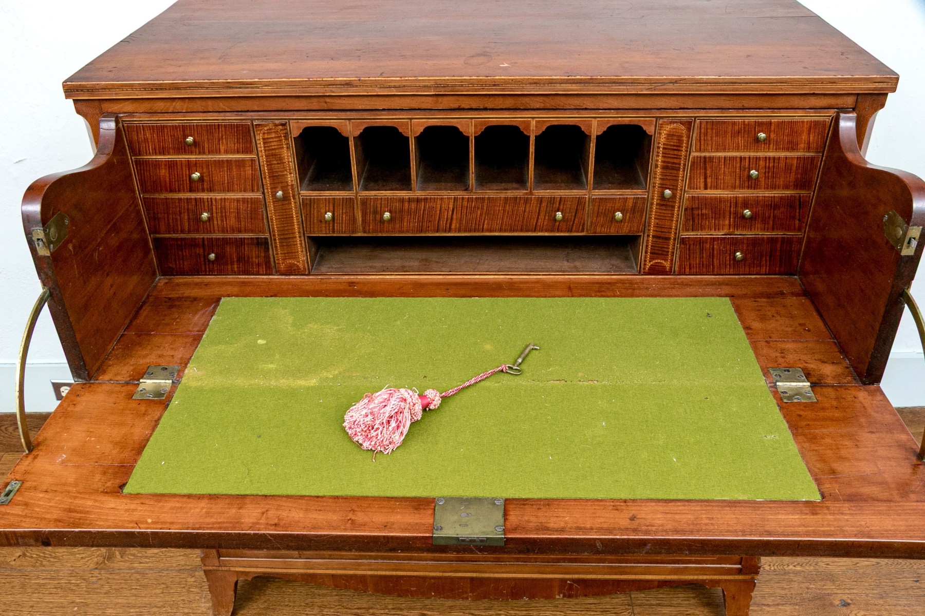 A gorgeous American Federal butler's desk ca. 1800-1820, probably Mid-Atlantic states. The desk is well crafted with gorgeous honeyed brown veneers and contrasting inlaid borders. Sporting a deep rectangular case, the desk's hinged drop front features a facade of drawers opening to a green felt inlaid writing surface and a hutch of cubbies and small drawers for stationary storage. Below, drawers are adorned with brass bail handles on oval plaques. Finished with a rounded apron and stout, flared feet.
