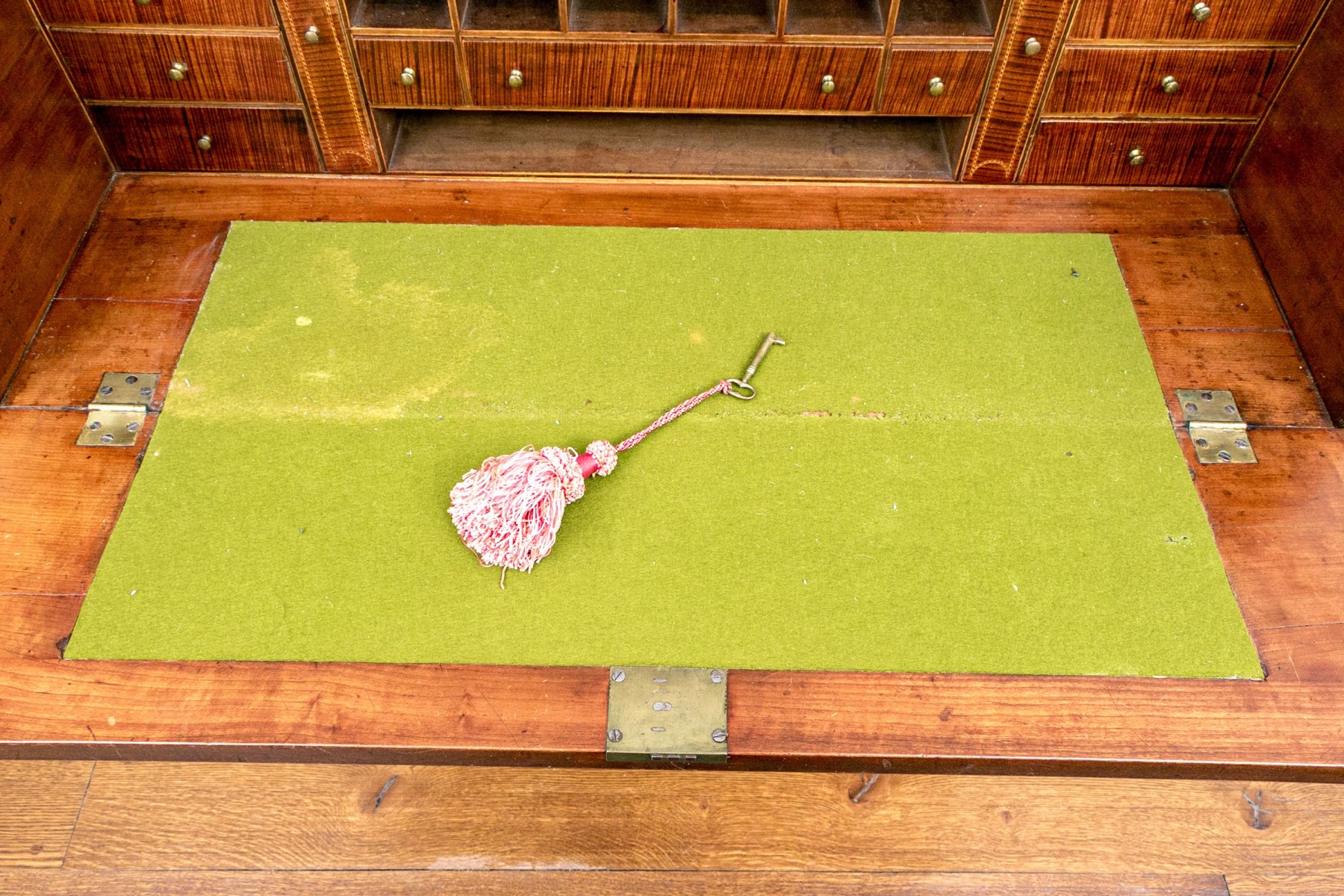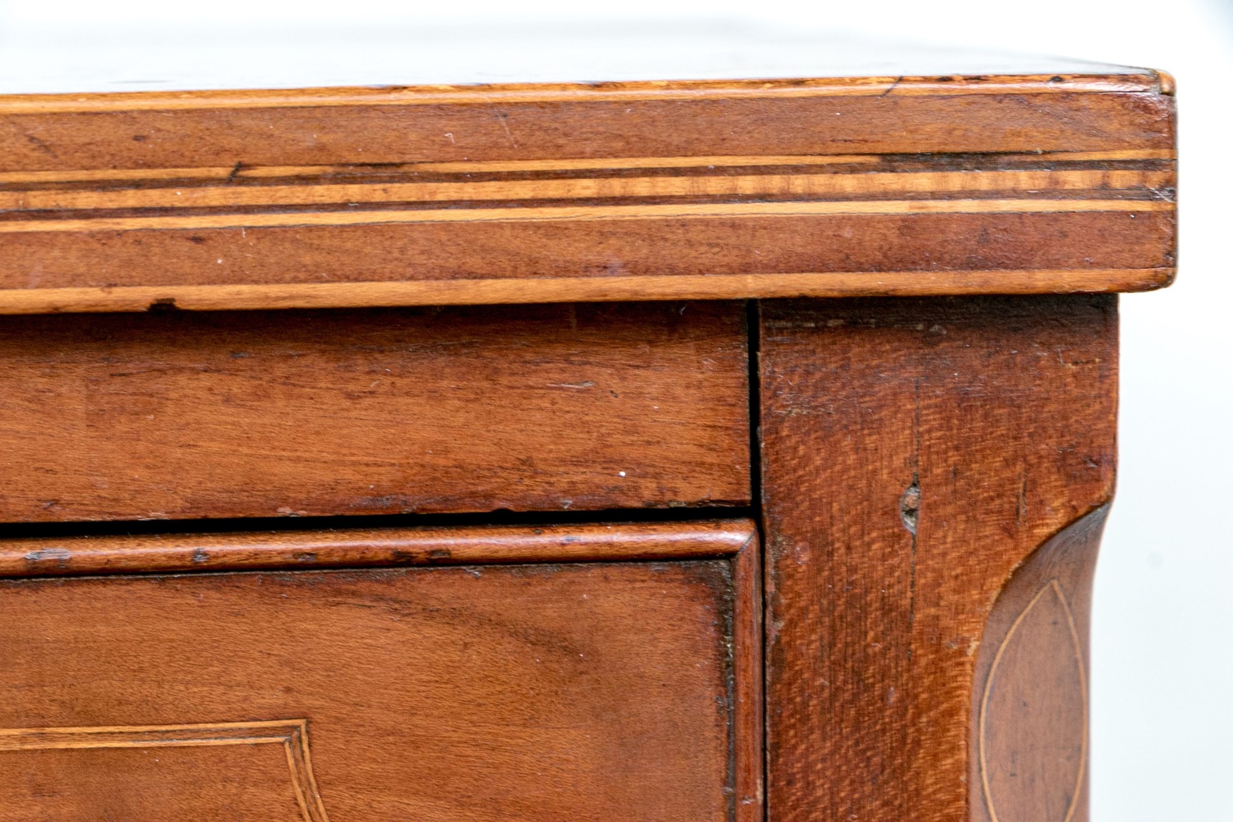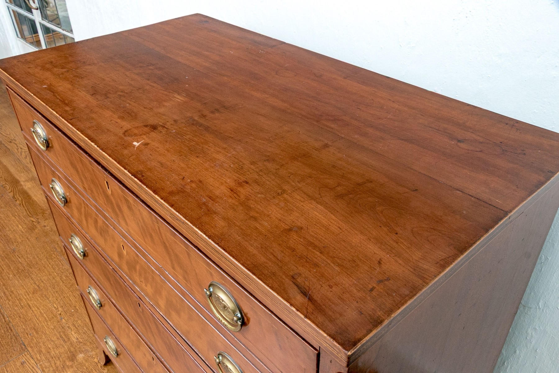 A gorgeous American Federal butler's desk ca. 1800-1820, probably Mid-Atlantic states. The desk is well crafted with gorgeous honeyed brown veneers and contrasting inlaid borders. Sporting a deep rectangular case, the desk's hinged drop front features a facade of drawers opening to a green felt inlaid writing surface and a hutch of cubbies and small drawers for stationary storage. Below, drawers are adorned with brass bail handles on oval plaques. Finished with a rounded apron and stout, flared feet.
