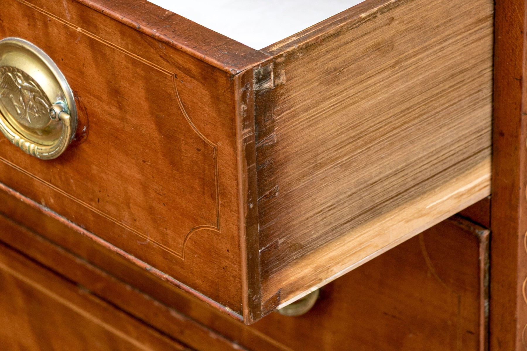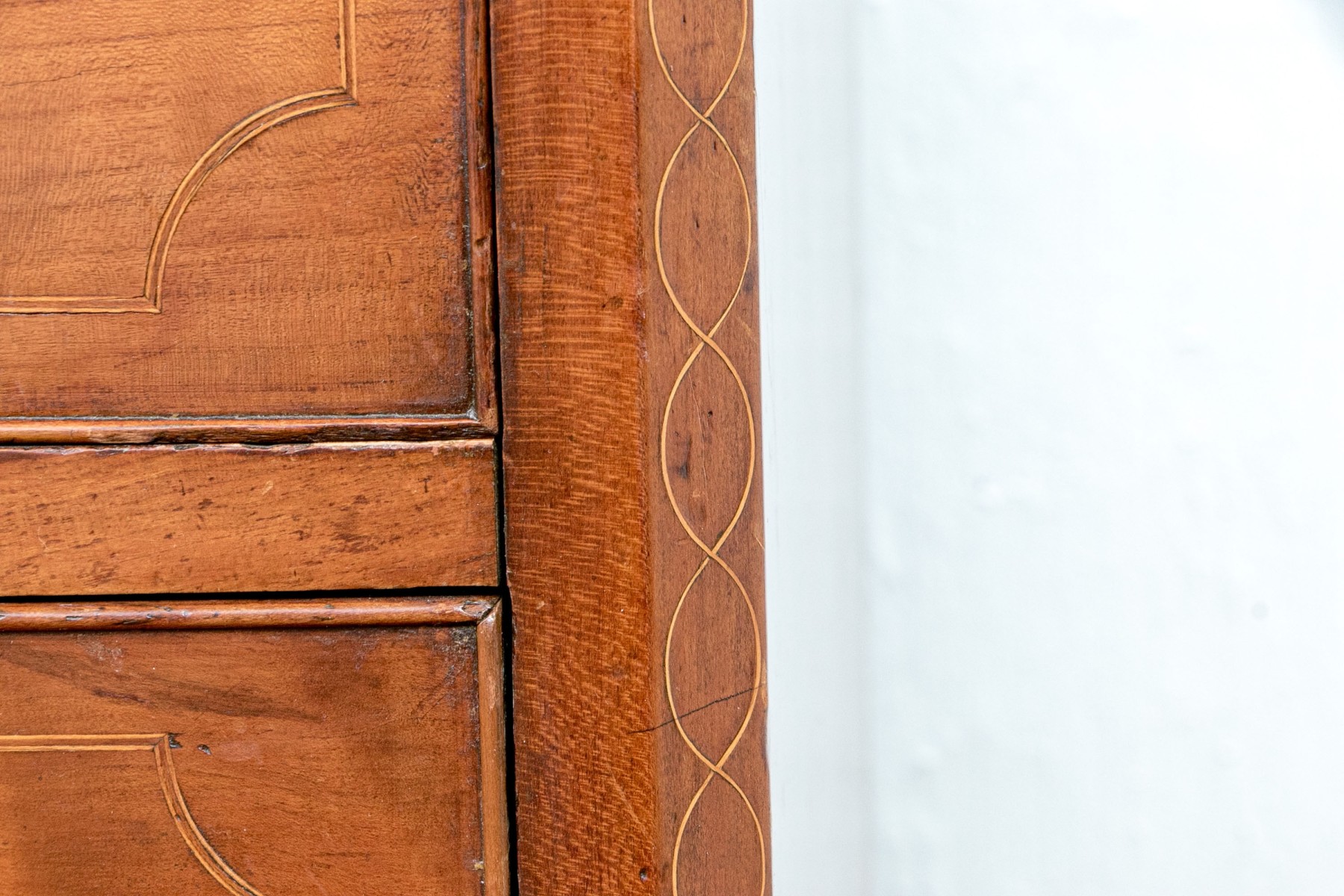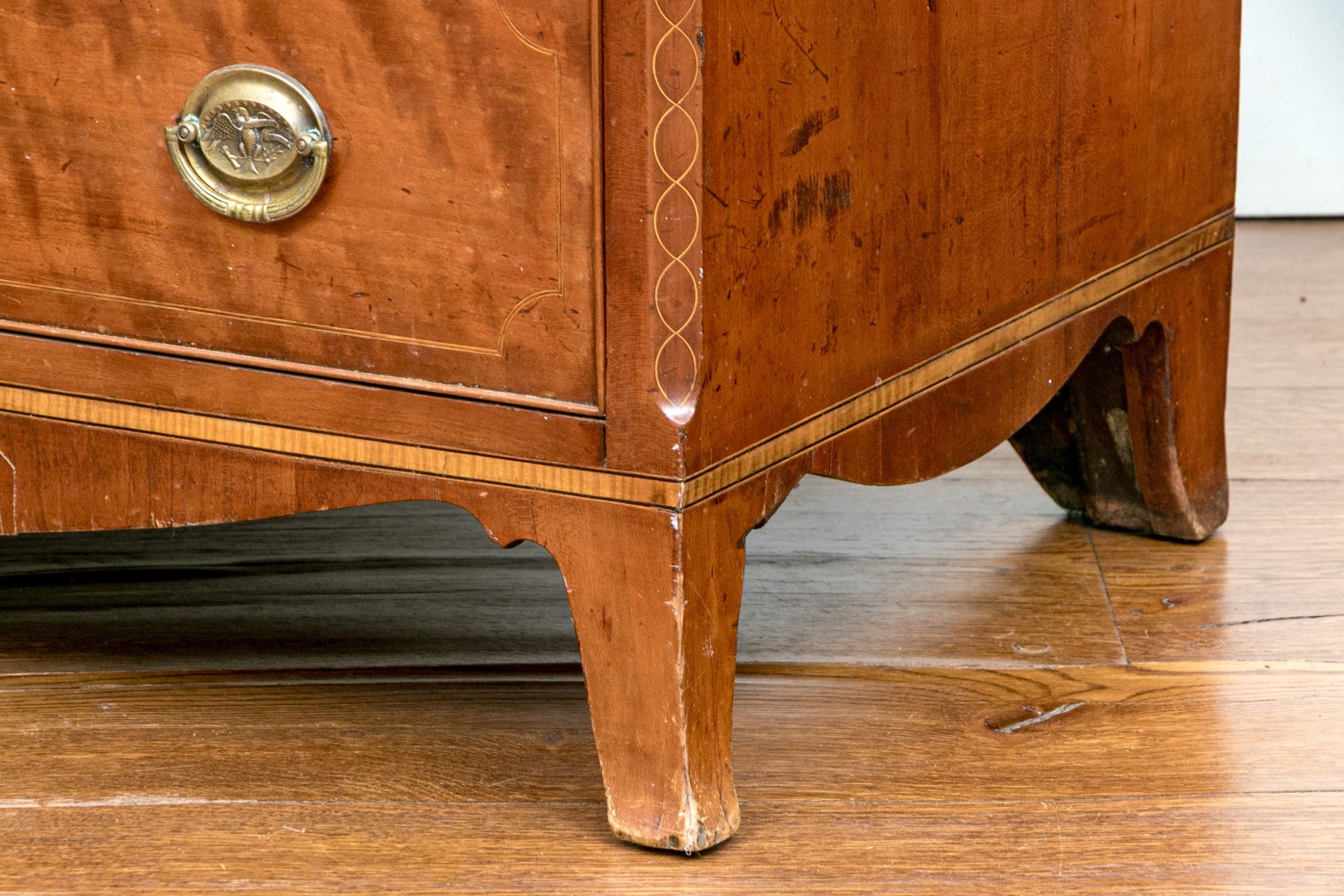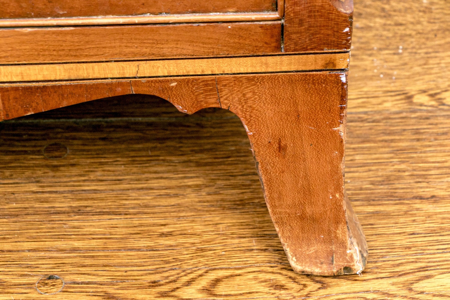 A gorgeous American Federal butler's desk ca. 1800-1820, probably Mid-Atlantic states. The desk is well crafted with gorgeous honeyed brown veneers and contrasting inlaid borders. Sporting a deep rectangular case, the desk's hinged drop front features a facade of drawers opening to a green felt inlaid writing surface and a hutch of cubbies and small drawers for stationary storage. Below, drawers are adorned with brass bail handles on oval plaques. Finished with a rounded apron and stout, flared feet.