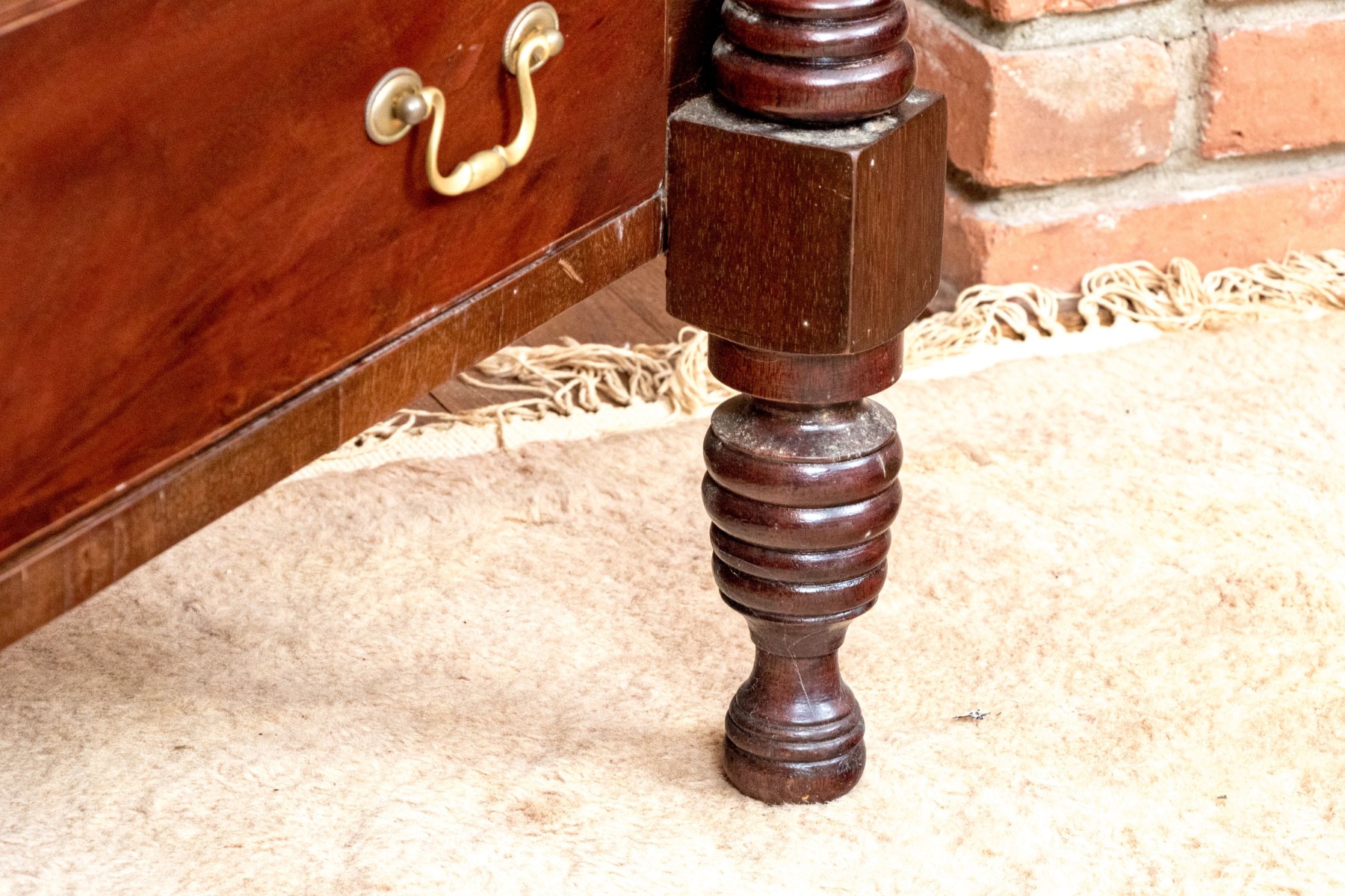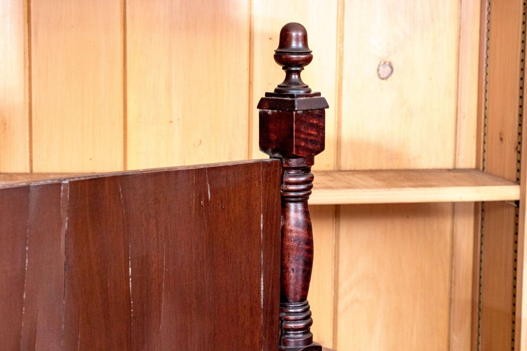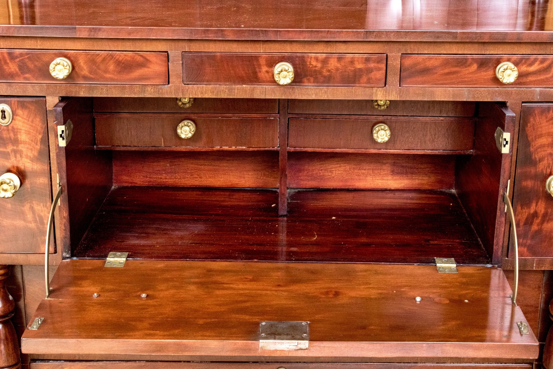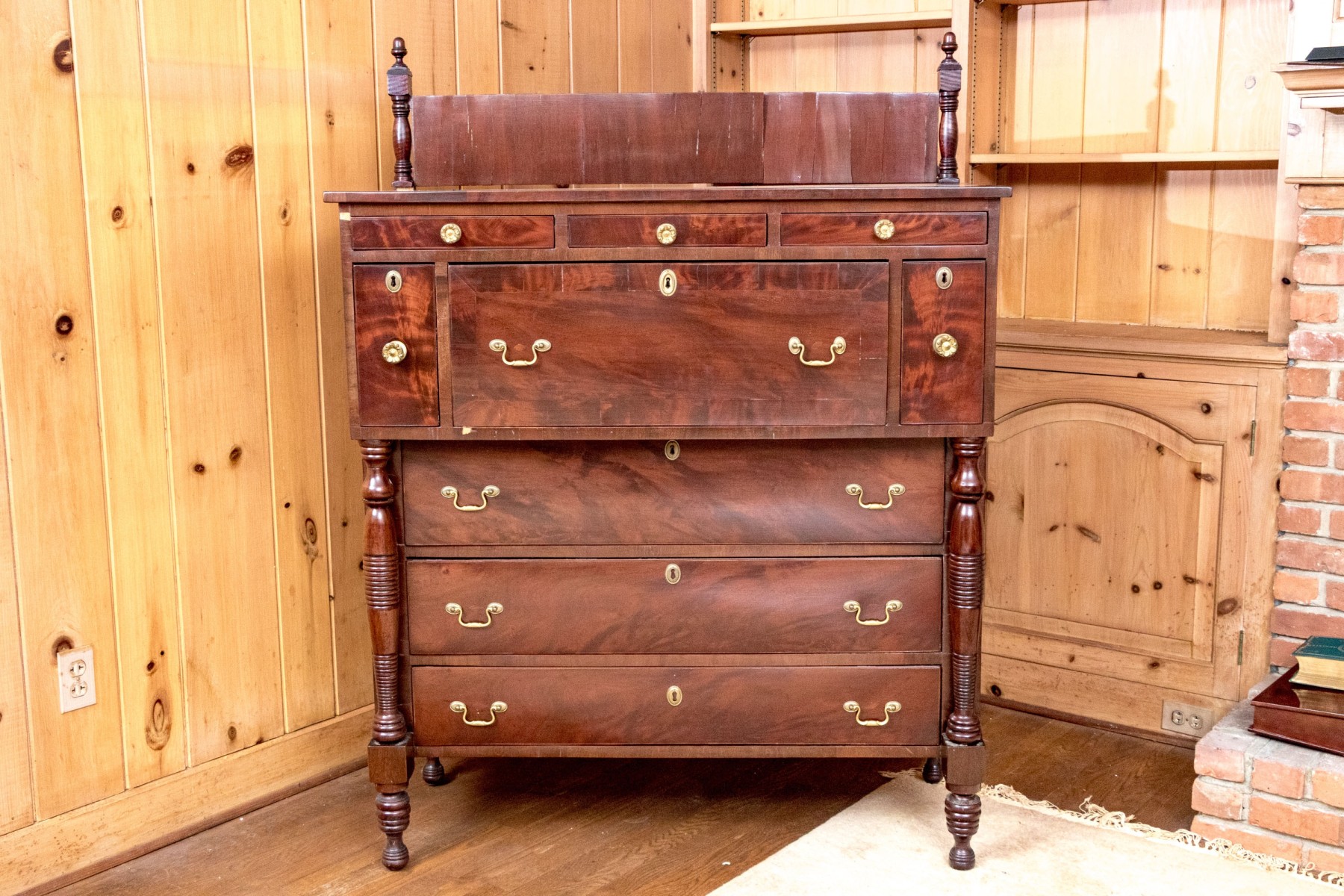 On four turned legs with three long drawers with pair of brass swing handles with key escutcheons. Large drop front writing desk with two drawers on either side with a drawer pull and key escutcheon. Three thin drawers above with brass knob pulls. Top with back gallery and turned pillars with acorn finials on either end.